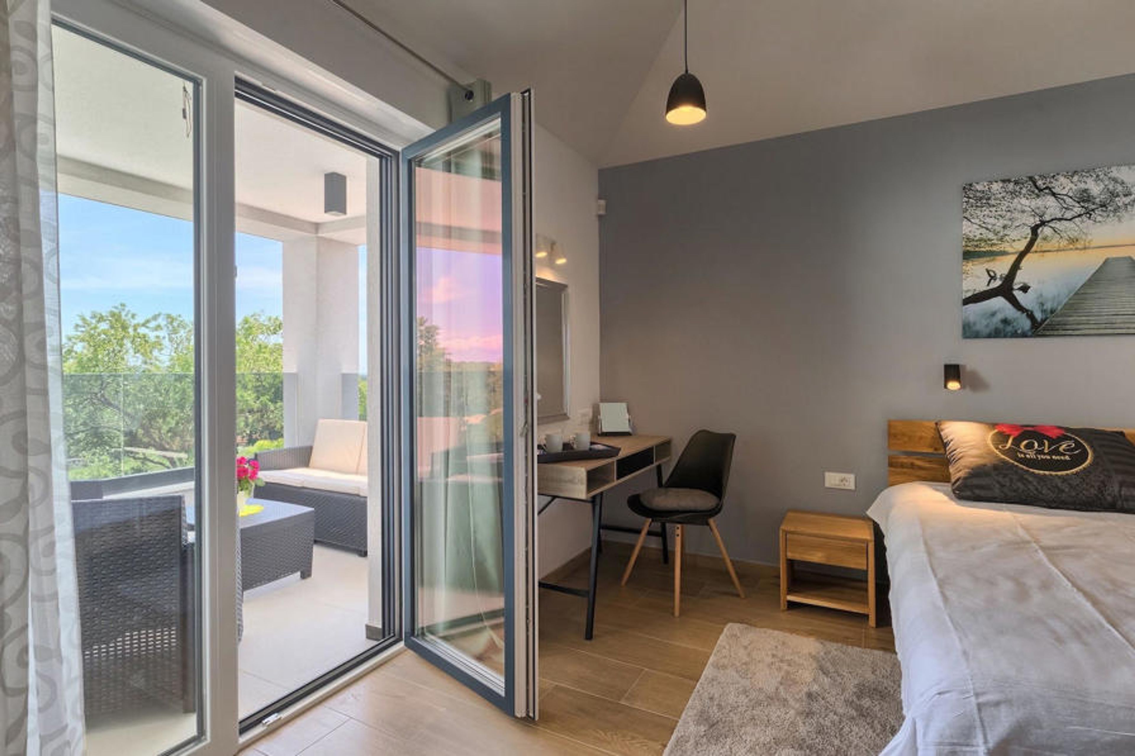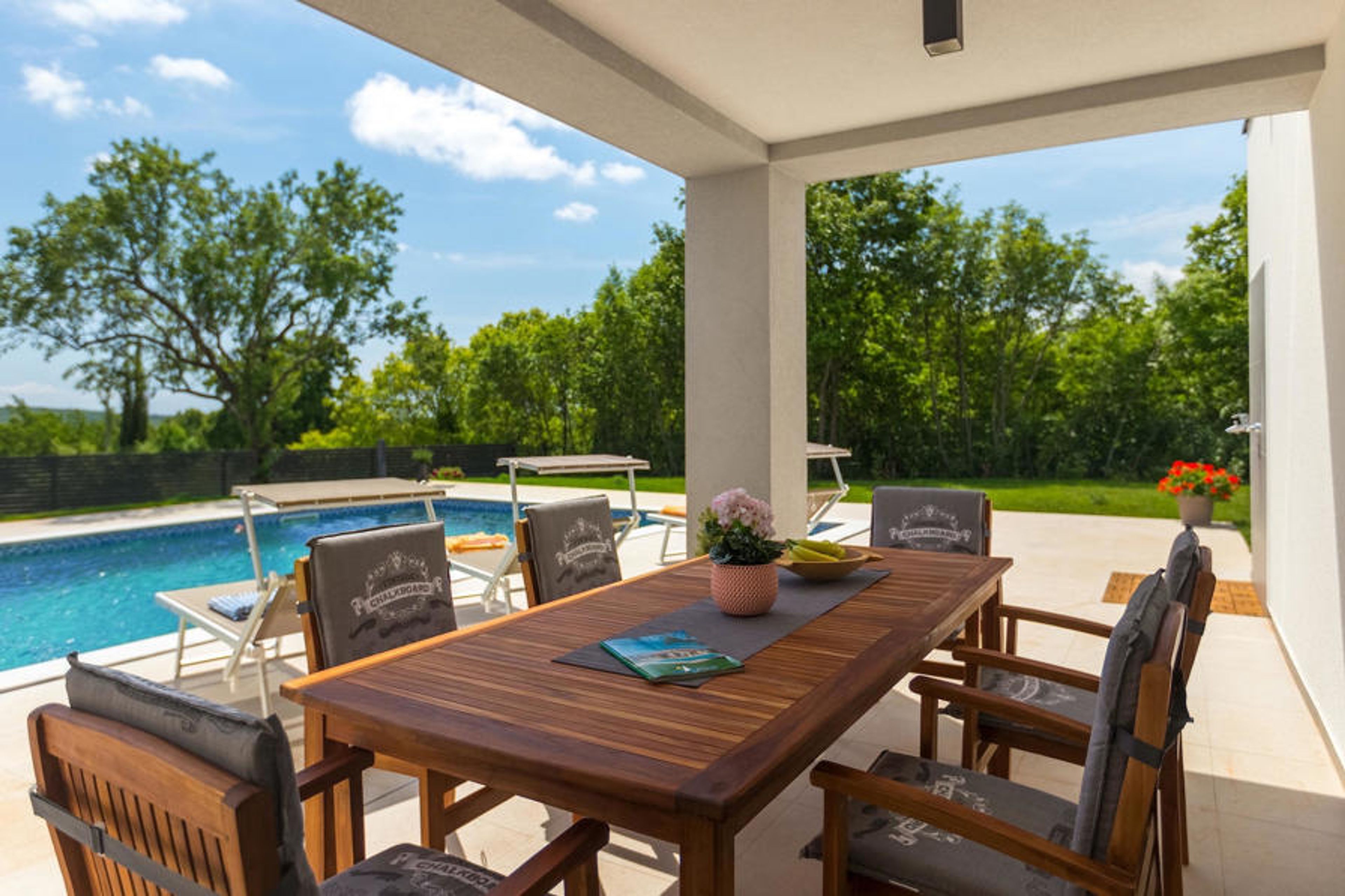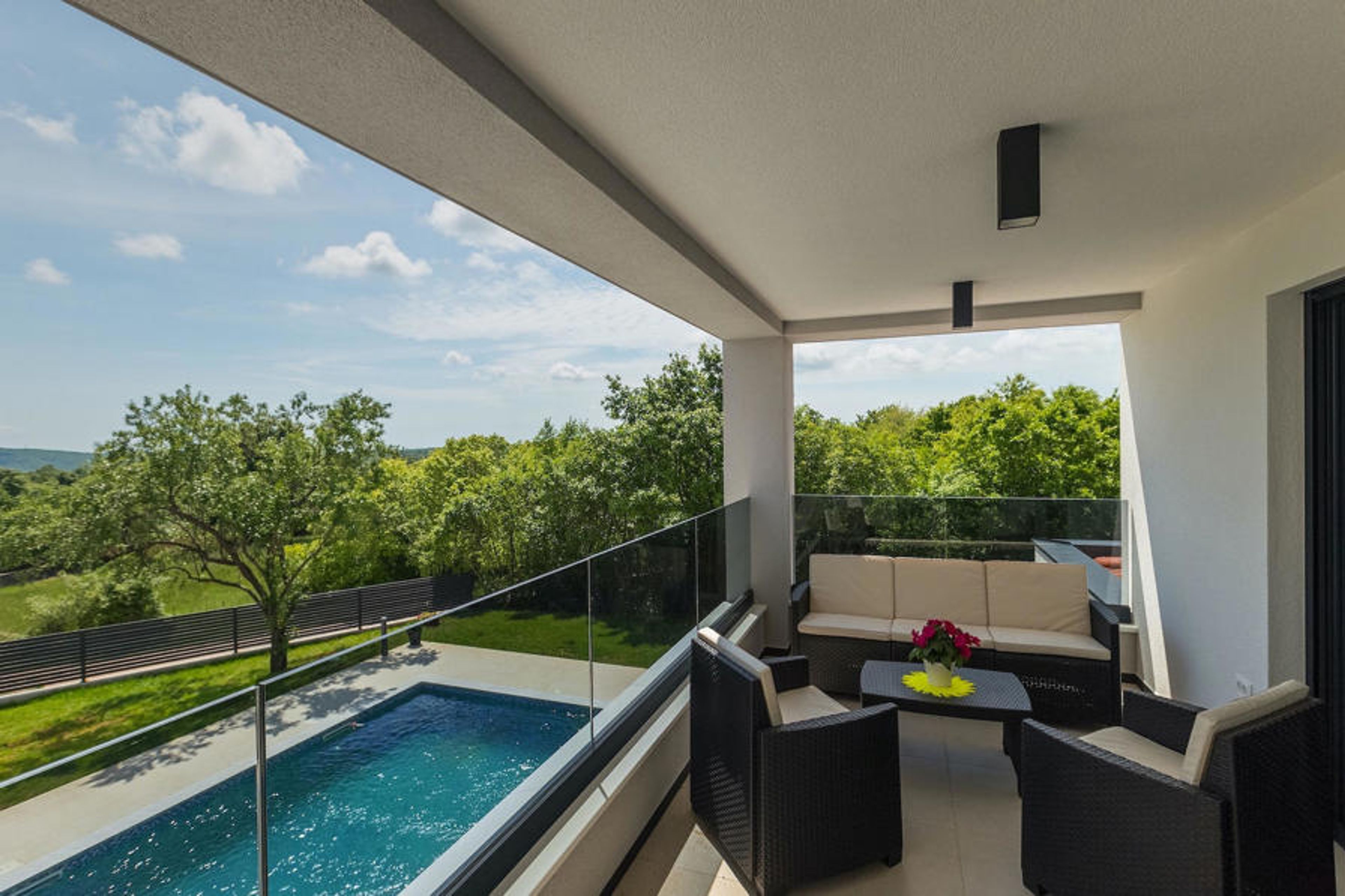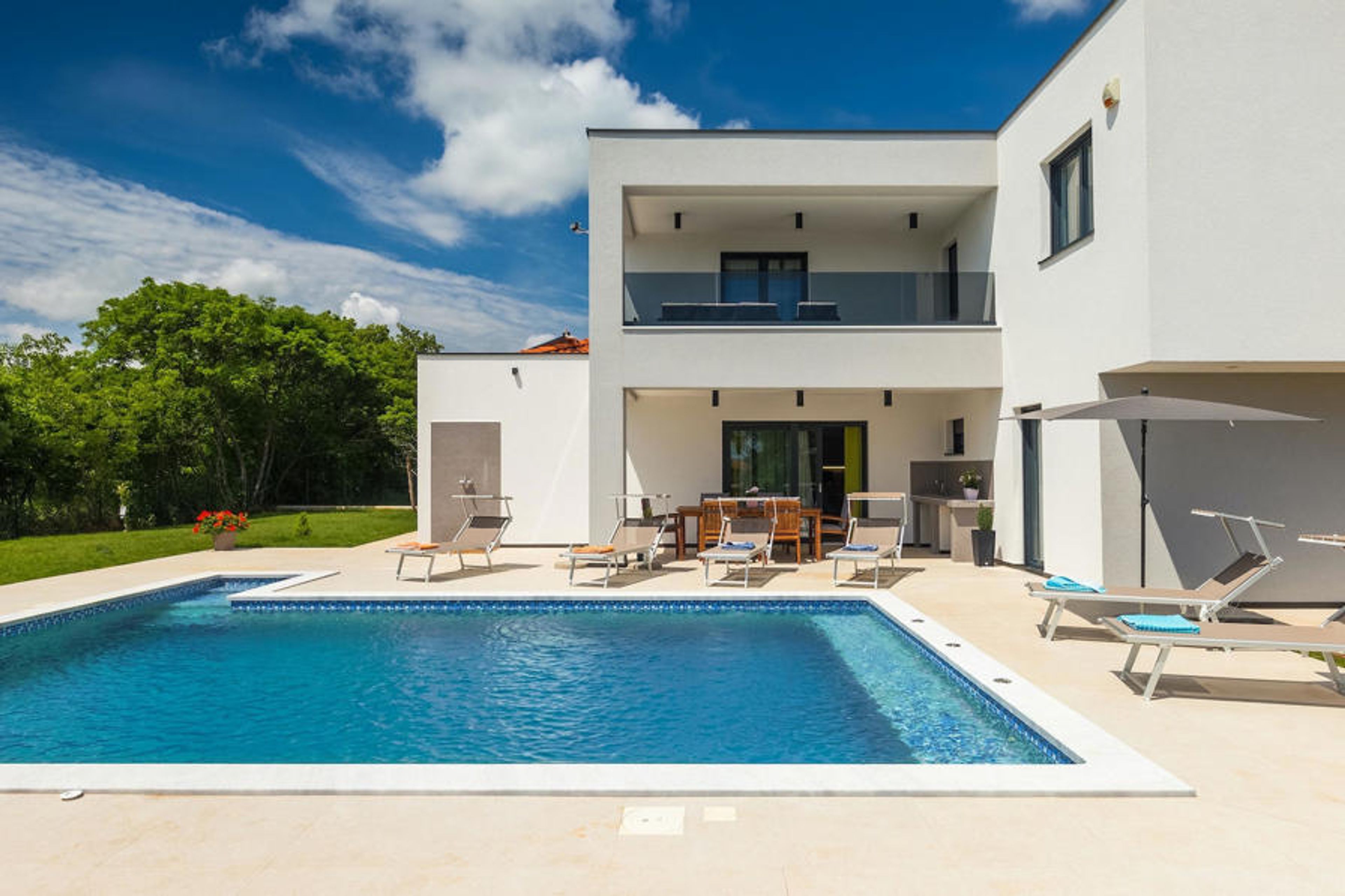 Imagine preparing your favorite dishes for your family and friends while looking out at the pool and then dining together in the open air, where the barbecue is also located. All this can be true if you decide to spend your vacation at Villa Lucas. On the first floor there is a large, minimalist but modern furnished open space for cooking and dining but also suitable as a living room. There is also a special room for relaxing. The sauna is at your disposal for your carefree vacation. The contemporary design kitchen is fully equipped for your culinary adventures. All bedrooms overlook the green garden and the relaxing pool area surrounded by sun loungers and parasols. On the second floor there are 3 pleasant bedrooms in natural, relaxing tones with private bathrooms. From the hallway (and from one bedroom), you can access the spacious split terrace with views of the green Istrian hills and the sea in the far background. Here you can enjoy your first morning coffee or tea while soaking up some sun. The villa is full of carefully selected details and decorations that will make you feel welcome during your peaceful stay. During hot days you can relax in the private pool with hydromassage or just soak up the sun on one of the sun loungers.Marcana is a small town 15 km away from Pula, in the south-eastern part of the peninsula. Here you can visit nearby sinkholes and caves. The largest caves are the Ljubic and Peresin caves. Some stone and pottery remains and even old bones have been found here. These were probably part of the Roman heritage. This area is also known for numerous rustic villas that were built here at that time. These estates were famous for their rustic appearance and interesting stone decorations. If you decide to go sightseeing, you should definitely visit the nearby town of Pula. It is the largest city in Istria, with the beautiful amphitheater, museums and numerous bars and restaurants. Pula also offers numerous cultural events (theater, cinema, concerts, festivals), as well as a lively nightlife, so you certainly won't be bored. If you wish to dive into the clear blue sea, the nearest beaches are only 10 km away. The choice of beaches is vast - something for everyone. Whether you prefer your beach pebbly, rocky or sandy.