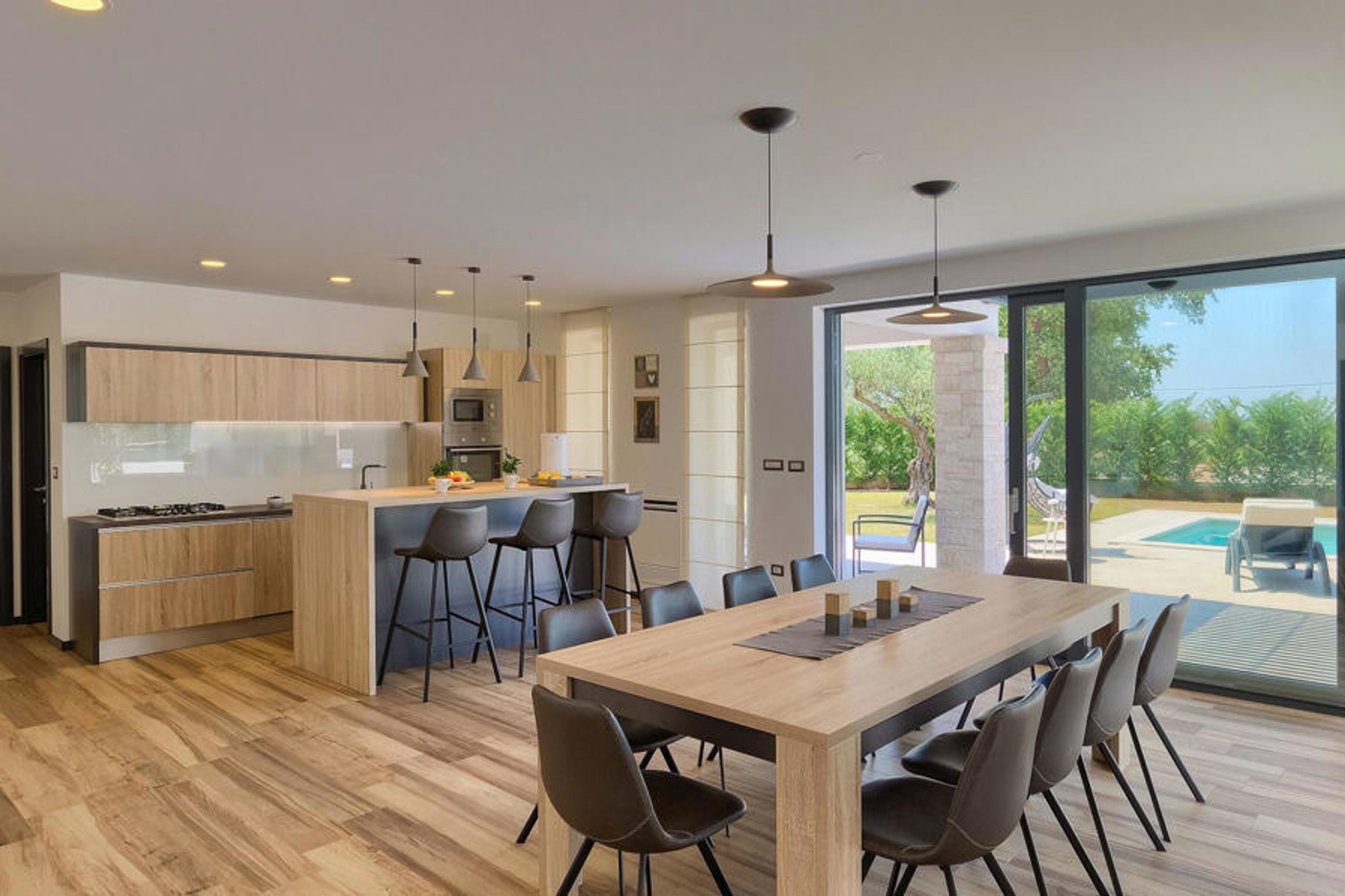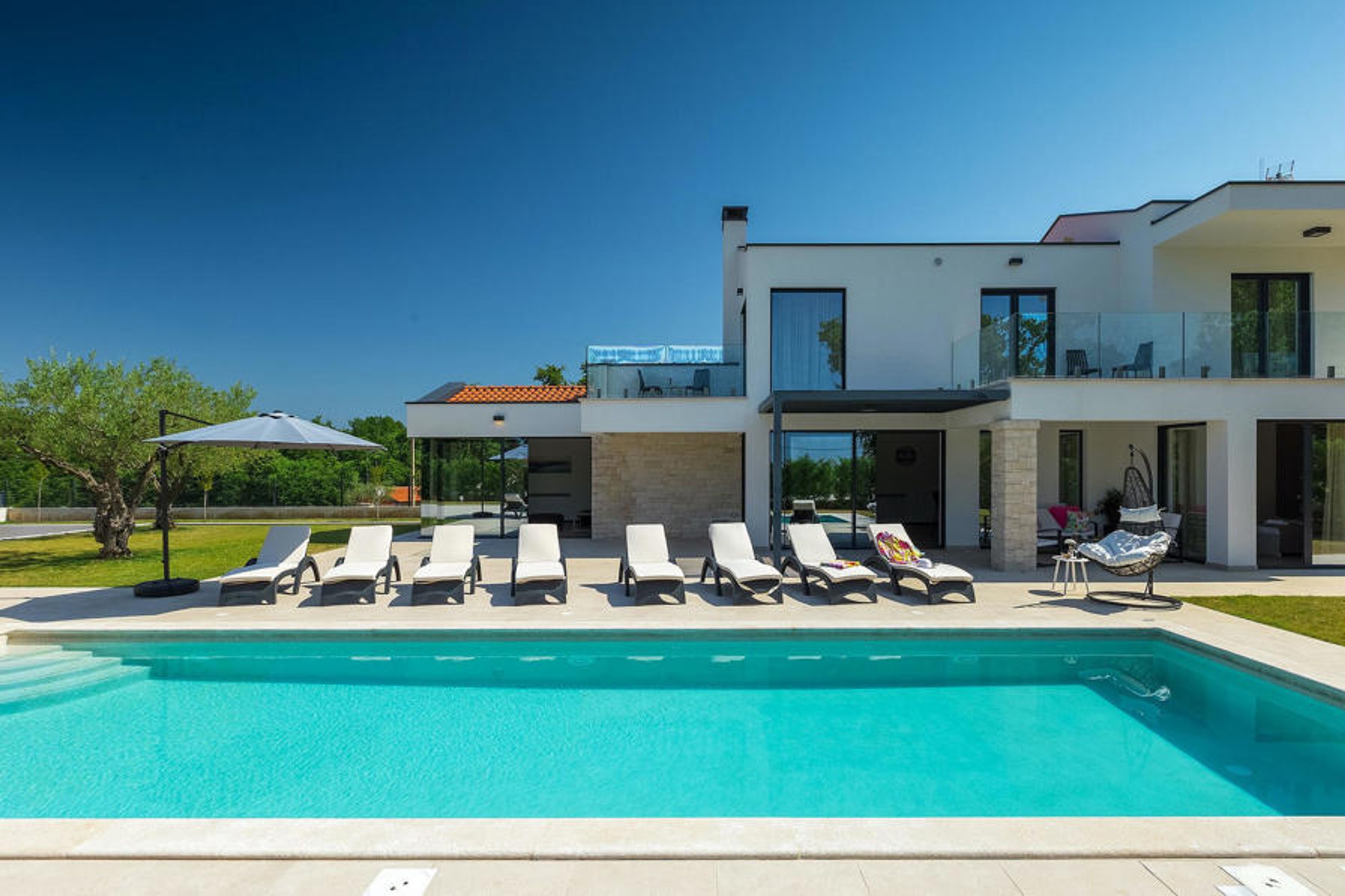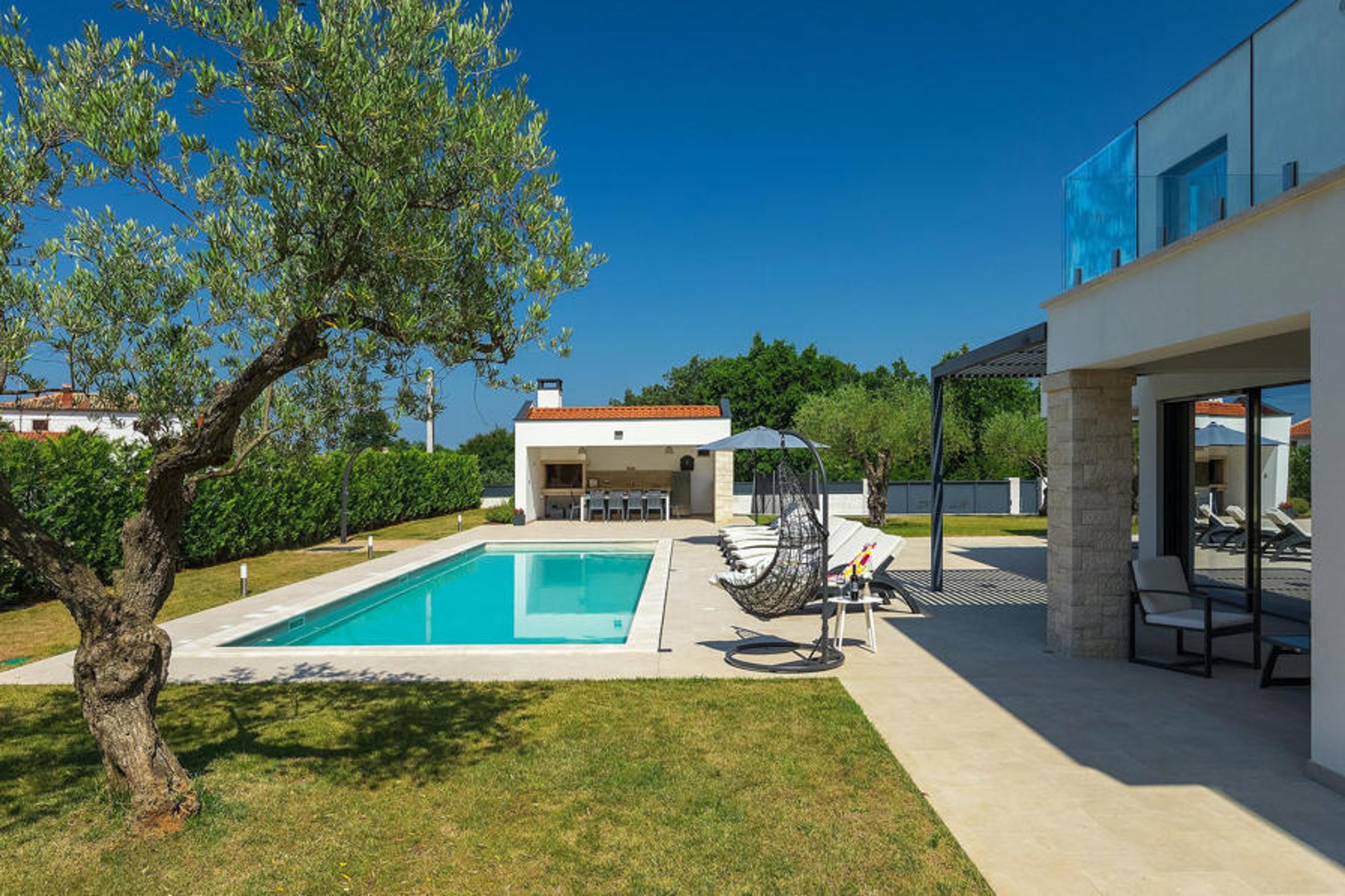 Villa Silvia is an elegant, comfortable villa located near one of the most popular tourist destinations in Istria - the beautiful town of Porec. The villa has 4 bedrooms and can accommodate up to 10 people. On the first floor you will find a spacious and elegant living room connected to the dining area and a fully equipped kitchen with breakfast bar. On this floor there is also a bedroom with en-suite bathroom, a laundry room and a guest toilet. The other 3 light-flooded and cozy bedrooms are located on the upper floor. They are all furnished with a double bed and have their own bathroom. Two of the bedrooms on the upper floor share a terrace, while one bedroom has its own terrace. The terraces offer beautiful views of the pool and the surrounding area. From the living/dining area you have direct access to the 45 m2 private pool. The outdoor area also has a summer kitchen with barbecue and a dining area where you can enjoy a relaxed summer evening with local delicacies. The entire outdoor area and the pool are illuminated at night.