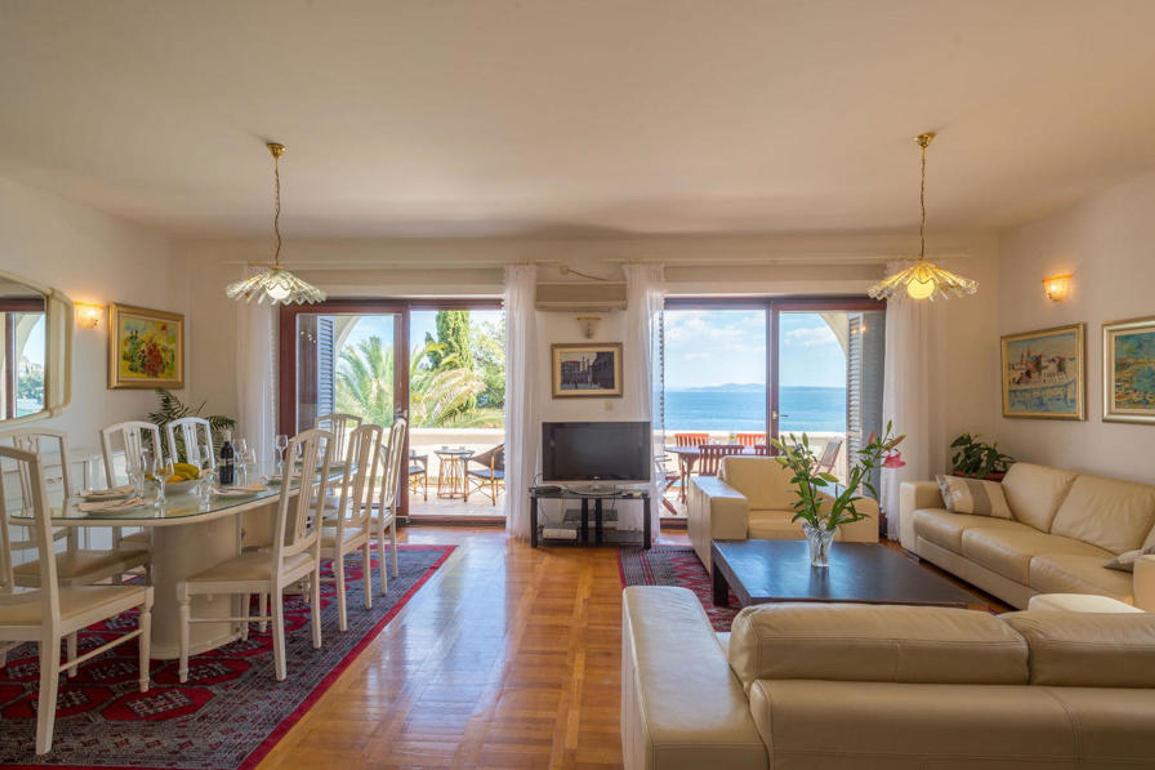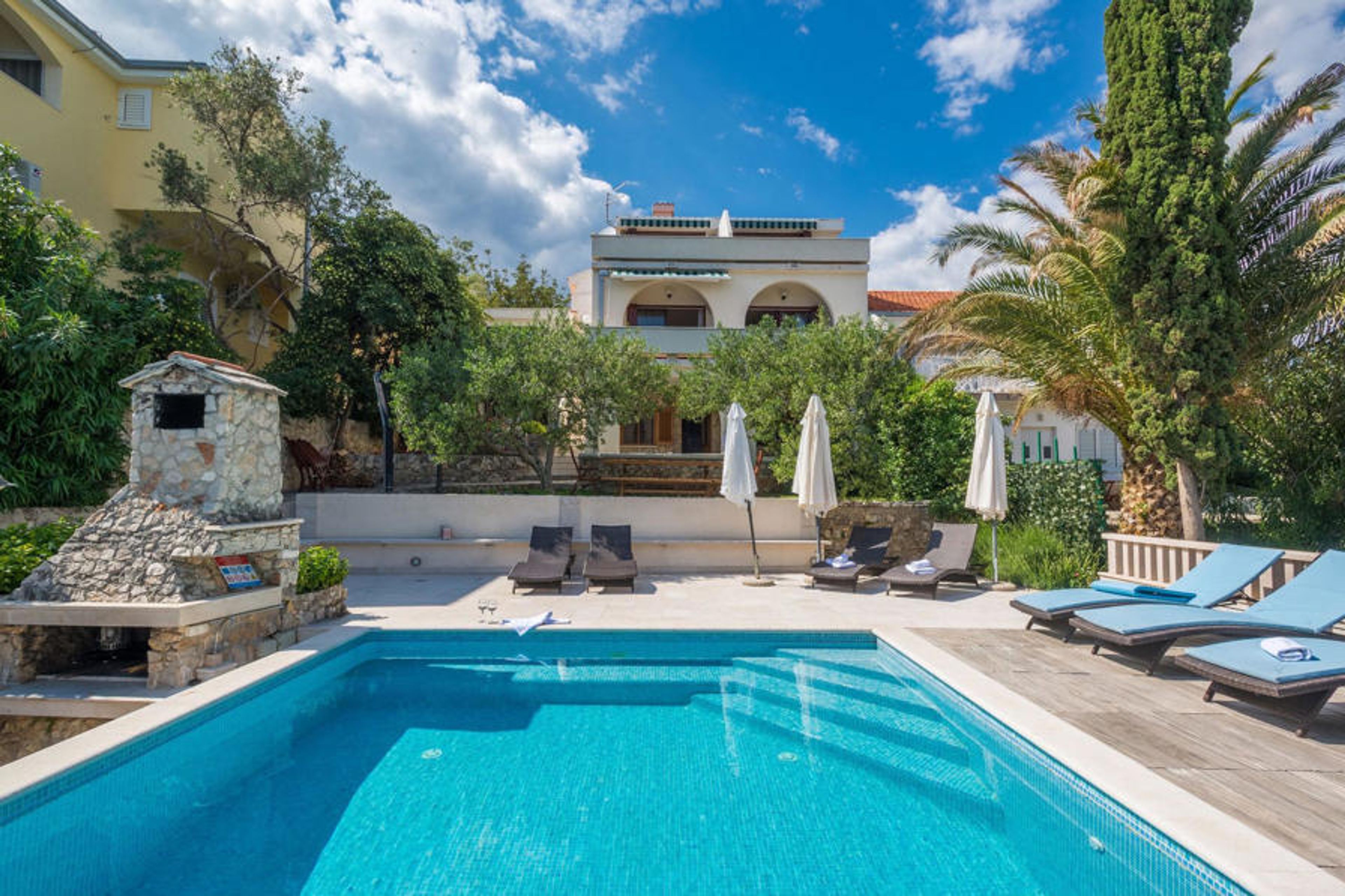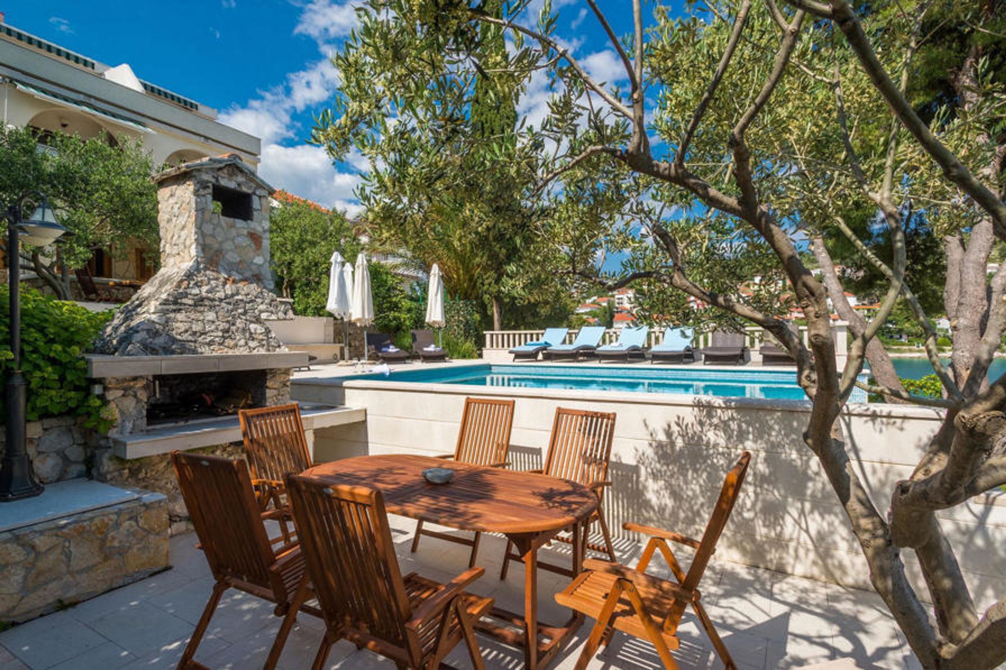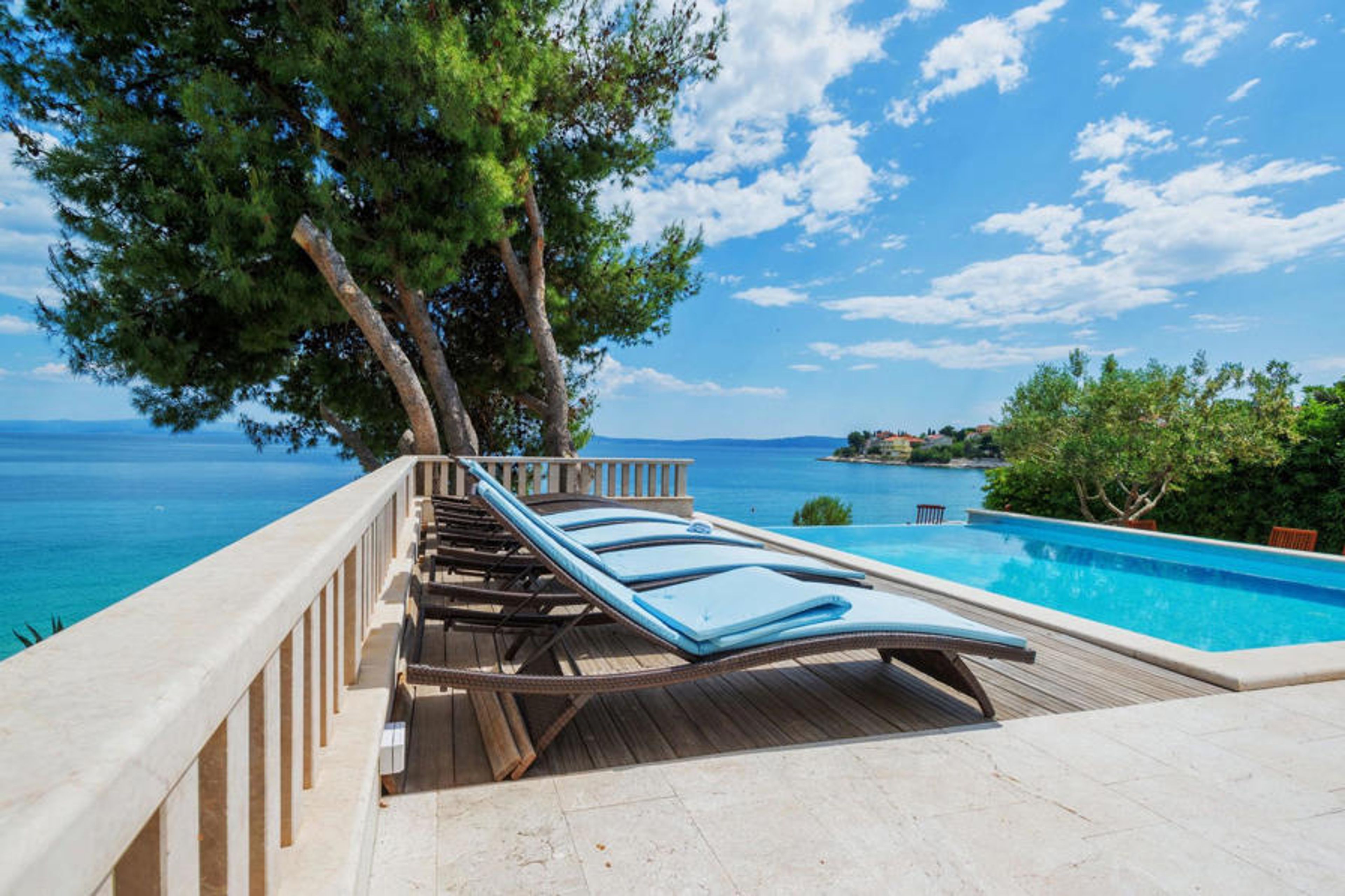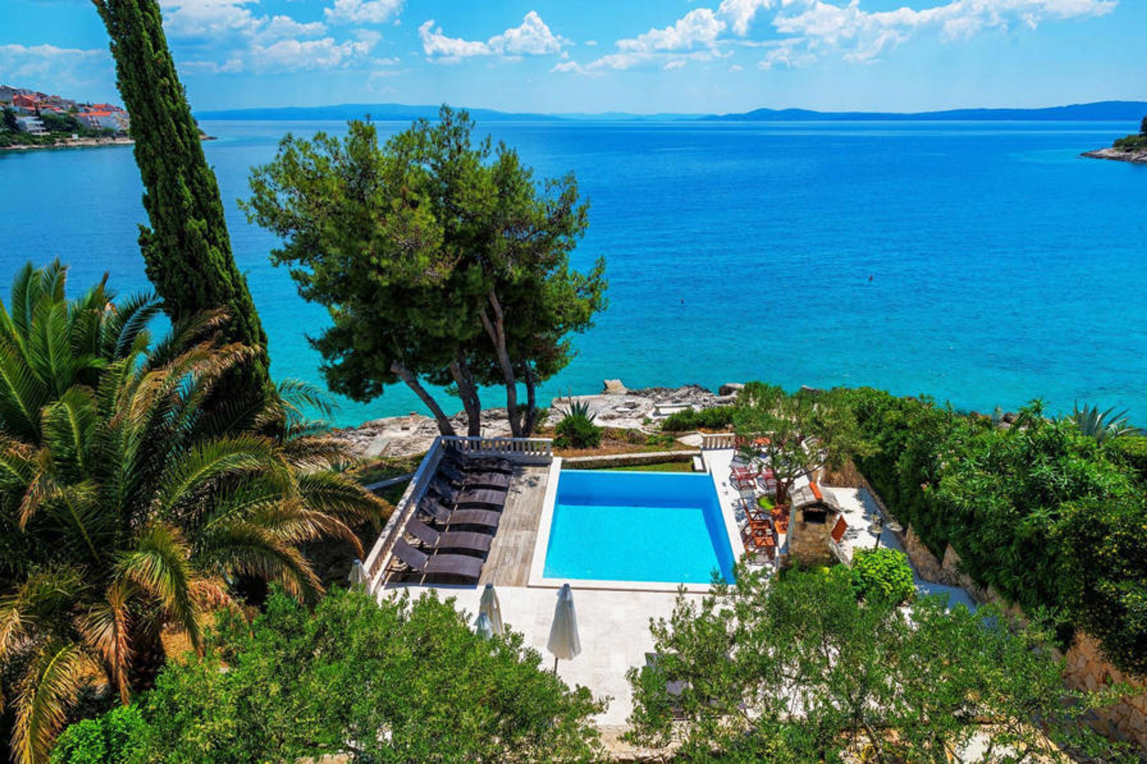 Blessed with a prime location right on the rocky coastline and perfectly positioned to enjoy the sun and crystal clear sea all day long, Villa Paula is cleverly designed to take full advantage of this excellent vantage point from every angle. The inviting paved terrace bordered by a wooden sundeck and Mediterranean garden is ideal for those who prefer sunbathing and swimming to sightseeing, and features a beautiful infinity pool whose edge seems to spill into the cobalt blue sea. Comfortable sun loungers and garden furniture are carefully placed to enjoy both sun and shade, and from the wonderful veranda, you can admire the spectacular sunsets while you indulge in grilled steaks, or fresh fish procured from local fishermen. This spacious property with all the amenities of modern technology (WiFi, A/C, cable and satellite TV) unfolds over three floors and has 4 bright independent apartments with 4 fully equipped kitchens with dining area, 3 comfortable living rooms with a fireplace for cozy atmosphere, 6 bathrooms (four of them ensuite) and 7 double bedrooms, offering enough space to find a quiet corner both in a large group should you need it. Each floor opens onto a balcony or terrace, cleverly positioned so that you can admire the magnificent sea views in the privacy of your own home. It's almost impossible to marvel at the enchanting surrounding islands from your villa every day without being tempted to hop on a boat and explore them, which is easily achievable as you can hire a boat directly from your very helpful on-site hosts.Villa Paula has the ideal location to explore this corner of paradise, with its numerous beautiful beaches, idyllic islands, hidden coves and famously crystal clear waters of the Adriatic, while at the same time being in close proximity to the wonderful historical and architectural sights of the famous UNESCO World Heritage Sites of Trogir and Split. The lively little resort of Okrug Gornji on the picturesque island of Ciovo offers a nice selection of restaurants, cafés and stores, as well as a number of beach bars known among the younger generation for their excellent parties. Countless small bays in the surrounding area offer peace and quiet for those who prefer privacy, while beautiful pebble beaches with plenty of shallow spots make it a perfect place for families with children. Adventure seekers have at their disposal a rich variety of sports and adventure facilities, including a diving center, tennis, soccer and basketball, as well as beach volleyball, surfing, parasailing and all kinds of water sports activities. Cars, bicycles and boats can be rented directly at the villa.