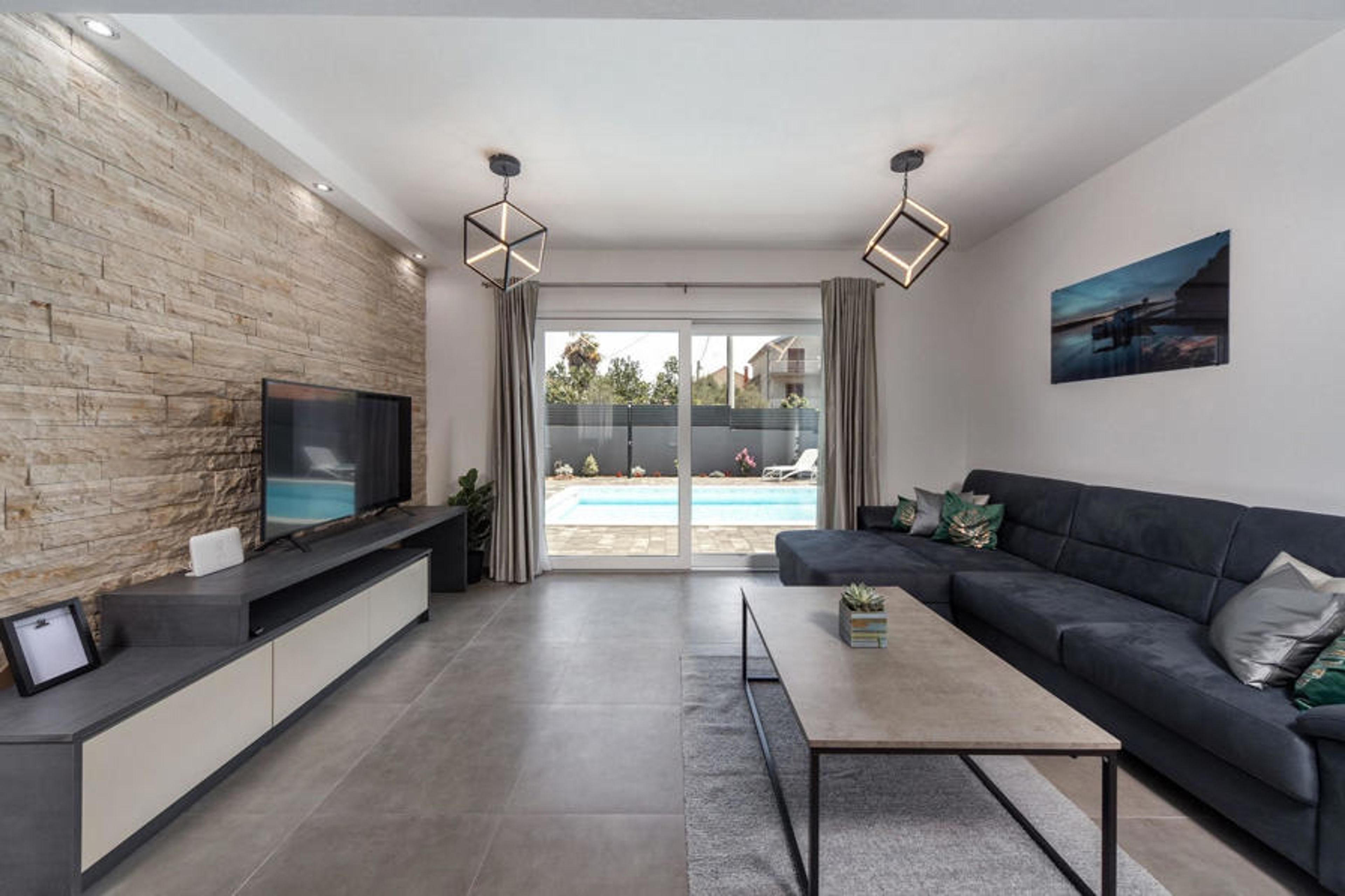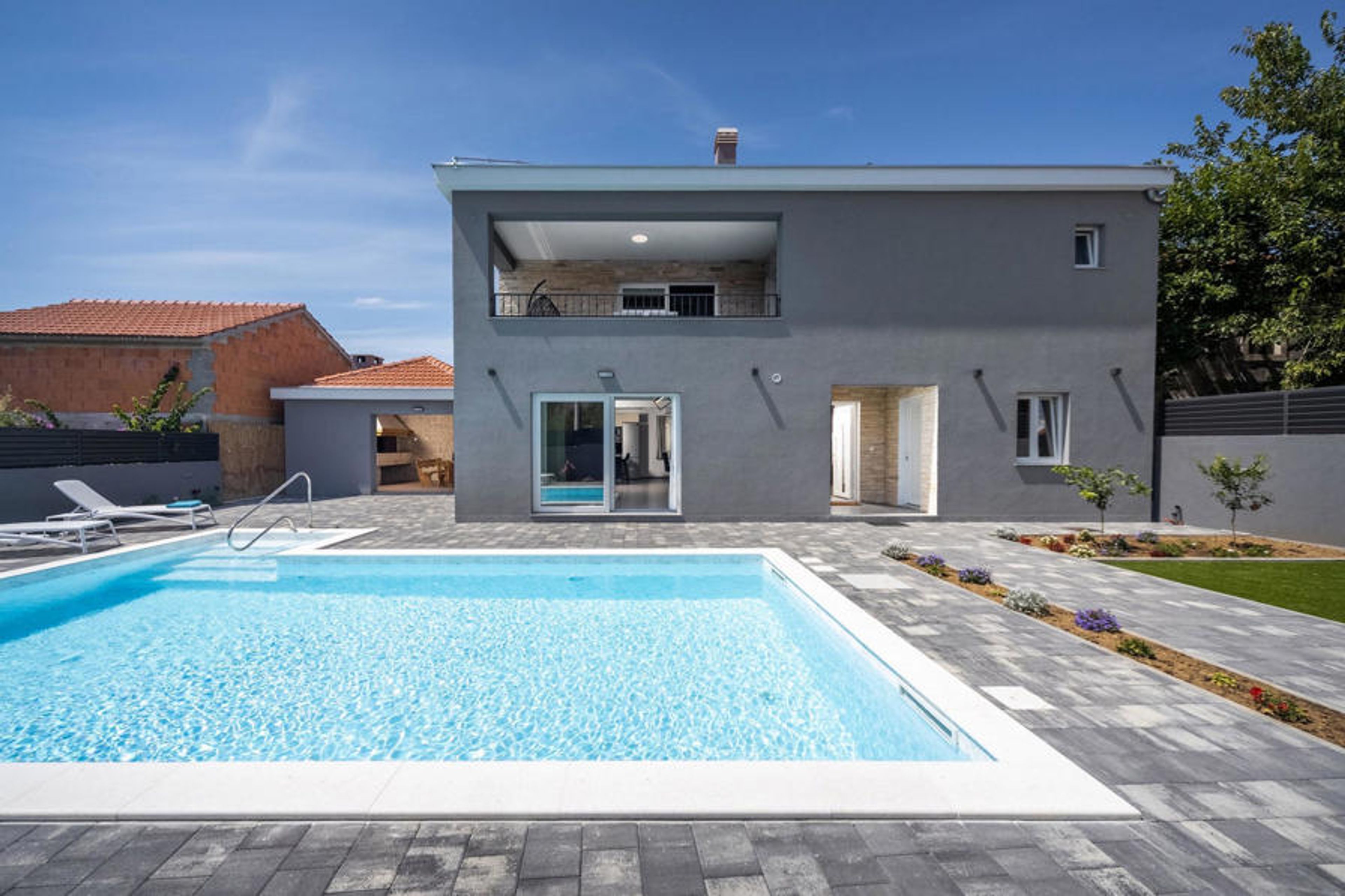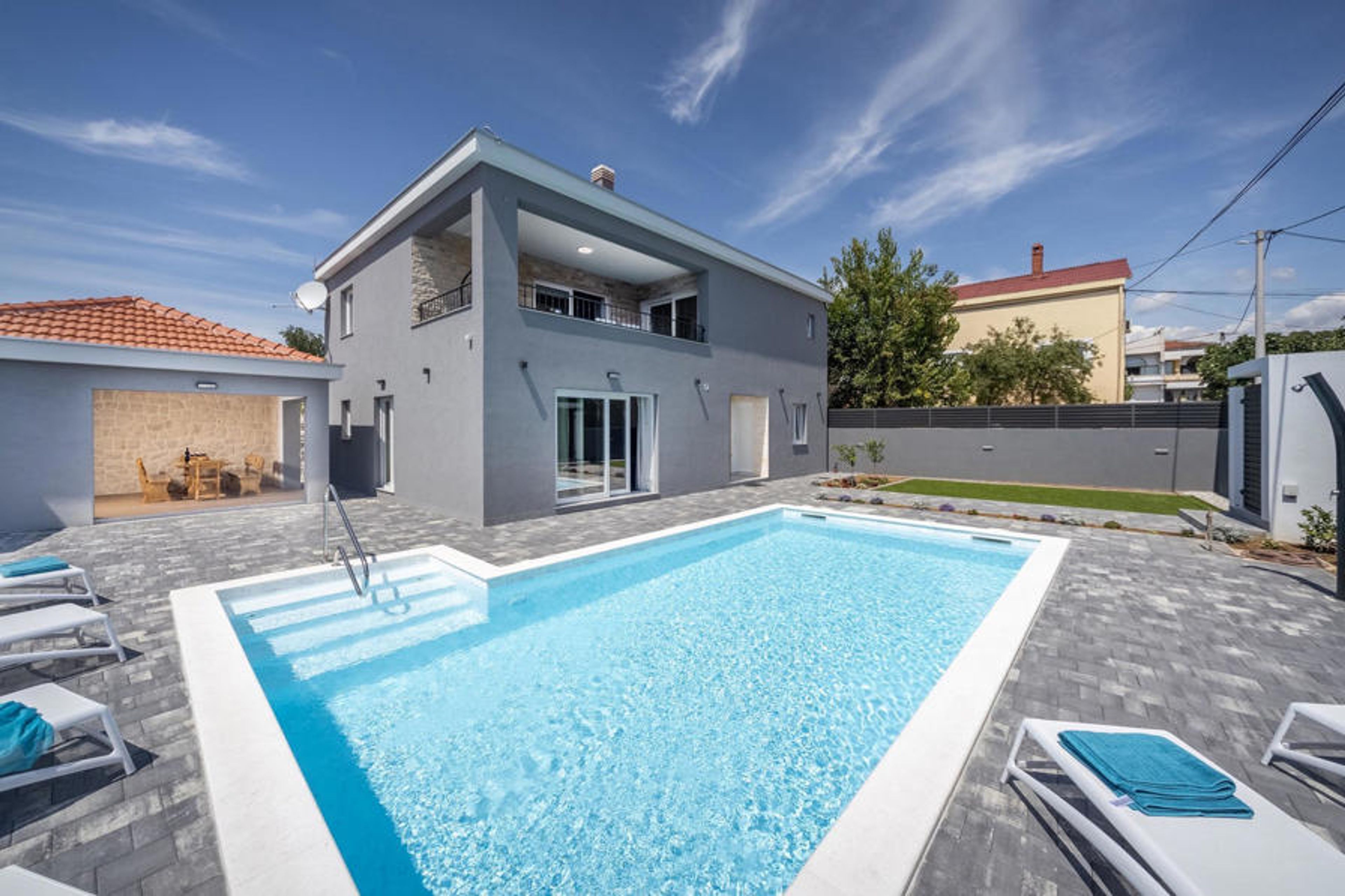 Three bedrooms are located on the first floor and have en-suite bathrooms, a TV and are air-conditioned. Two rooms have access to the covered balcony with lounge area where you can relax and enjoy your holiday. The fourth bedroom is located on the ground floor and also offers a double bed, an en-suite bathroom, a TV and is air-conditioned. On the same level there is also a spacious living room with a TV as well as a fully equipped kitchen and dining room. The whole area is air-conditioned. From the living room you have direct access to the garden where you will find a pool and sun loungers where you can relax with a good book or a refreshing drink. Next to the house is a covered terrace with a dining table and charcoal barbecue where you can prepare delicious meals for family and friends. The property is fully fenced. There is a private car park for 4 cars next to the property. Book your accommodation in Villa Bibinje and spend an unforgettable holiday with family and friends.Villa Bibinje is located in the small coastal town of Bibinje, just a few minutes drive from Zadar. With over 300 days of sunshine a year, this region is a favourite destination for tourists from all over the world. The villa is ideally located for numerous excursions. We recommend you to visit the nearby islands such as Ugljan, Paman and discover the picturesque bays and the most beautiful beaches of the Adriatic. Zadar will delight you above all with its rich history. Take a walk through the narrow streets of the city and visit numerous galleries and shops where you can buy handmade souvenirs. The unmissable attraction of this town is the unique Sea Organ and the Greeting to the Sun, where you can enjoy the most beautiful sunset in the world. Homemade prosciutto (prut) or Mediterranean mussels are just one of the many Dalmatian gastronomic specialities of Mediterranean cuisine. This part of Dalmatia is also home to some of the most beautiful national and nature parks in this part of Europe. There are 3 nature parks Telaica, Northern Velebit and Vrana Lake, and 5 national parks Paklenica, Plitvice, Kornati, Krka and Velebit, which put Zadar and its surroundings at the top of the Croatian tourist offer.