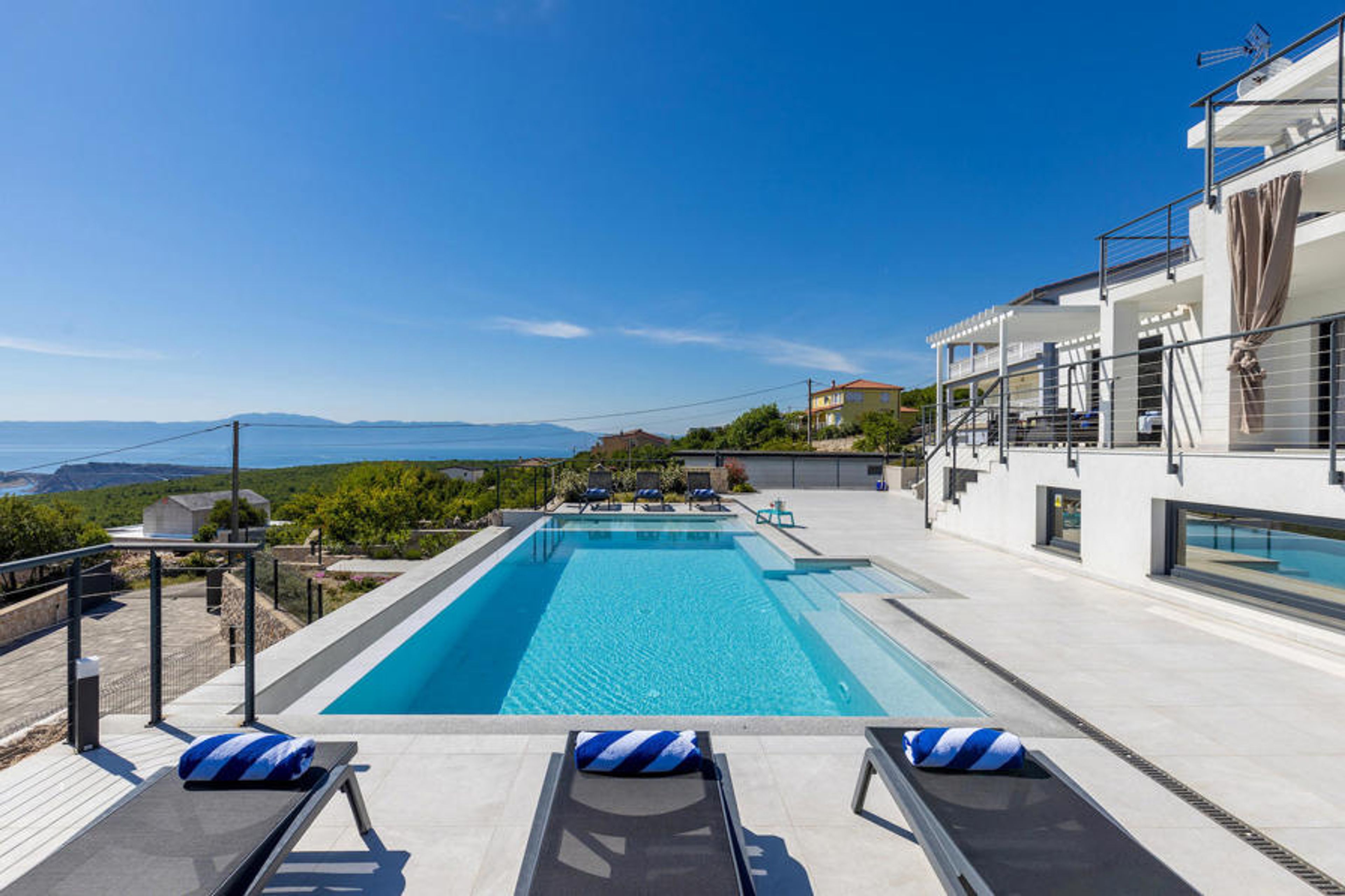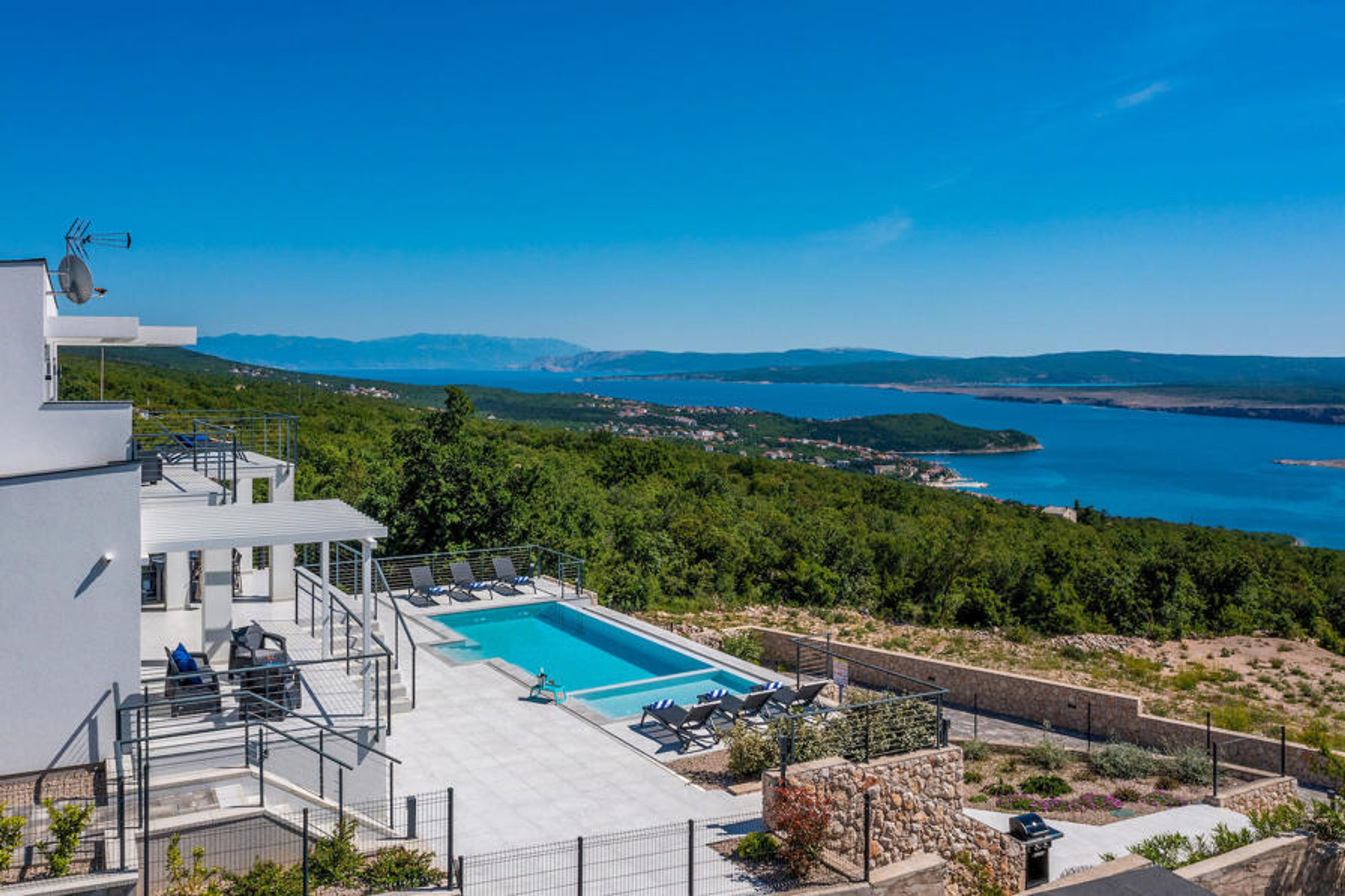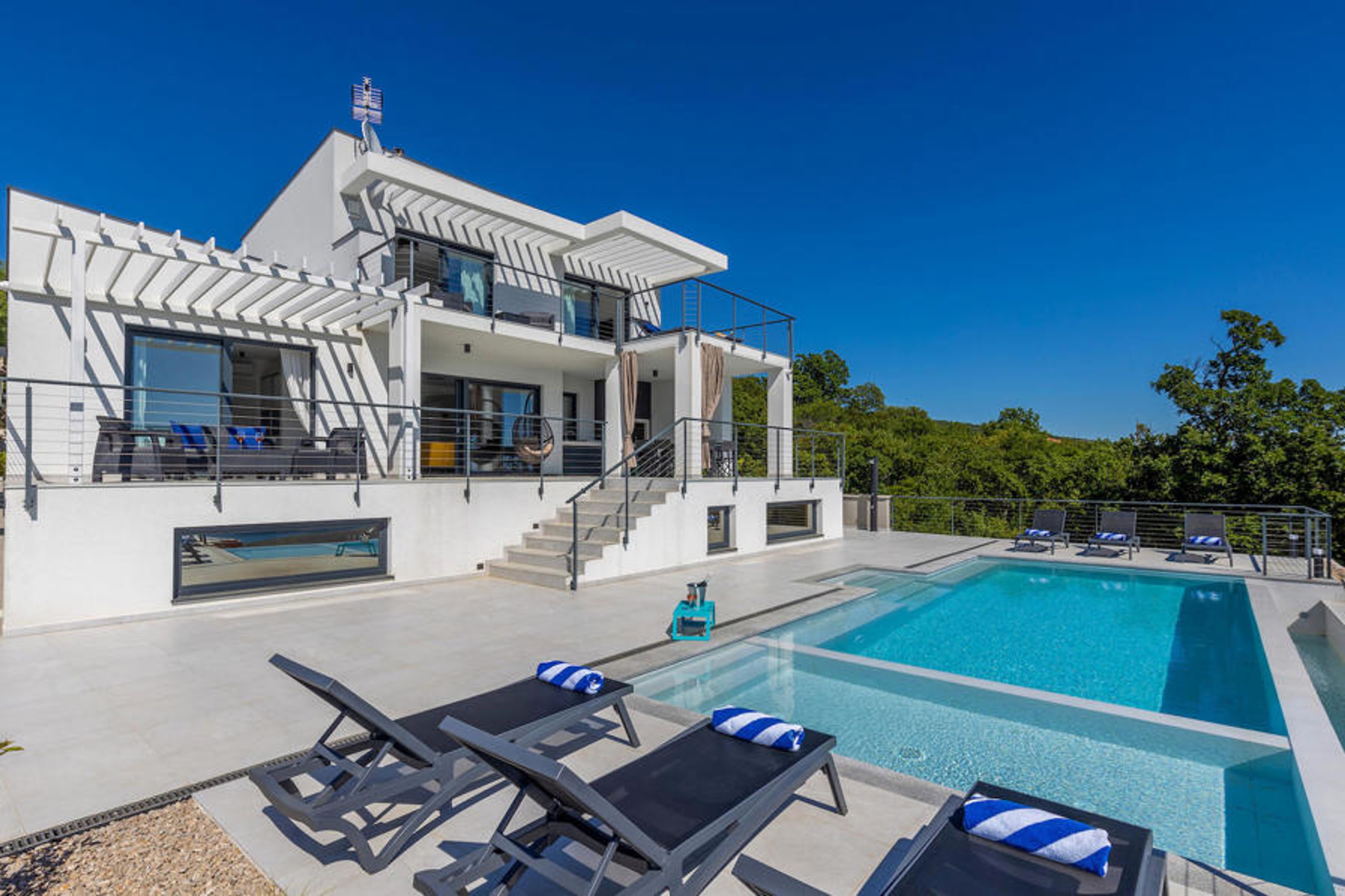 The staircase leads you to the level where the pool is located, while the terrace and the ground floor of the house are on the level above. The villa has three bedrooms for six people with the possibility of accommodating an extra person in one of the rooms. All three rooms are bright and comfortable with en-suite bathrooms, television and air conditioning. Two rooms with a double bed are located on the first floor and have access to the balcony with a beautiful view of the Kvarner Bay and the island of Krk. The third bedroom is located on the ground floor and has two single beds. One of the beds can be converted into a double bed and thus offers the possibility of accommodating an additional guest. This room has direct access to the terrace, also with beautiful panoramic views. The ground floor also has a living room with TV and electric fireplace, dining room and the fully equipped kitchen, which are connected in an open-space concept. The whole area is air-conditioned. The basement offers additional amenities - a games room with table football, darts and Playstation. On the same floor there is also an equipped fitness room and a wellness area with sauna, hydromassage bath and shower. The inviting pool consists of 2 parts - the small, shallower part with a depth of 0.5 metres is for our younger guests. The larger part of the pool offers additional relaxation opportunities thanks to the built-in bench with massage jets. For children, the villa also has a small playground with a slide, climbing frame and swing. The property is fully fenced and has its own car park for 3 cars.