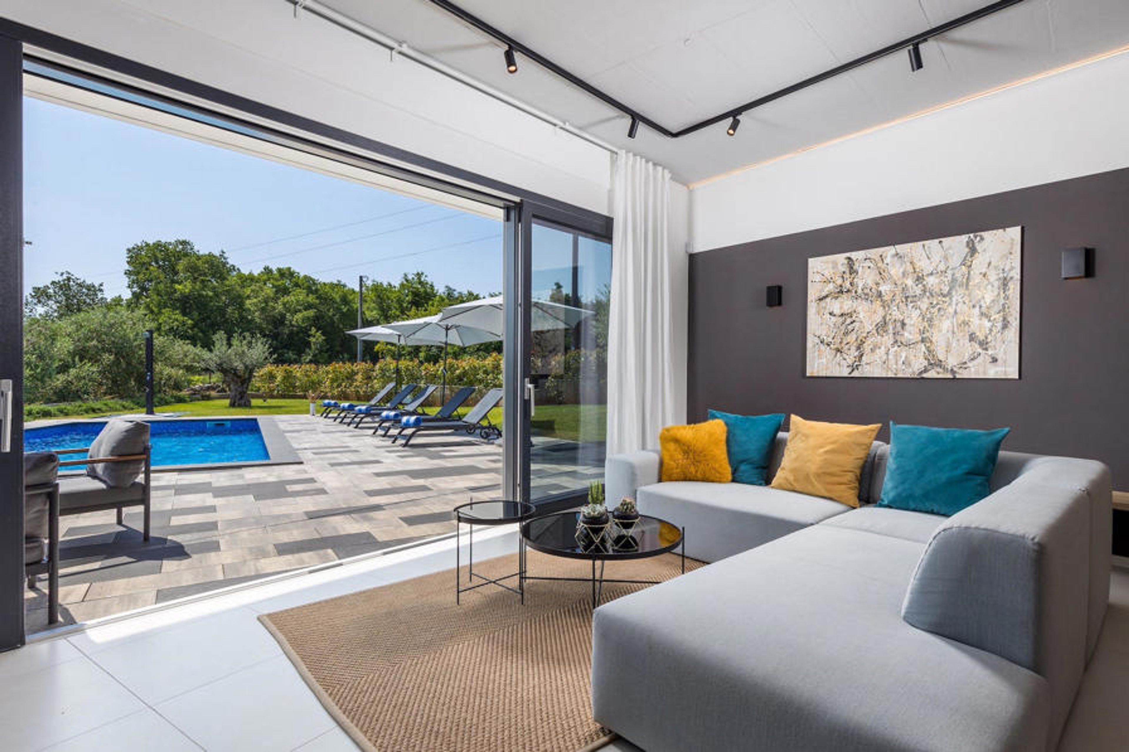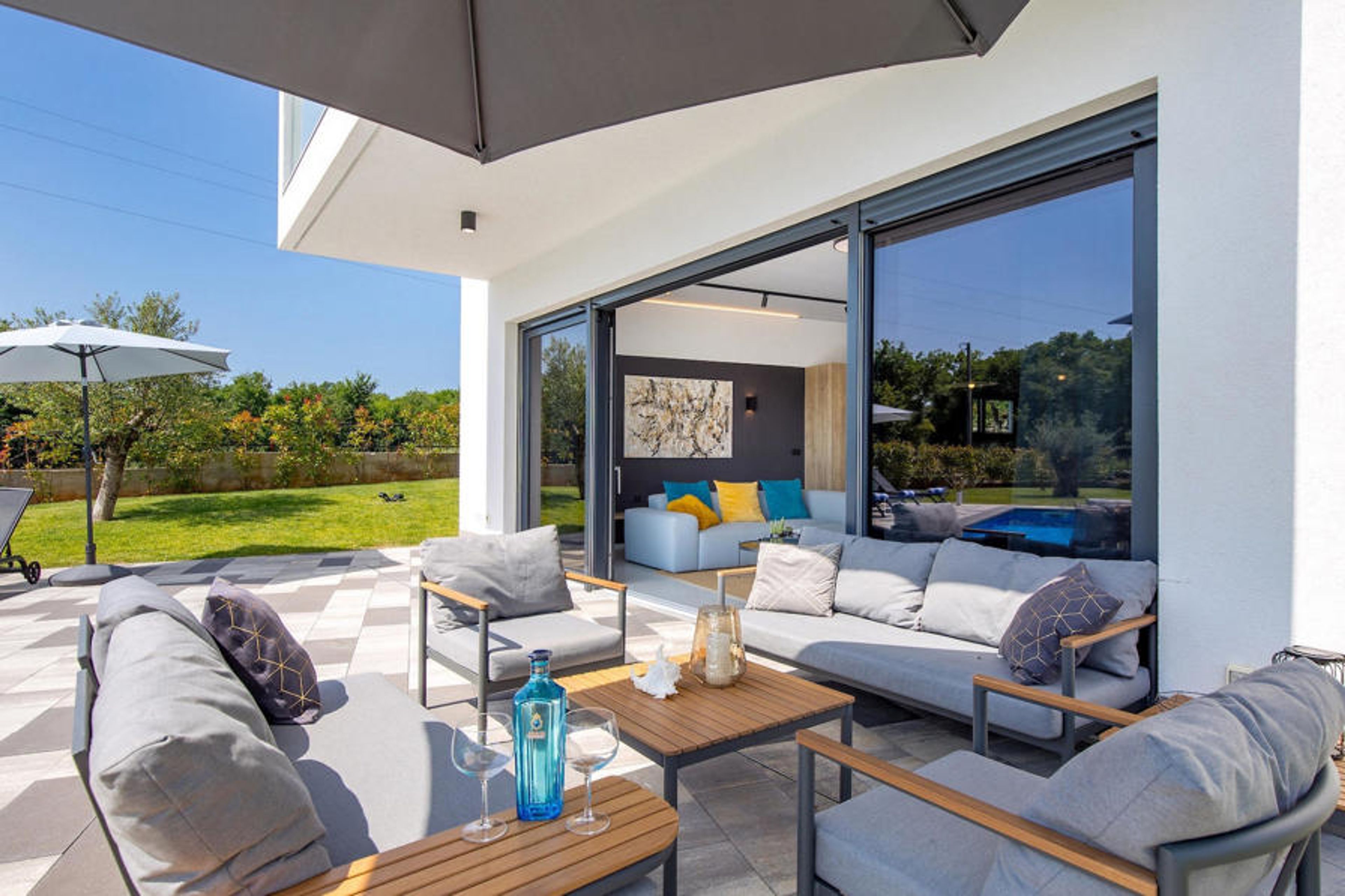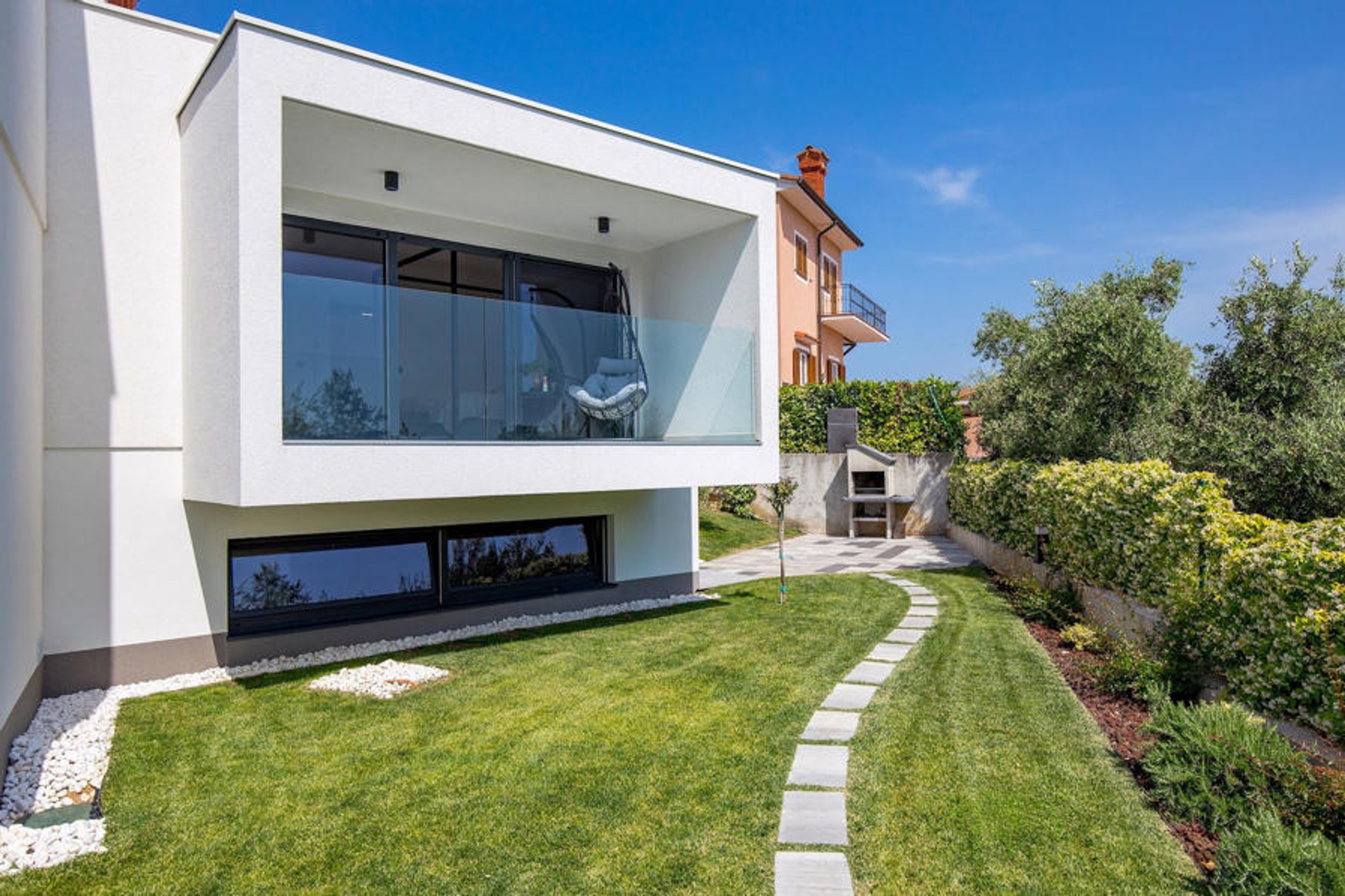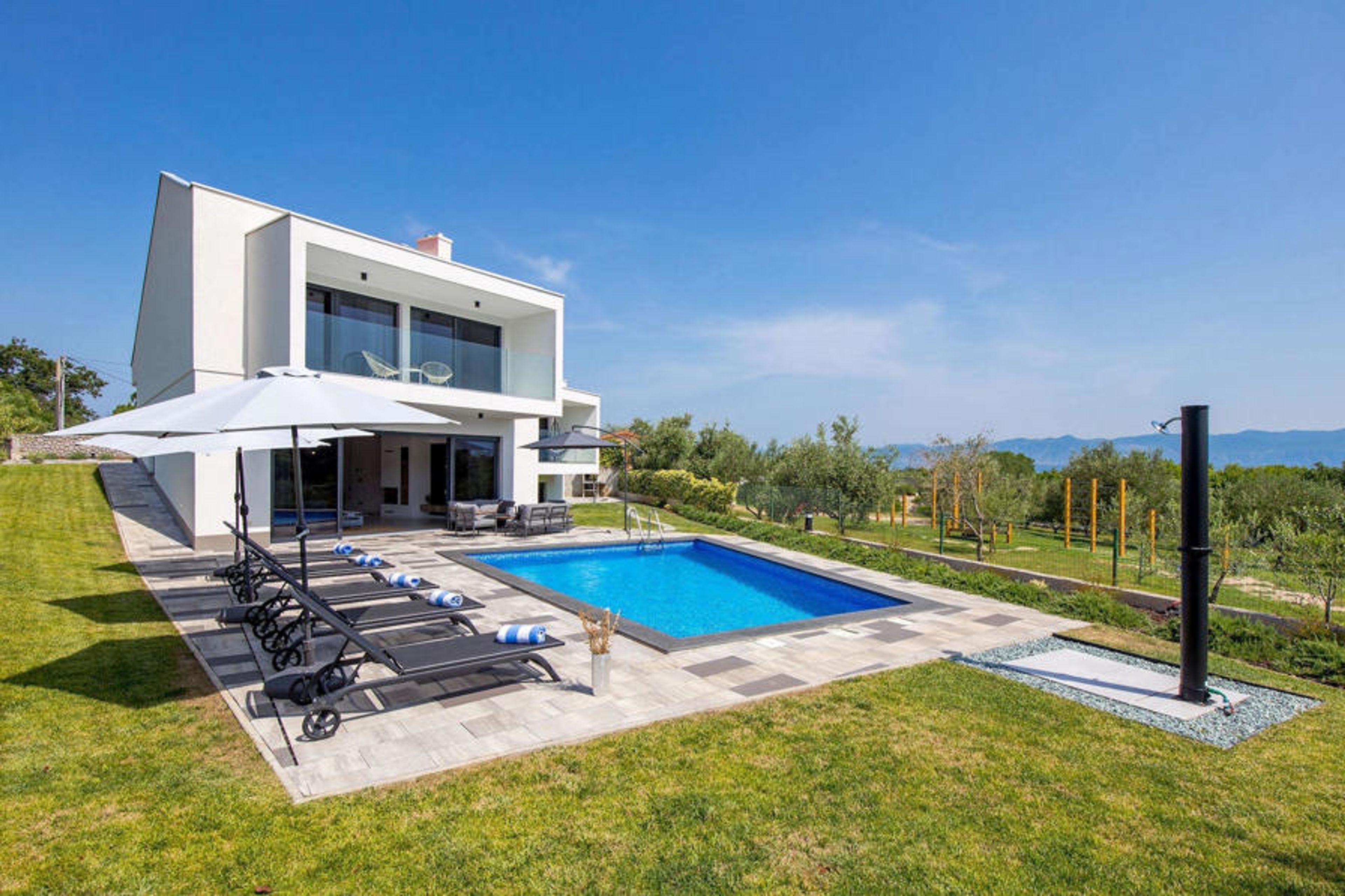 Villa Ante welcomes you with a large garden in which there is a refreshing pool and 6 sun loungers next to it. Outside the fenced garden, there is a lovely private dining area for up to 8 people and a barbecue. As you approach the villa, you will see a lounge area in front of the wide glass doors. Inside, the modern living room with TV is lit with natural light and overlooks the pool and garden. Right next to it is the fully equipped kitchen and dining area for up to 8 people. Your children will be delighted to find a wooden swing there. Two double bedrooms, each with its own TV and bathroom, offer you nights of well-deserved rest. One floor below, you can work out quickly in the private gym, play table football or relax in the sauna. On the first floor, two further double rooms with their own TV and shared bathroom invite you to a cosy night's sleep. They each have a glass door leading to one of the two balconies. For a luxurious family holiday in a stunning modern villa, Villa Ante is the perfect choice. Villa Ante is located on the beautiful island of Krk. There are many stunning, well-known beaches around the island's coastline, each only about 35 minutes away. You can visit the Biserujka cave, which you enter through a hidden entrance in an inconspicuous stone house in the middle of a barren karst landscape. Just 35 minutes away, you can spend a day in Baka, a holiday resort known for its old town, churches and beaches such as the centre of Vela Plaa. Near Baka is the Church of St Lucia in Jurandvor, a Romanesque Catholic church dating back to 1100, where you can see two important medieval Croatian artefacts: the Baka tablet and a chessboard carving on the bell tower.