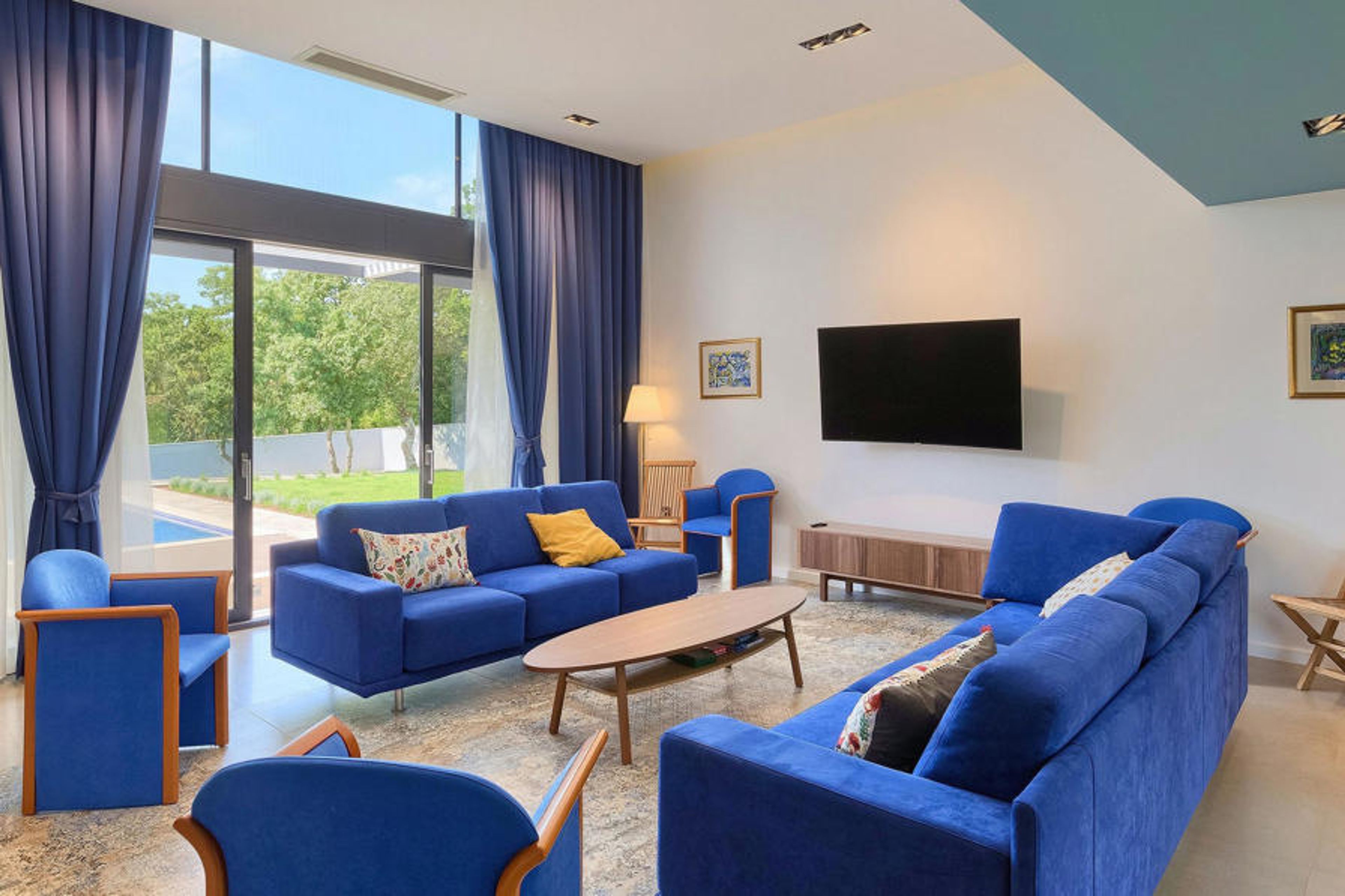The living area offers a wonderful high ceiling with a glass wall with French doors providing direct access to the pool and garden, as well as a 164 cm TV and accent wall with fireplace. In the villa you will also find an elegant kitchen with dining area as well as a sauna, 4 bedrooms and 5 bathrooms. All facilities are located on the same floor and offer beautiful views of the pool area and garden.