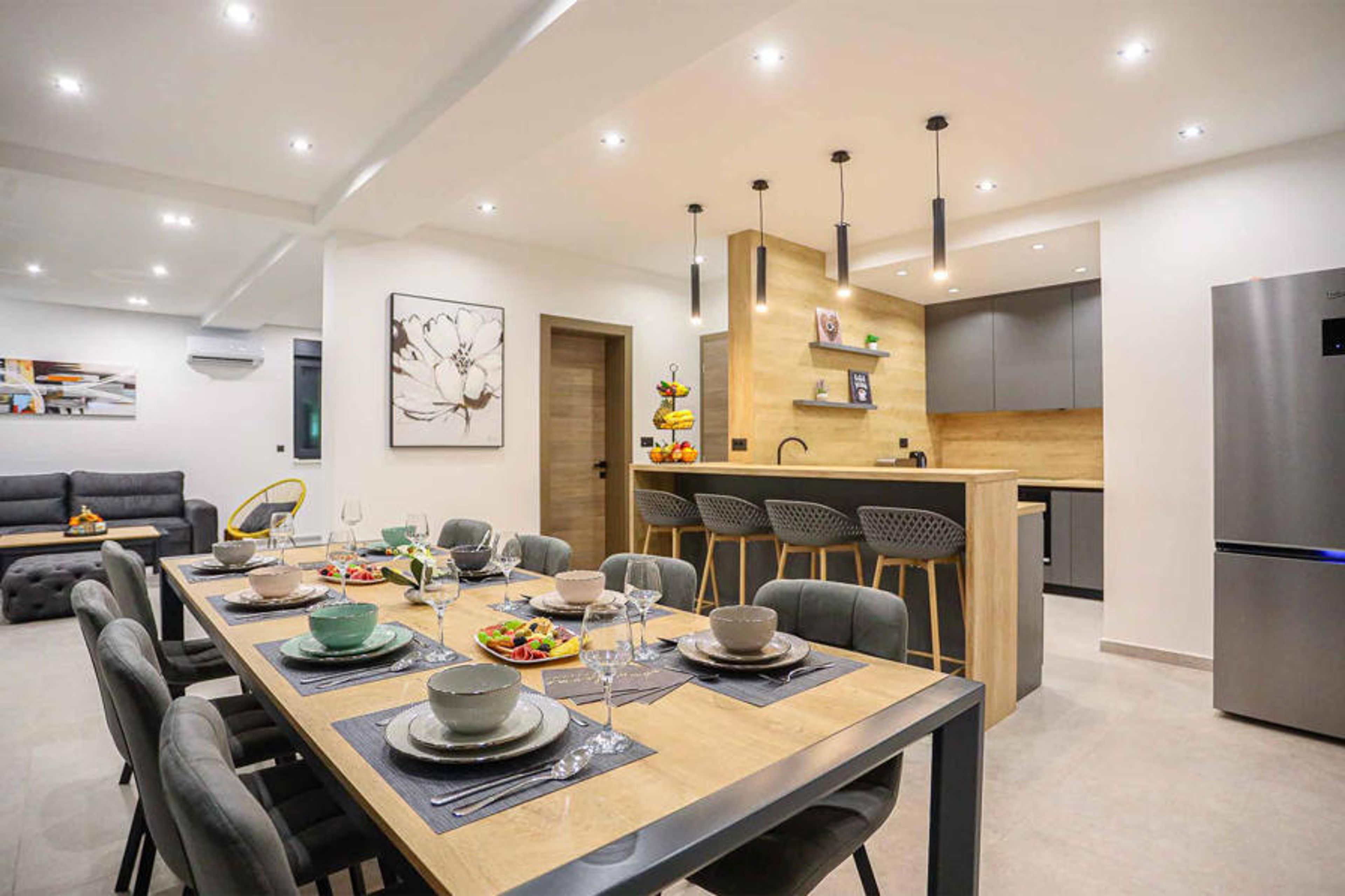 Make your dream vacation come true and spend unforgettable vacations in this comfortable and modern house in Podstrana. On three floors, you can enjoy the luxury and high-quality furniture of the accommodation and take full advantage of the large amount of space. Almost all bedrooms have their own bathroom, so you can enjoy your privacy. Discover the activity room, where you can play or work out. Decide for yourself whether you want to hang out and swim by the pool or enjoy the view from the magnificent roof terrace.