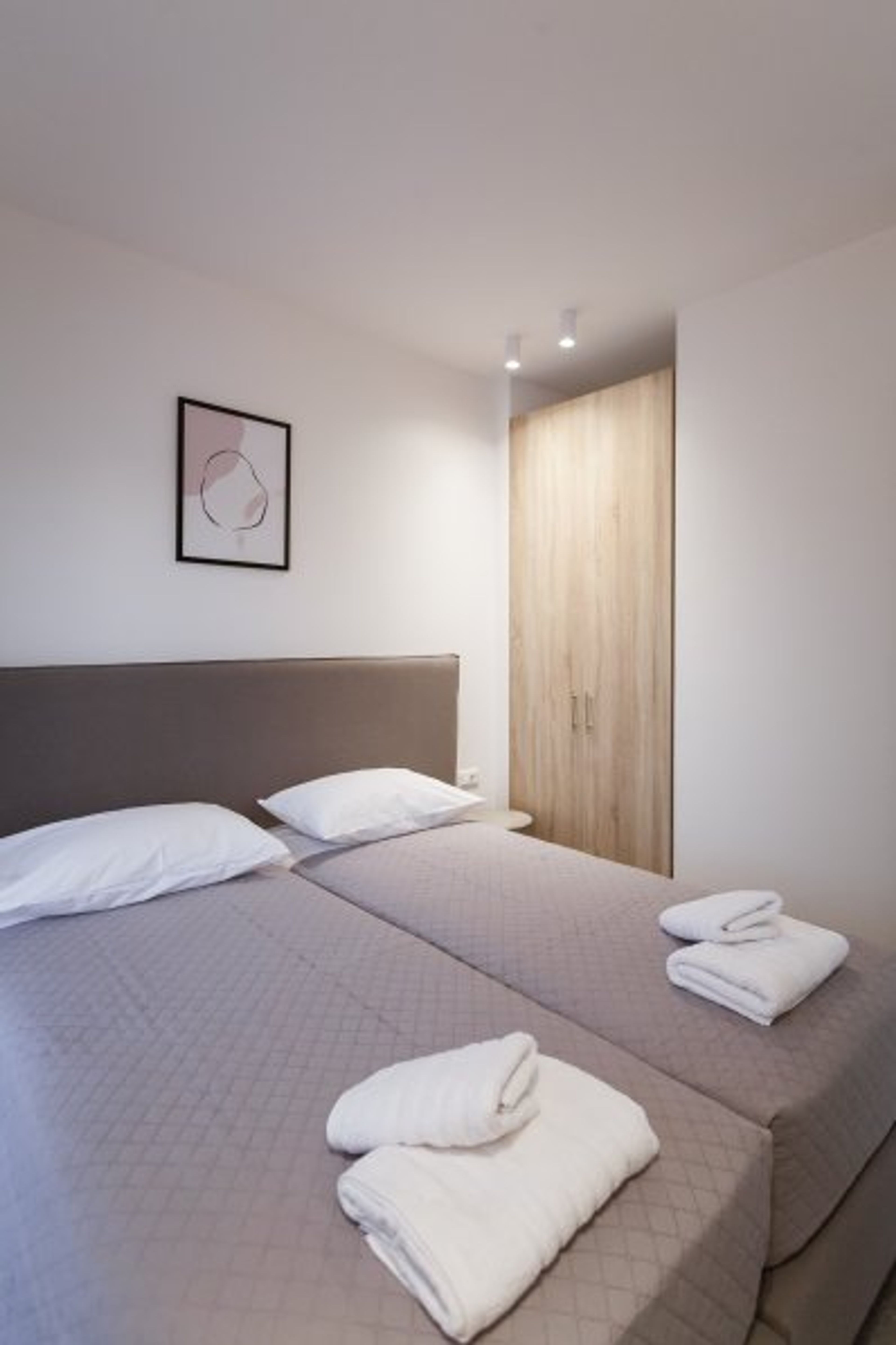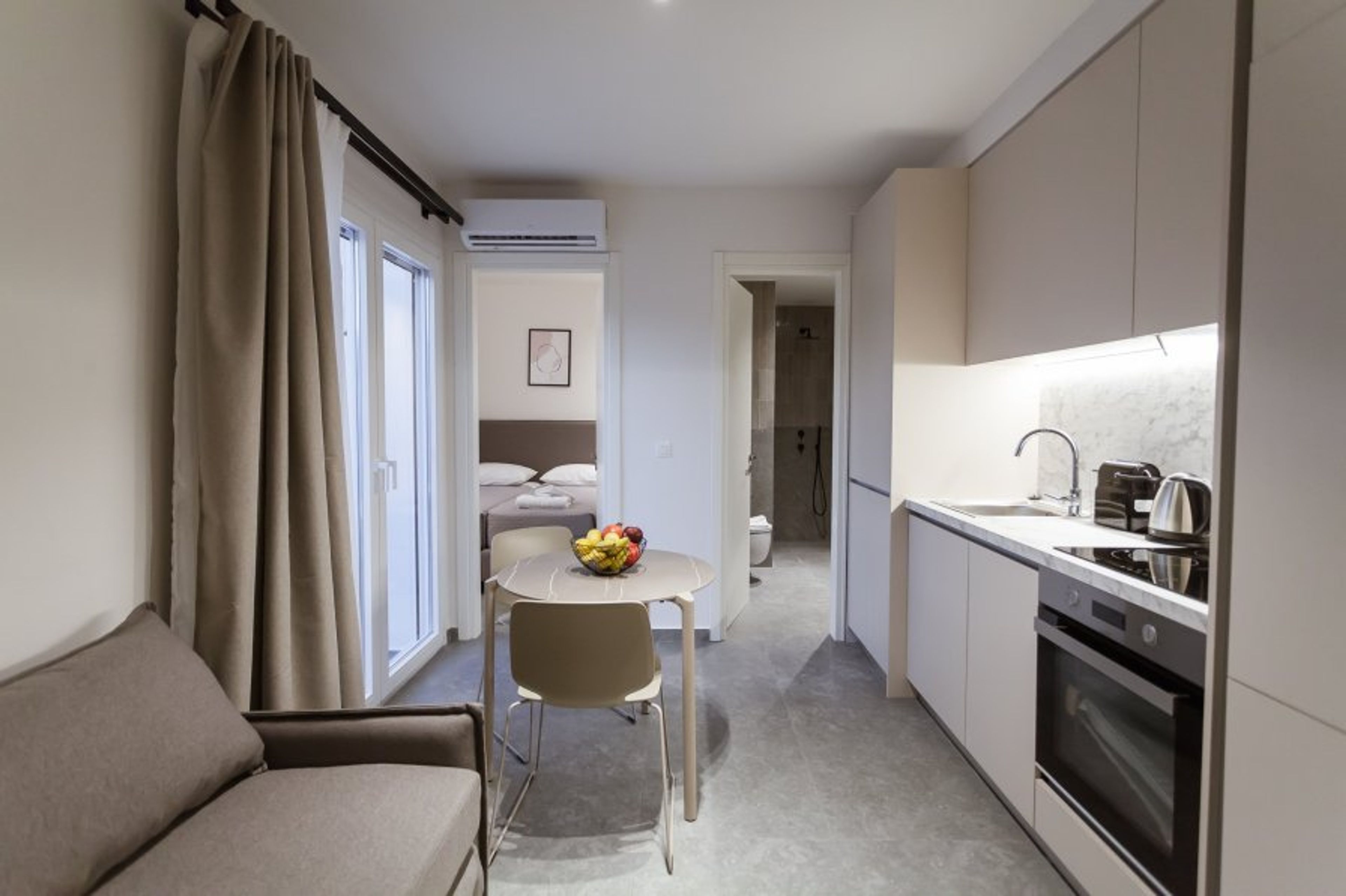 This incredible Apartment is found on the second floor and accommodates up to 2 guests. It has a stylish bedroom with a double bed decorated in a modern design. All areas are fully airconditioned and offer free WIFI access. The apartment has a fully equipped kitchen that is suitable for any meal preparation accompanied by a seating area. Outdoors, there’s a balcony where you can relax and enjoy the summer atmosphere.