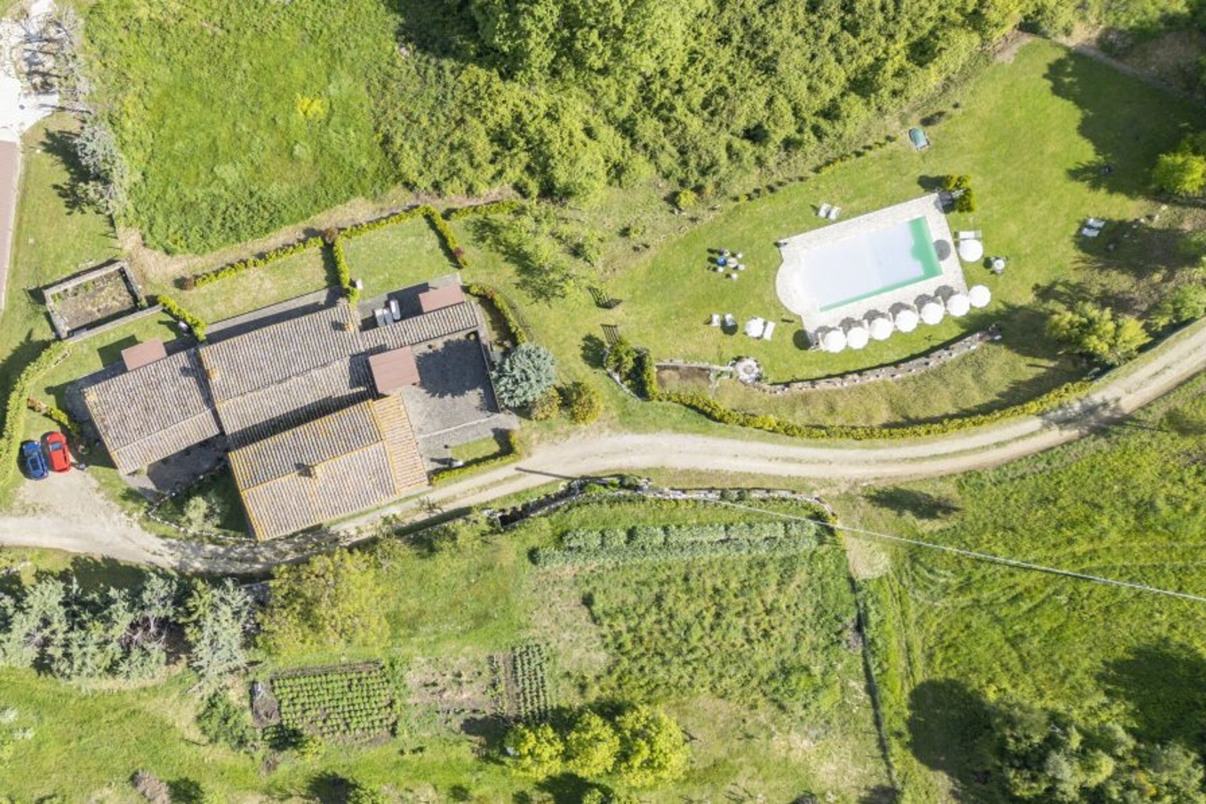 The exterior of the farmhouse is characterised by a large garden where you will find the beautiful 72-square metre swimming pool, shared, overlooking the surrounding hills.
