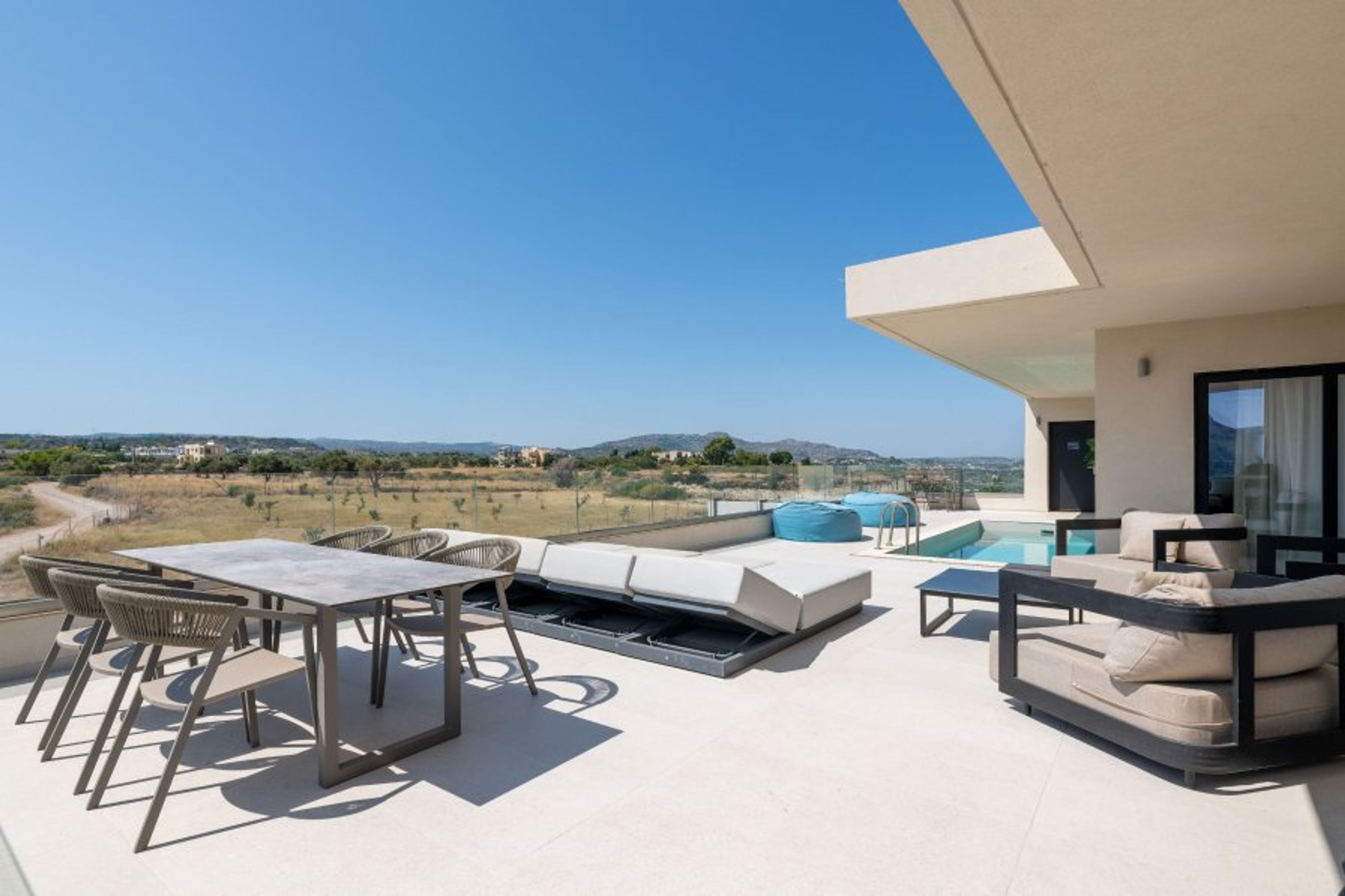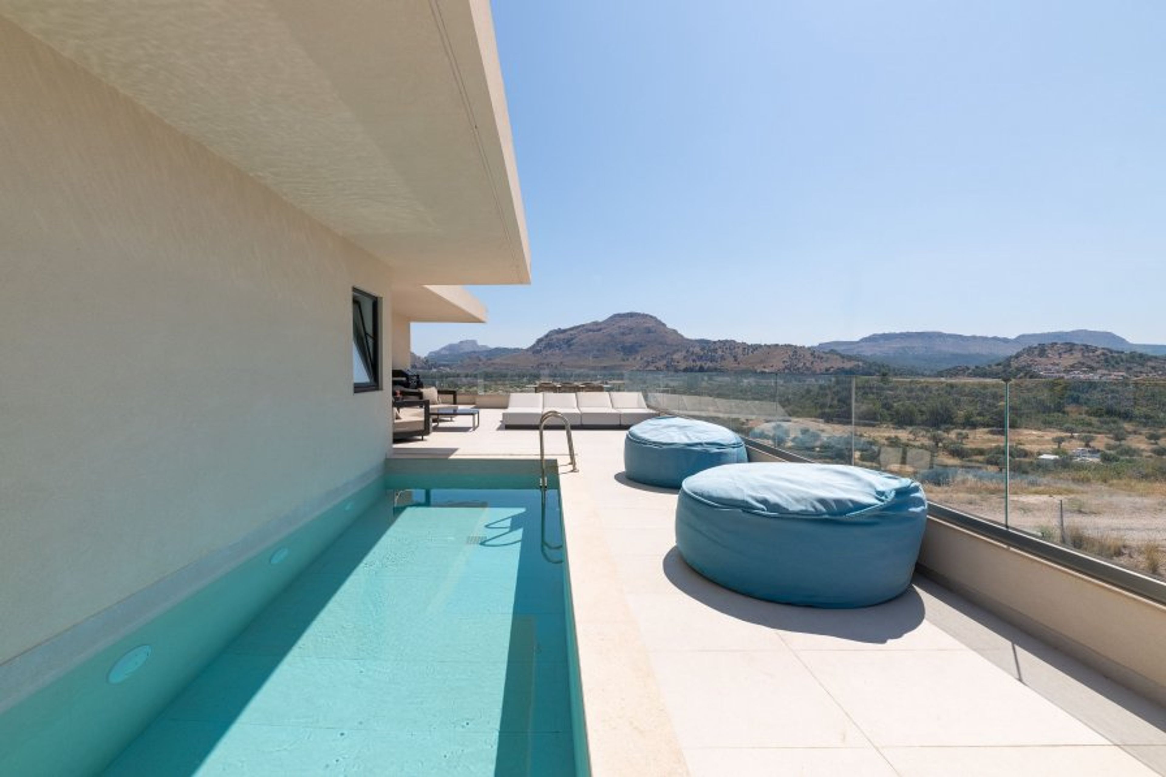 Each apartment hosts up to 4 guests. There are 2 fully air-conditioned bedrooms with unique decorations. All of the bedrooms offer ensuite bathrooms with a shower.There’s a fully equipped kitchen in warm colors, suitable for any meal preparation accompanied by the seating area and the living room. There’s a smart TV and free WIFI access throughout the property. Outdoors, there’s a private swimming pool ,with sunbeds and a seating area where you can relax under the rays of the Aegean sun. You can spend your time by your private swimming pool or enjoy a fresh meal prepared in the BBQ installation. This amazing property and the beautiful location make the perfect match for a memorable stay and unforgettable holidays in Rhodes!