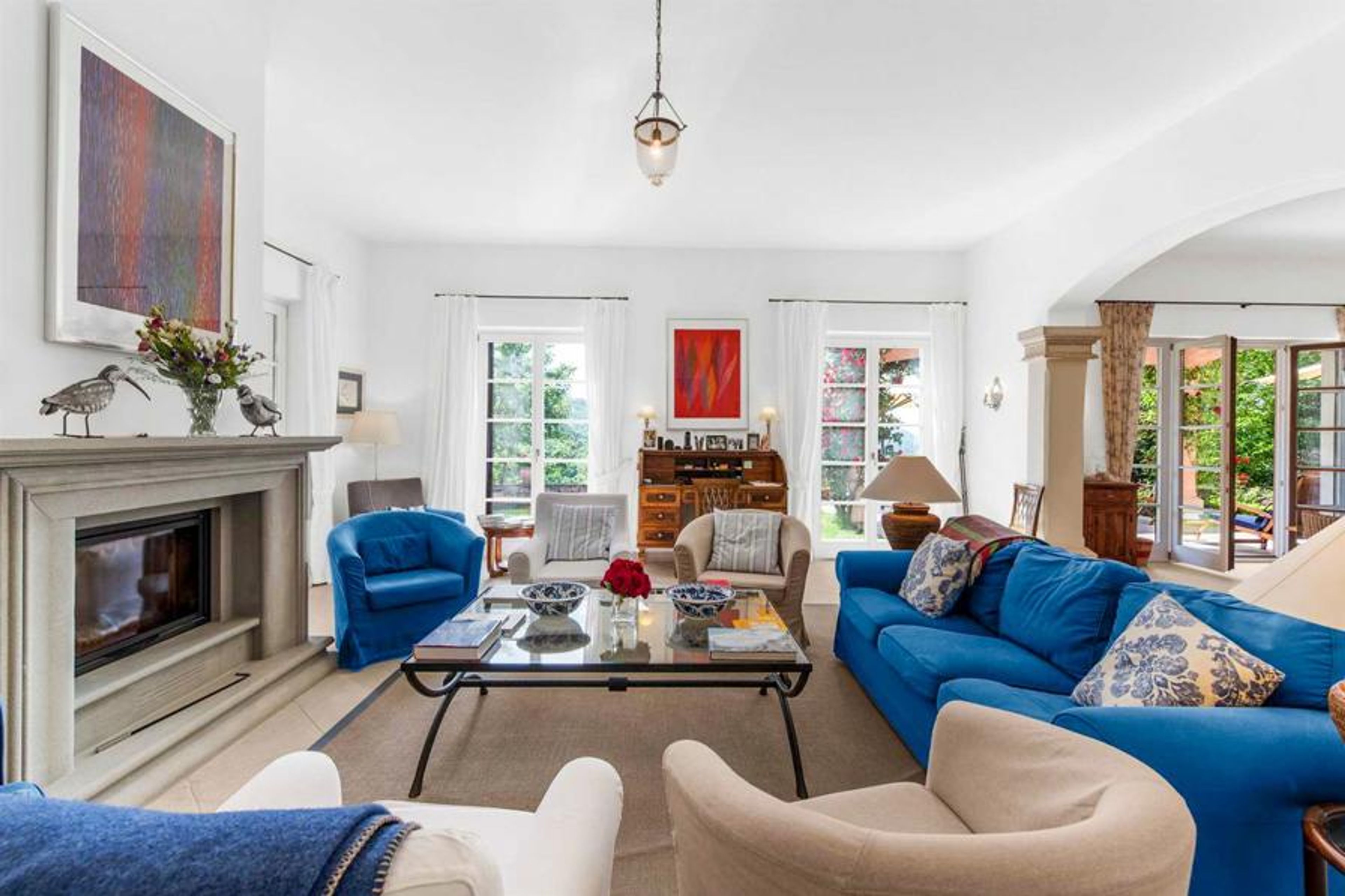 From the terrace, follow the winding path down to the sizable garden house and swimming pool, with deck chairs, a lounge area, al fresco dining furniture, a summer kitchen and a barbecue. Work up a sweat in the villa’s private fitness centre or putting on the minigolf course before diving into the cool, turquoise pool.