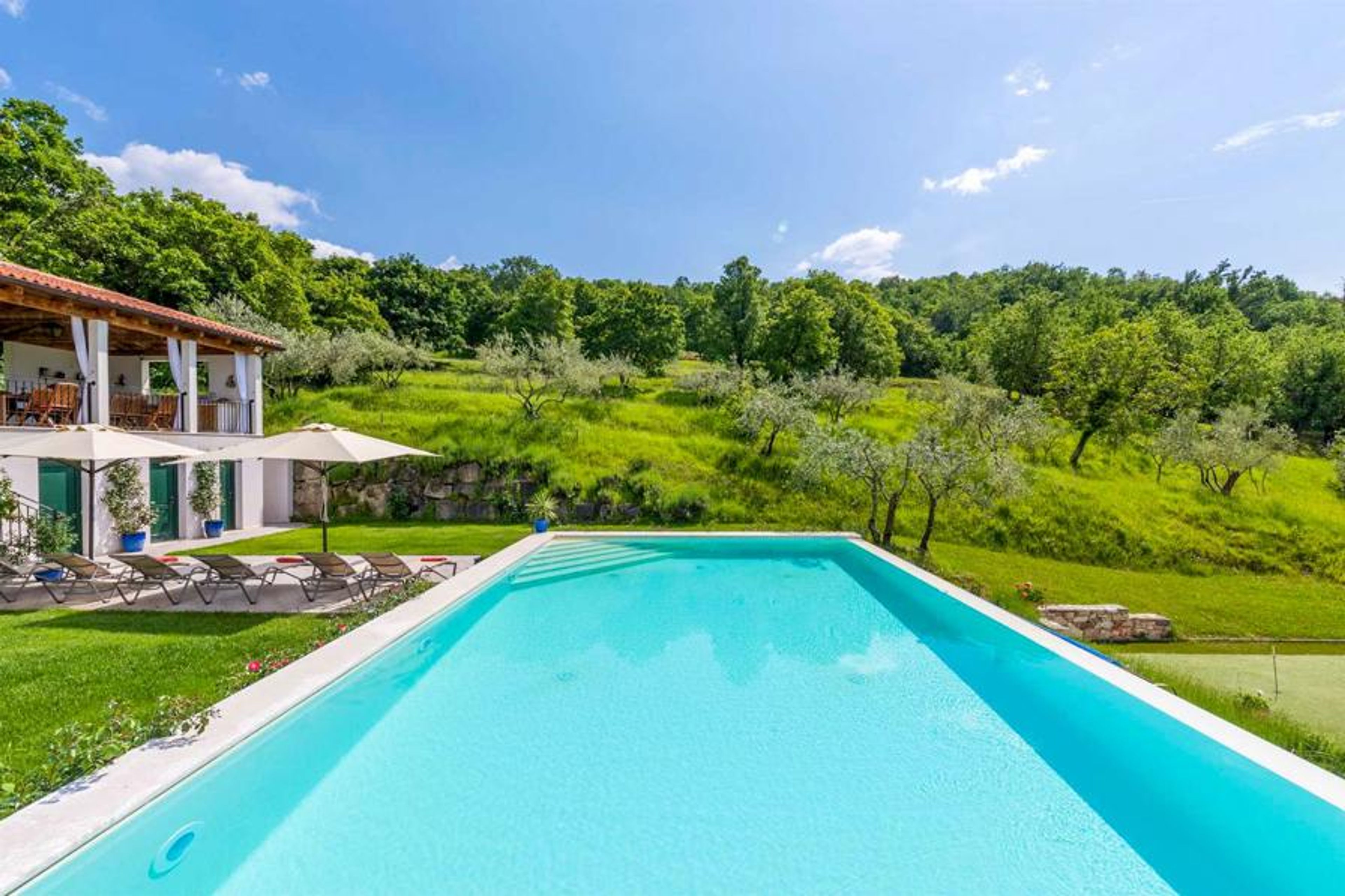 The villa’s countryside location near Croatia’s border with Slovenia makes it rich in leisurely walks and bike rides in easy proximity. Take off into the surrounding valley to discover its many wonders, including the astounding Zingarella Waterfall (30-minute walk), Momjan Castle (30-minute walk), or Waterfall Butori (100-minute walk).