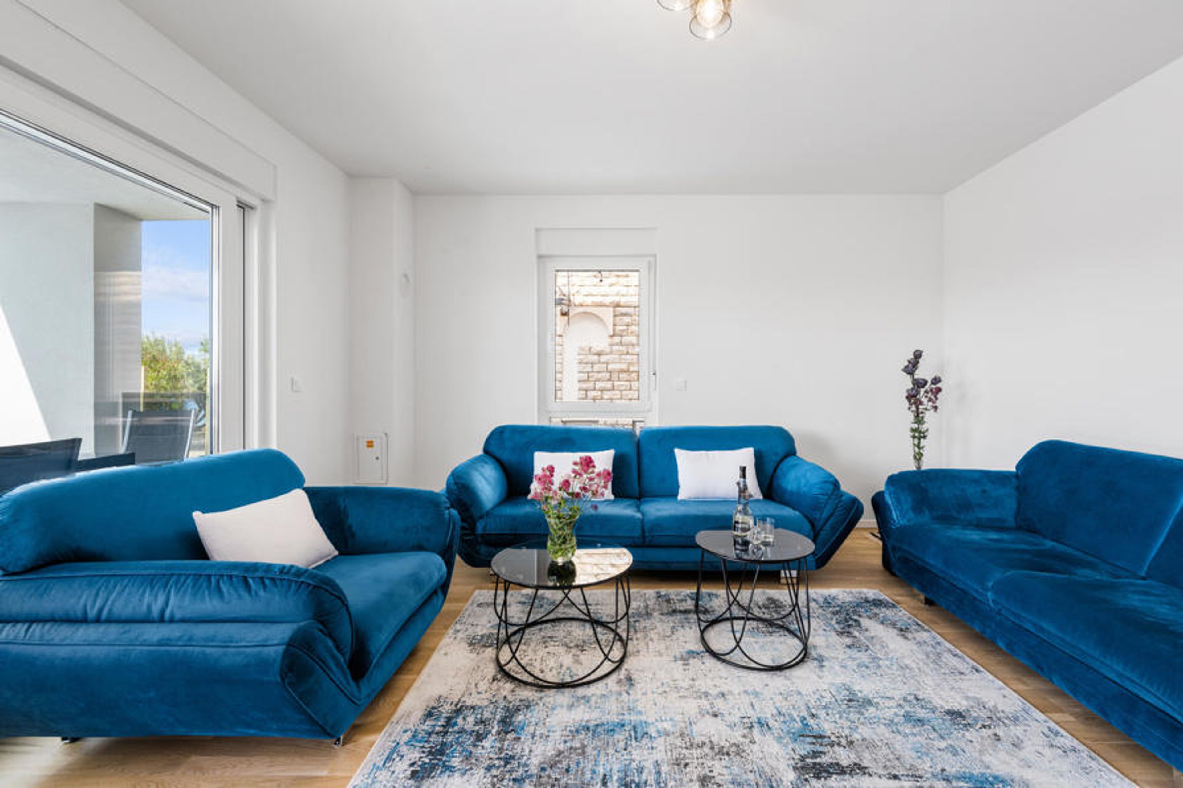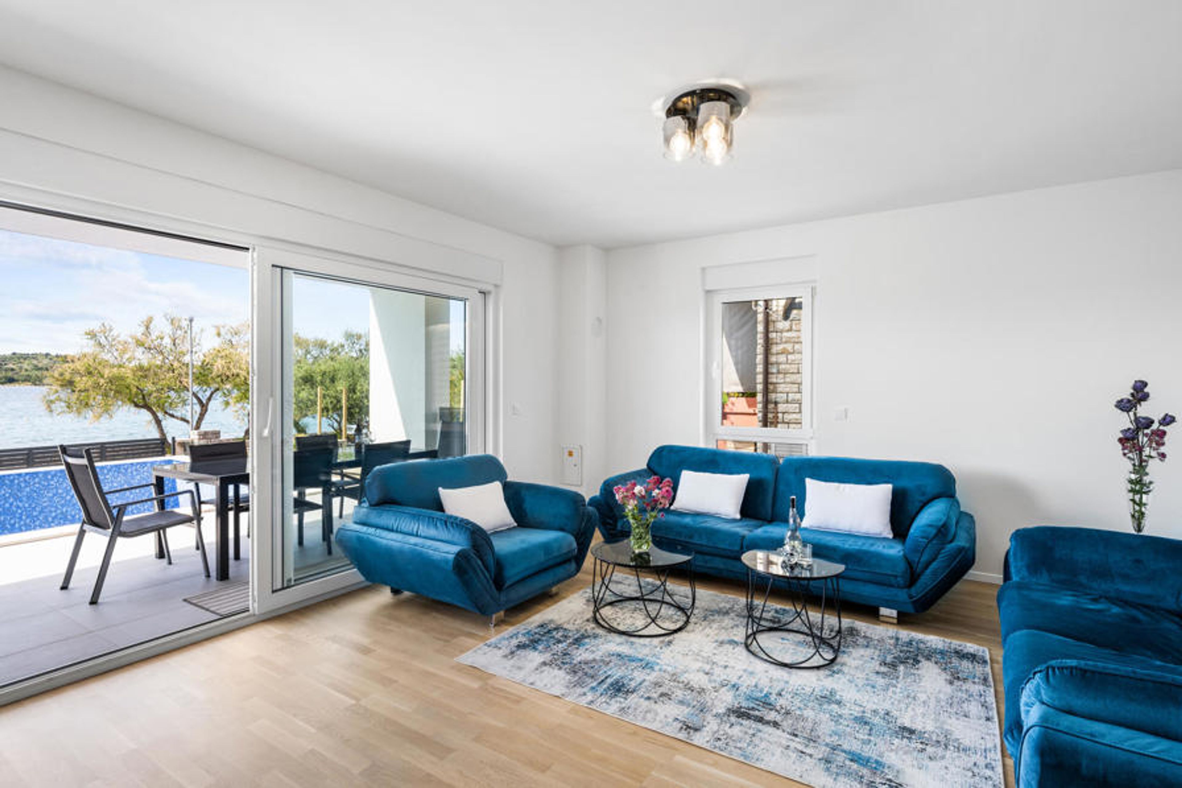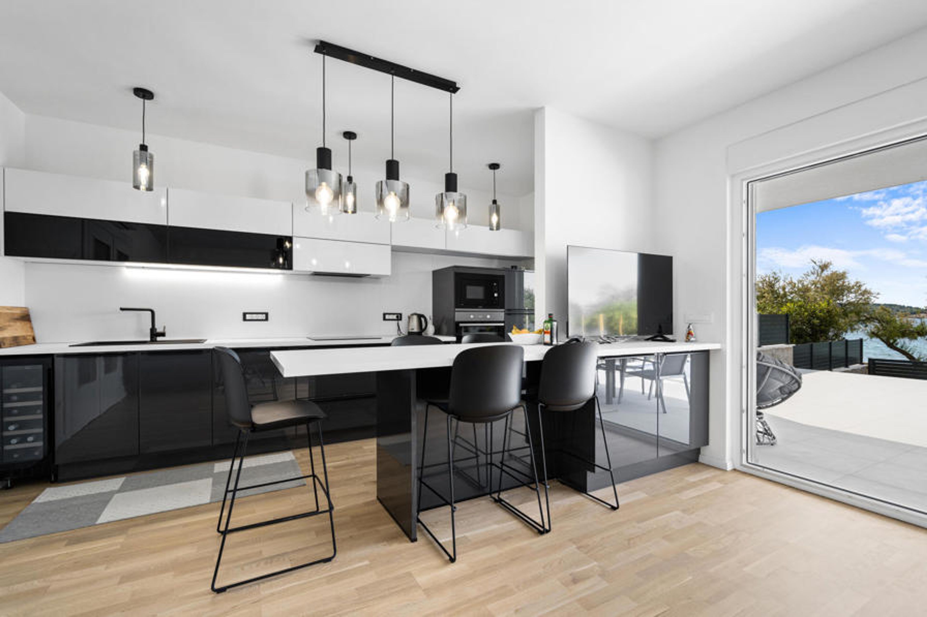 Beautiful and modern apartment with private pool in the first row of water in Vodice. Elegance, comfort and light-flooded rooms await you in this tasteful apartment on the first floor.