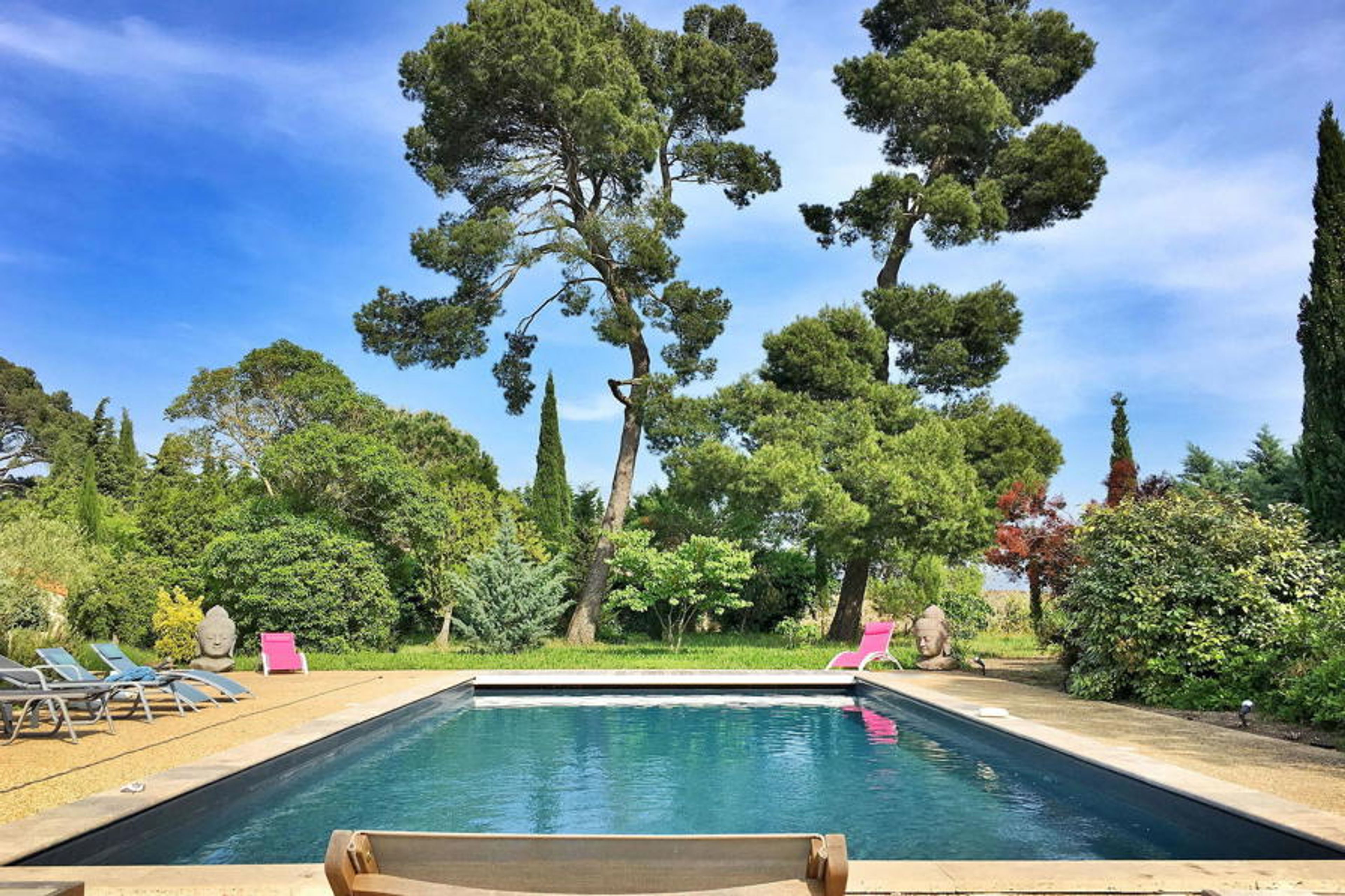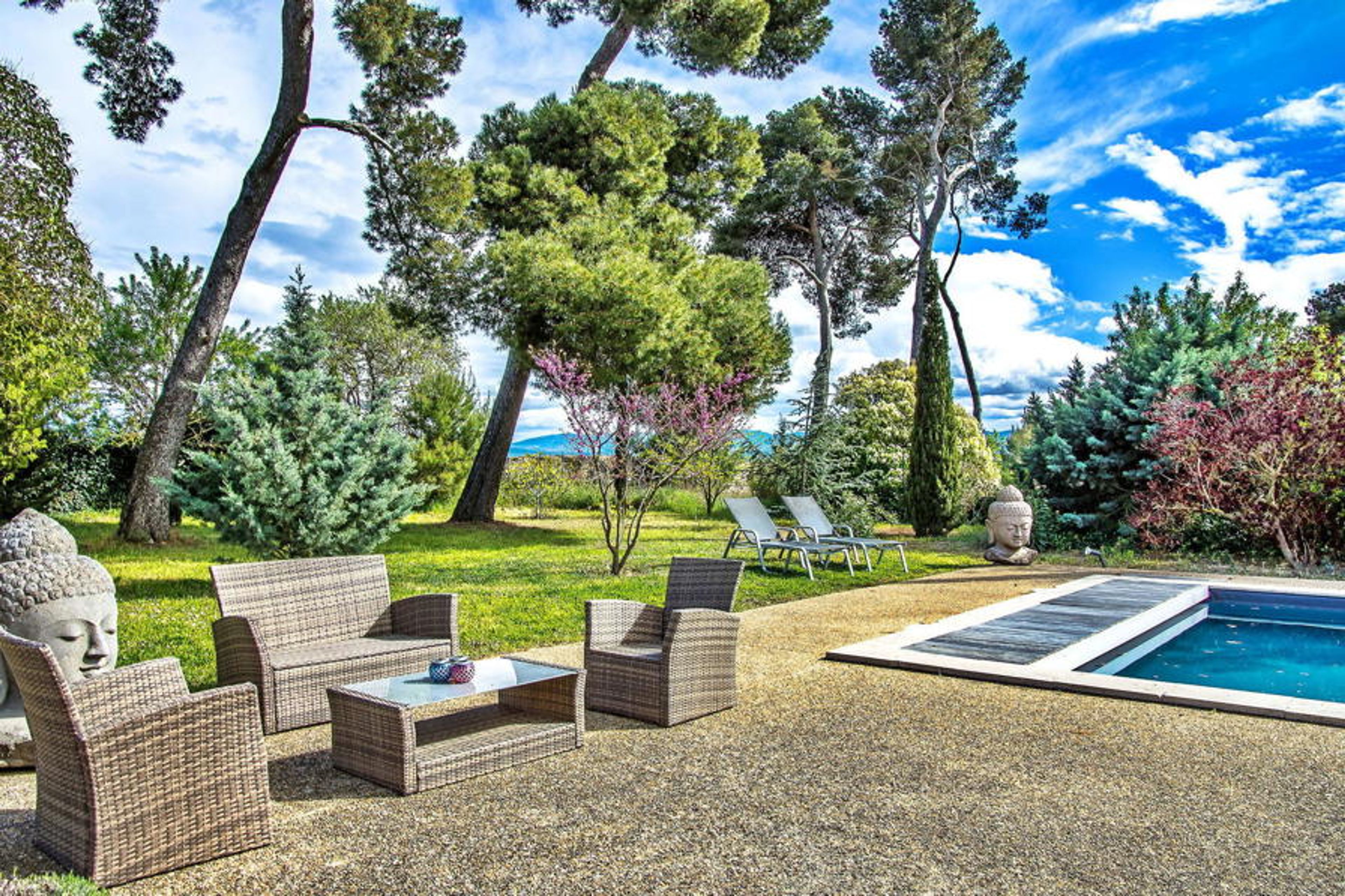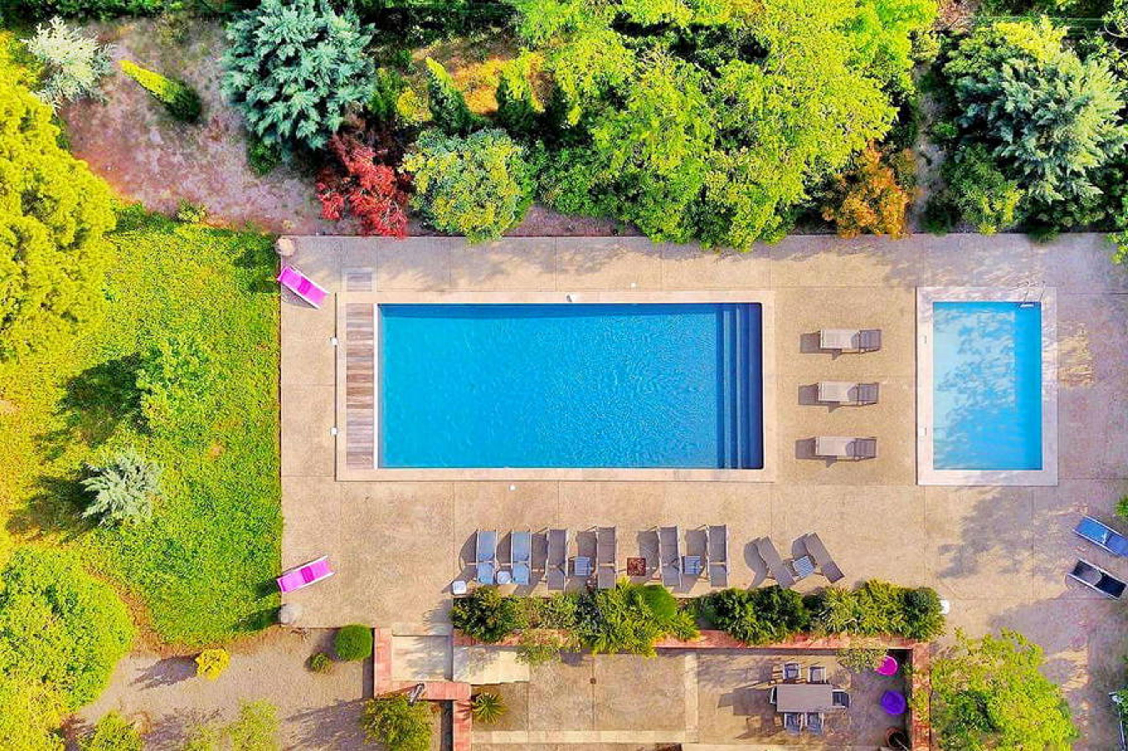 Nestled within a vast vineyard, this rental comprises two parts - the former dovecote and the red house. In the former dovecote, a spacious living area and kitchen can be found on the ground floor, while the four air-conditioned bedrooms are spread across the floors, each with private bathrooms. The red house features a living room, kitchen, terraces, and five bedrooms with shared and ensuite bathrooms. Outdoors, amenities include a pool house with barbecue, heated pool, children's paddling pool, pétanque, and table tennis. Owners reside on-site in a separate dwelling.