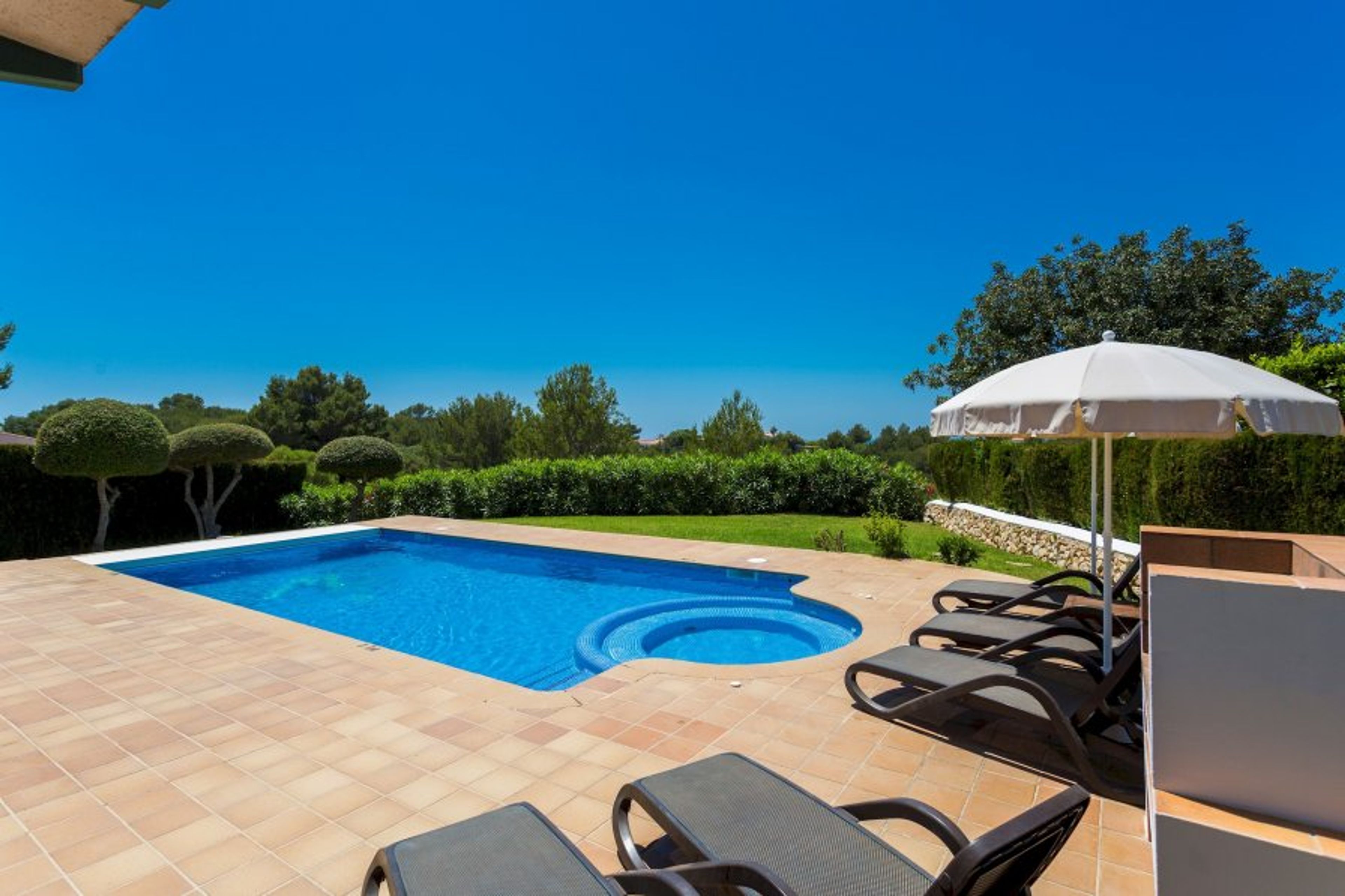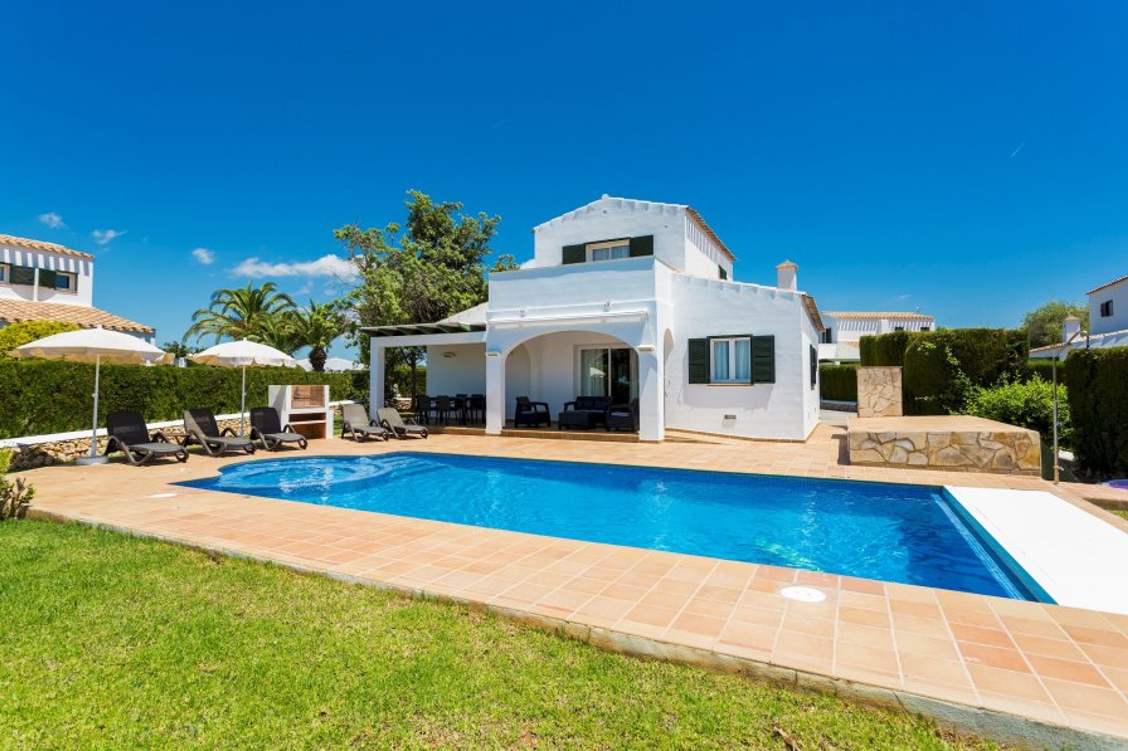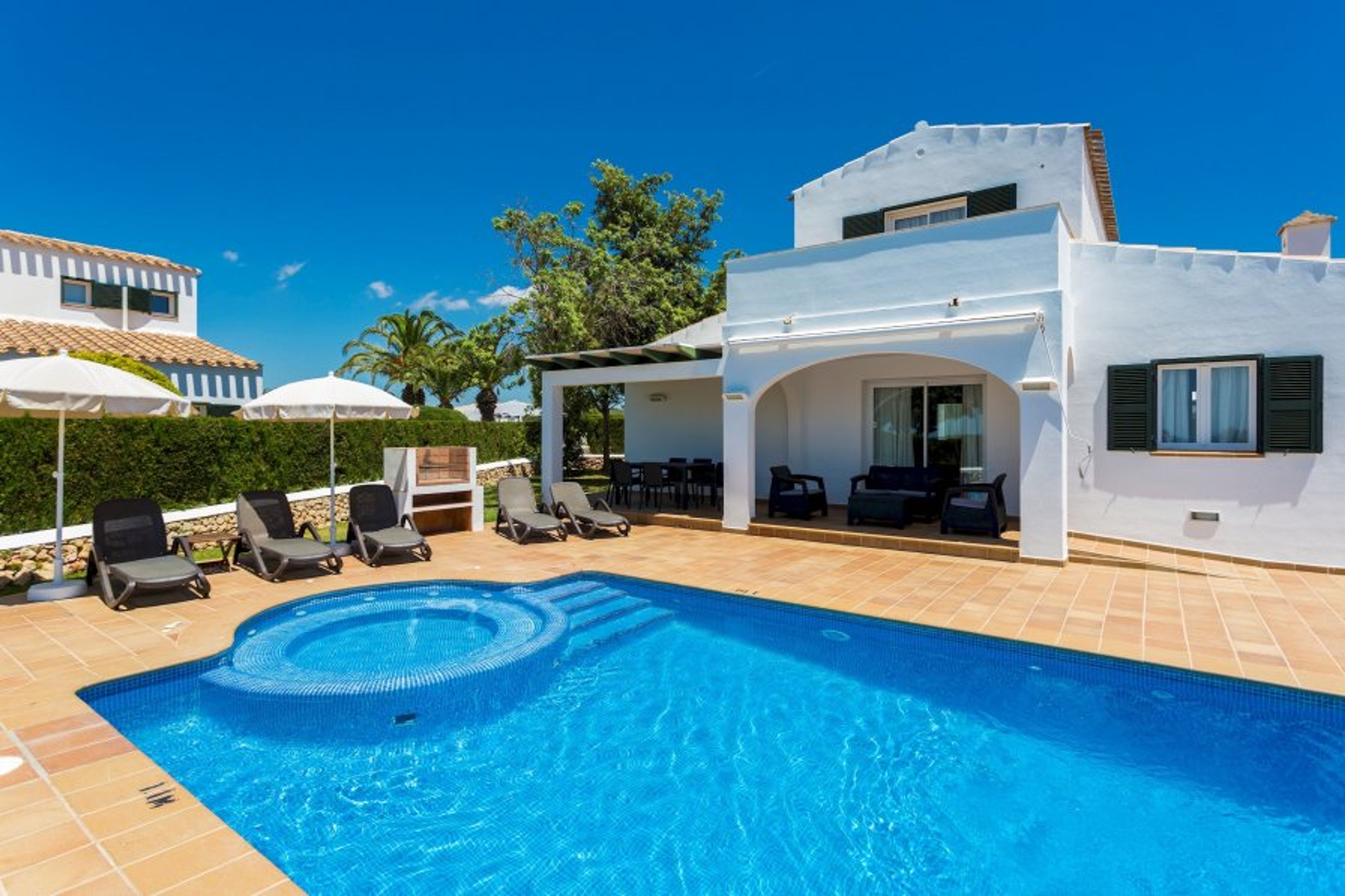 Dream Holidays in Menorca: Private Villas with Pool and Sea Views in Son Bou – Finesse Type 2 Villas. Discover Finesse Type 2 Villas, our exclusive complex of 7 private villas in Menorca. Each villa features 3 bedrooms, 3 bathrooms, and a private pool, in a tranquil setting that blends Menorcan elegance with modern architecture and carefully selected design details. Enjoy an unforgettable holiday with comfort and style in every corner. Prime Location and Sea Views. Perched atop Torre Soli hill, these two-story villas offer panoramic views of the Menorcan countryside and the Mediterranean Sea, combining privacy with a spectacular natural environment. Sleeping up to 6 people, they are the ideal accommodation for families or groups seeking comfort and exclusivity. Charming Interiors. Each villa is designed for comfort and style: a spacious living room with rustic cherry wood furniture, a Smart TV, and Wi-Fi; a fully equipped kitchen; and a dining area with a glass table and modern chairs, perfect for family dinners or gatherings with friends. Master suite with private terrace, located on the upper floor, with an extra-large bed, dressing room, and en-suite bathroom with bathtub, decorated in Mediterranean tones with a modern touch. Second bedroom on the lower floor, bright and with character, with a full bathroom and hydromassage shower. Third bedroom with white, orange, and green details, ideal for children, with an additional full bathroom with hydromassage shower. Private pool and panoramic terrace. The exterior is a true paradise: A 40 m² private pool with a jacuzzi, surrounded by sun loungers and a parasol to enjoy the Mediterranean sun. A spacious covered terrace with a large table and comfortable armchairs, ideal for al fresco dining and unforgettable sunsets. Built-in barbecue for dinners with family or friends. Large, well-maintained garden with lawn, flowers, native shrubs, and cypress trees, creating an intimate and relaxing atmosphere. Explore Menorca from your doorstep. Experience the island from the comfort of your villa. Explore hidden coves, enjoy authentic local cuisine, and immerse yourself in Menorca's unique culture. Renting a car will allow you to make the most of all the experiences that the Son Bou area and its surroundings have to offer. Book your stay at Villas Finesse Type 2 now and enjoy a dream vacation in Menorca.
