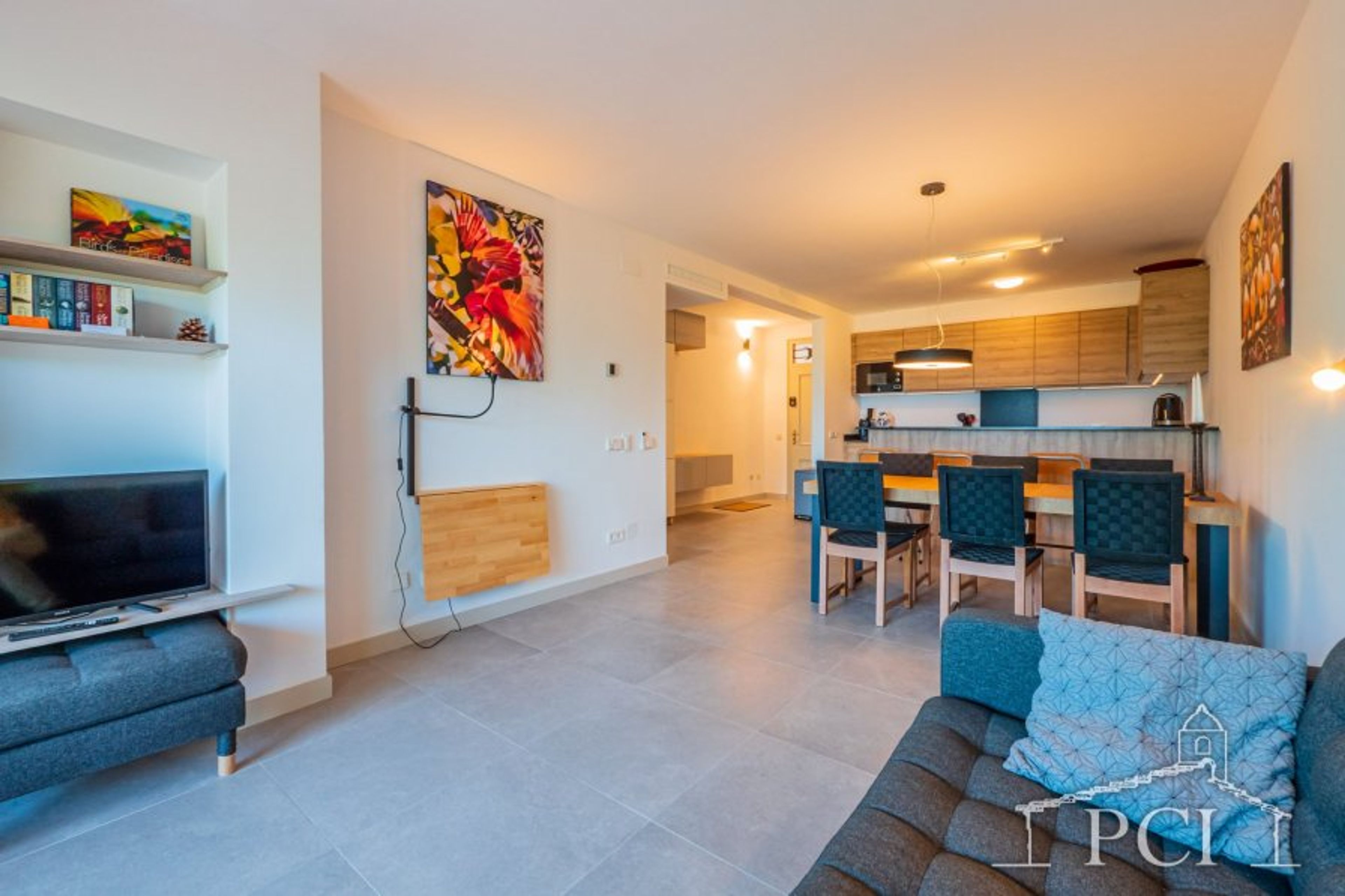 Modern stylish apartment recently renovated with a large living-dining room with access to terrace, open well equipped kitchen with: oven, microwave, dishwasher and a choice of coffee makers. Guest WC, full bathroom with designer bath/shower, washing machine, 2 double bedrooms with wardrobes and exit to terrace, one with double bed and the second with 2 single beds.