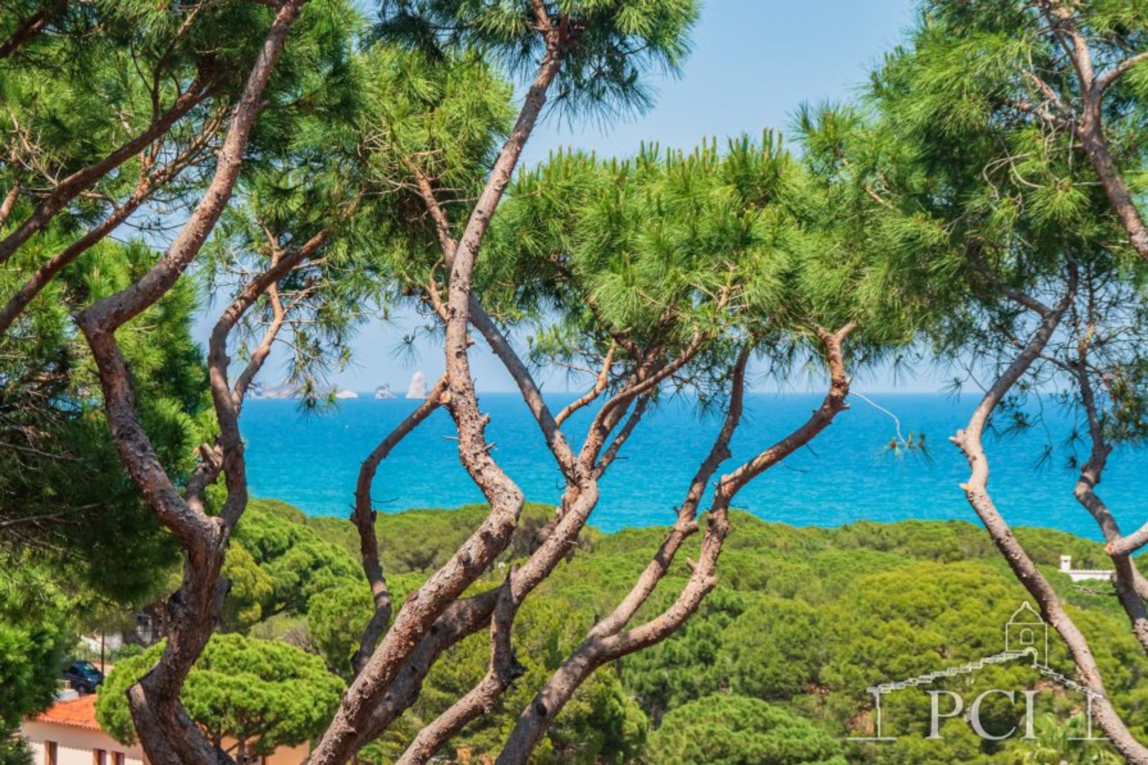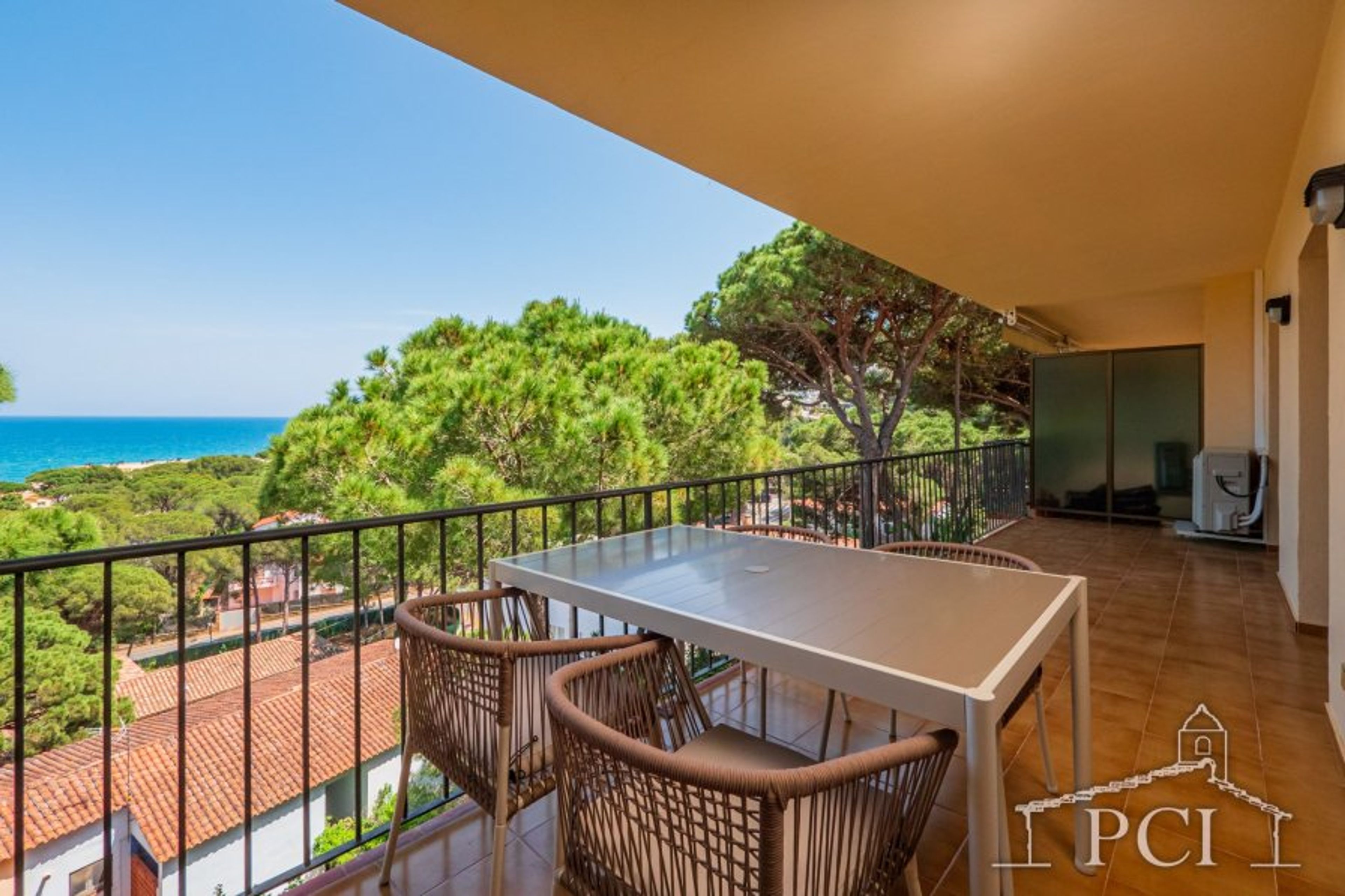 Terrace overlooking the sea and pine trees.