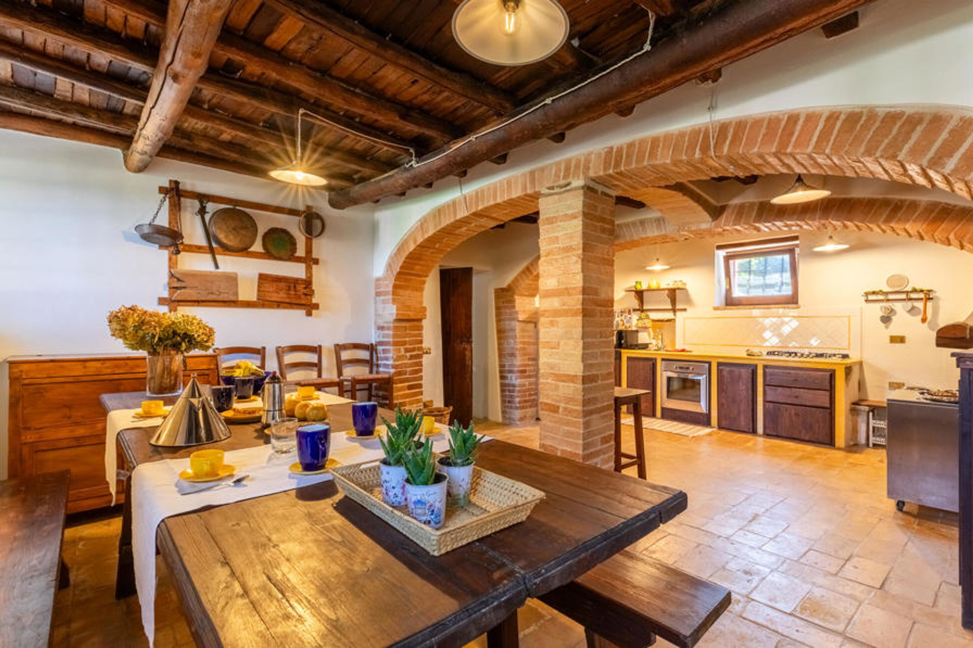 If you are looking for peace, privacy, high living comfort, several entertainment options and many square meters for your family reunion in lush Umbria, you have come to the right place. The property with private outdoor pool in beautiful natural surroundings promises you an exceptional living experience that you will never forget. Elegance and sophistication meet modern and rustic elements in this stately home. Vaulted ceilings, fantastically high ceilings, dark ceiling beams and brick arches create a special atmosphere in which you can relax with your extended family and enjoy cozy get-togethers, be it chatting in front of the large fireplace, eating good food or playing billiards. You can look forward to wonderful cooking evenings in the kitchen, where you will feel as if you have been transported back to the year 1600. But you will certainly spend most of your time by the pool and in the huge garden, where all kinds of entertainment options await you.