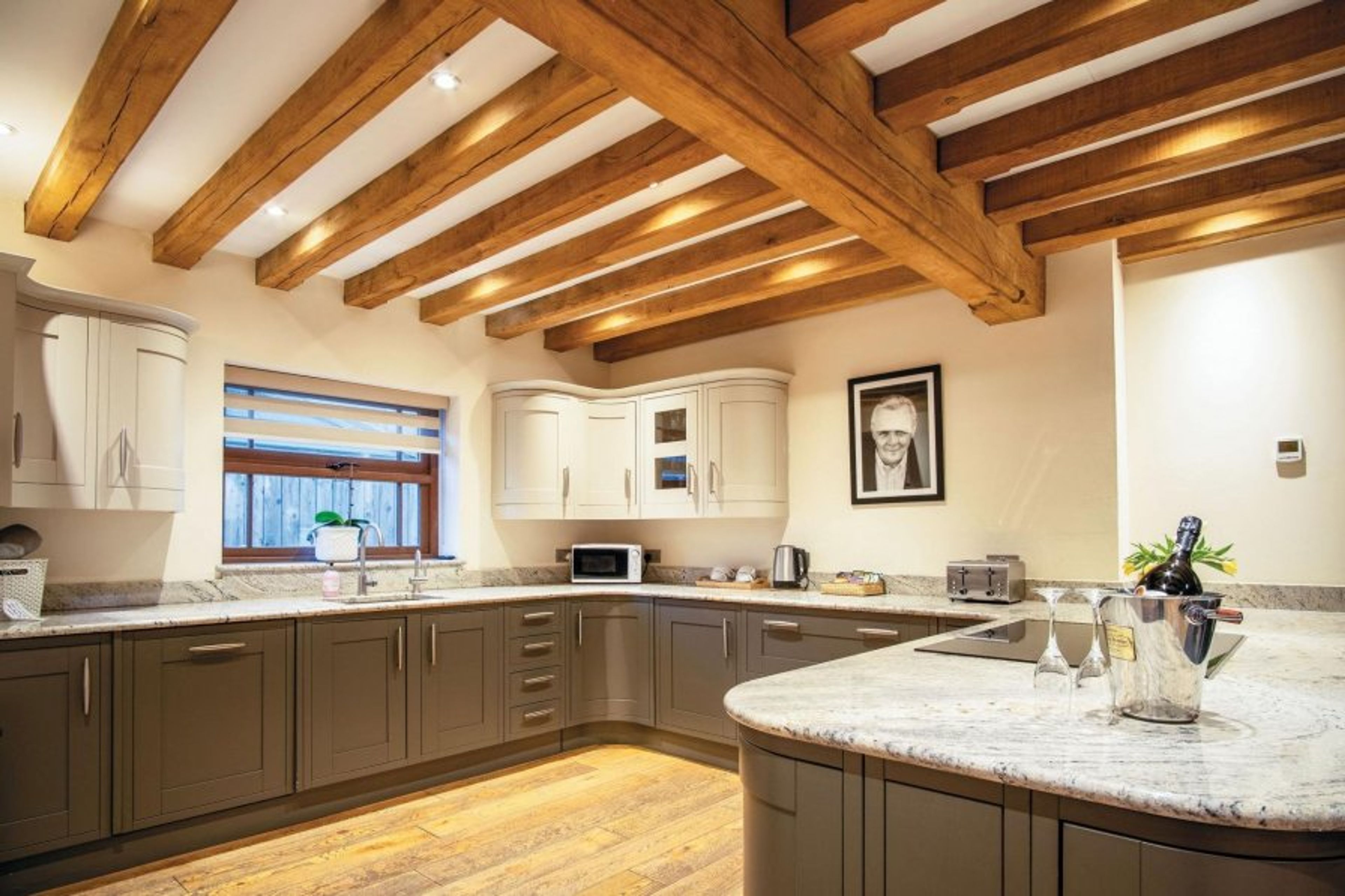 The open-plan lounge boasts two distinct areas, one adorned with plush leather sofas cozily nestled around a charming log burner - the perfect setting for winter evenings. The other area offers a comfortable sofa facing the TV, complemented by high-speed WiFi for your entertainment. A downstairs toilet and hand basin ensure the utmost convenience for all 6 guests.
