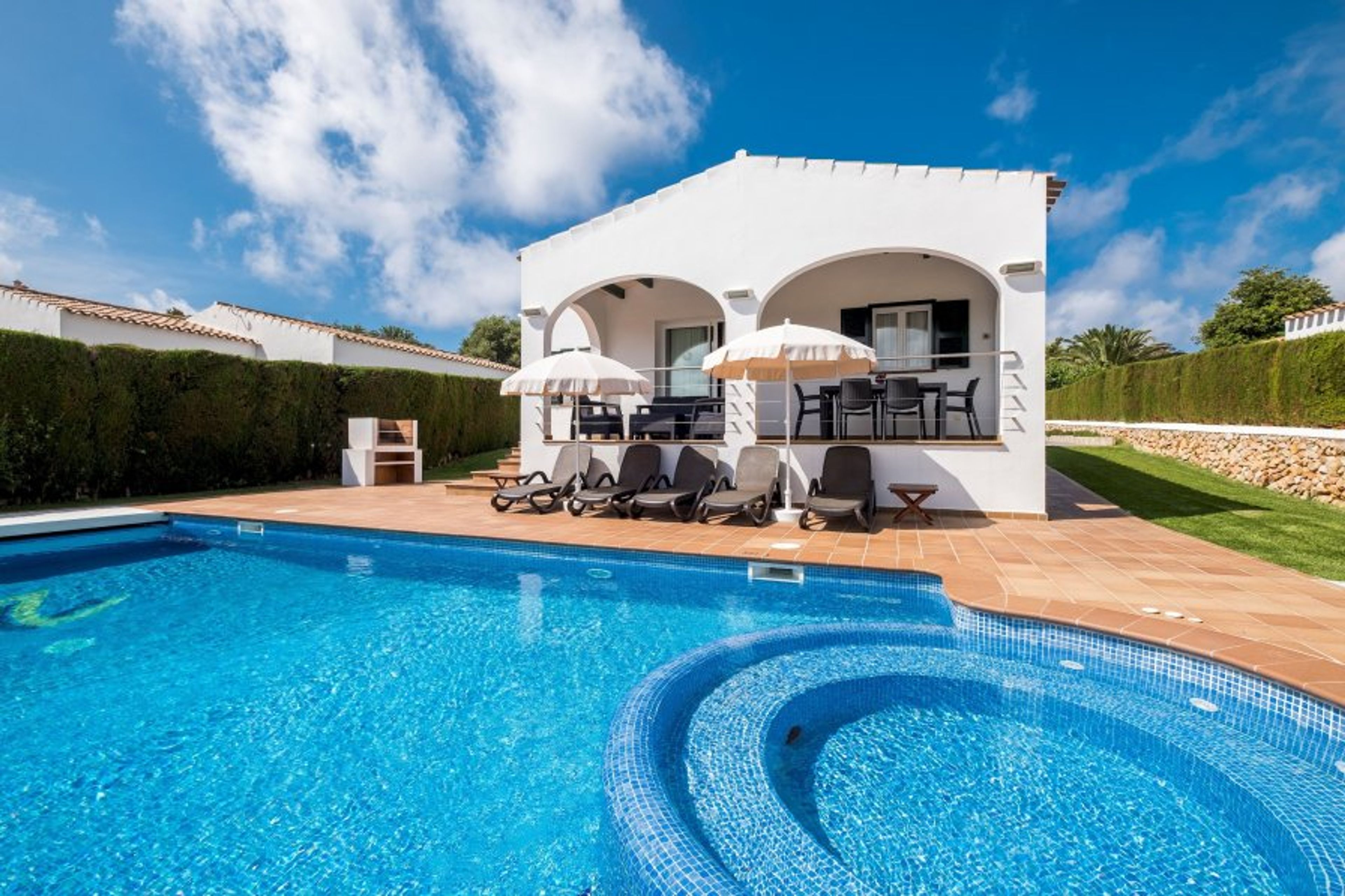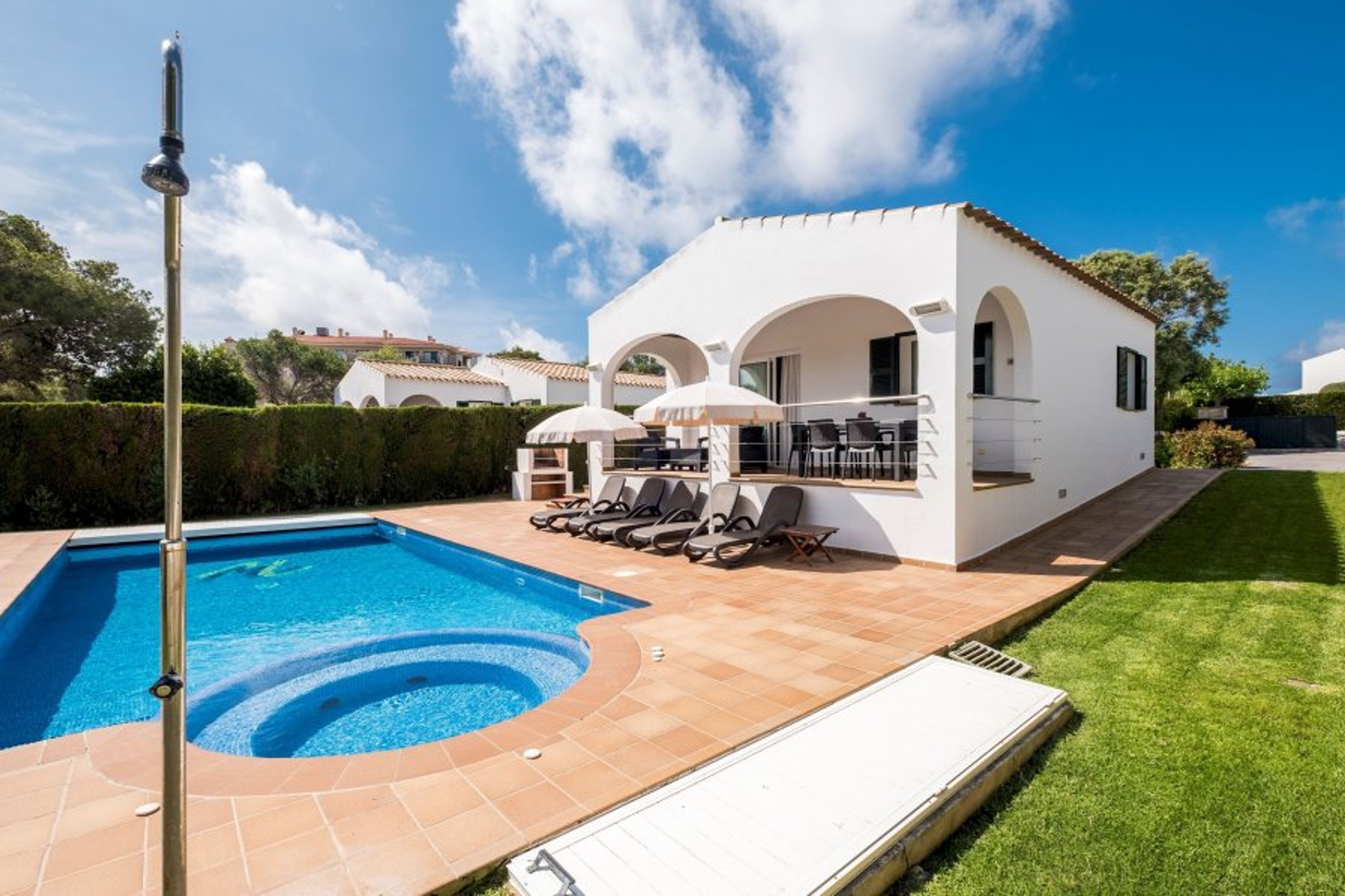 Dream Holidays in Menorca: Private Villas with Pool in Son Bou – Finesse Type 1 Villas. Discover Finesse Type 1 Villas, our exclusive complex of 7 private villas in Menorca. Each villa features 3 bedrooms, 3 bathrooms, and a private 9 x 4 meter pool, all in a tranquil and relaxing setting that blends Menorcan elegance with modern and sophisticated design. Enjoy an unforgettable holiday in fully equipped accommodations with carefully selected designer furnishings. Prime Location: Situated atop Torre Soli hill, our villas offer panoramic views of the picturesque Menorcan countryside. The location allows you to enjoy tranquility, privacy, and easy access to Son Bou beach, shopping areas, and local restaurants. Charming Interiors: Each villa is designed for comfort and style: Spacious living room with rustic cherry wood furniture, SMART TV, and Wi-Fi. Fully equipped kitchen and dining area with a glass table and modern chairs. Master suite with an extra-large bed, dressing room, and en-suite bathroom with a bathtub. Second and third bedrooms, each with its own full bathroom, ideal for families with children or groups of friends. Private pool and panoramic terrace. Enjoy the outdoors with: A 9 x 4 meter private pool with a jacuzzi and sun loungers for relaxing in the sun. A spacious covered terrace with a large table and comfortable armchairs, perfect for al fresco dining and unforgettable sunsets. A built-in barbecue and a well-maintained garden with lawn, flowers, and cypress trees, creating an intimate and serene atmosphere. Explore Menorca from your doorstep. Discover the rich history and natural beauty of Menorca from the comfort of your villa. Explore hidden coves, savor authentic local cuisine, and immerse yourself in the unique culture of this enchanting island. Renting a car will allow you to make the most of all the experiences that the Son Bou area and its surroundings have to offer. Book your unforgettable stay at Villas Finesse Type 1 now and experience a dream vacation in Menorca.
