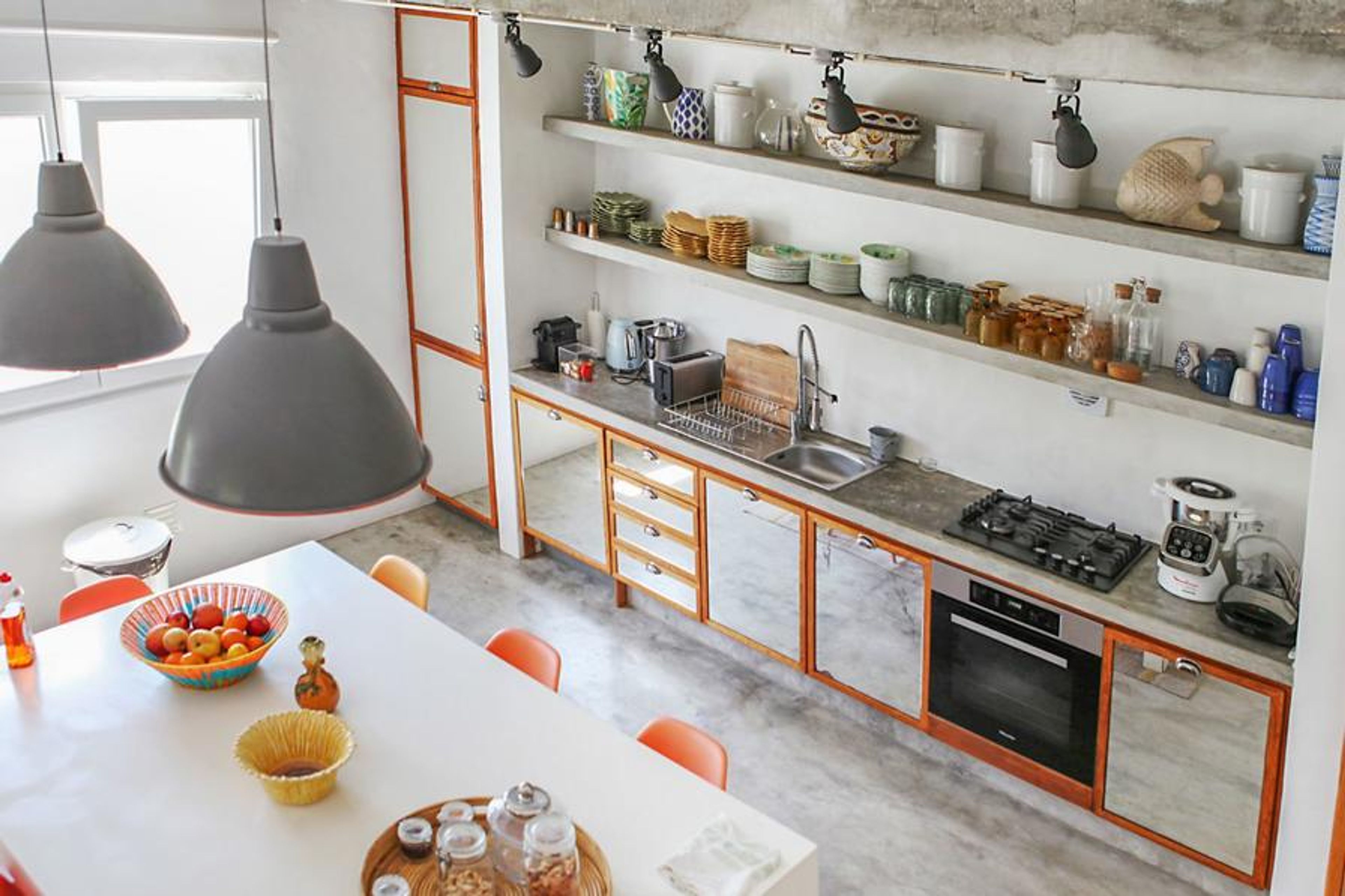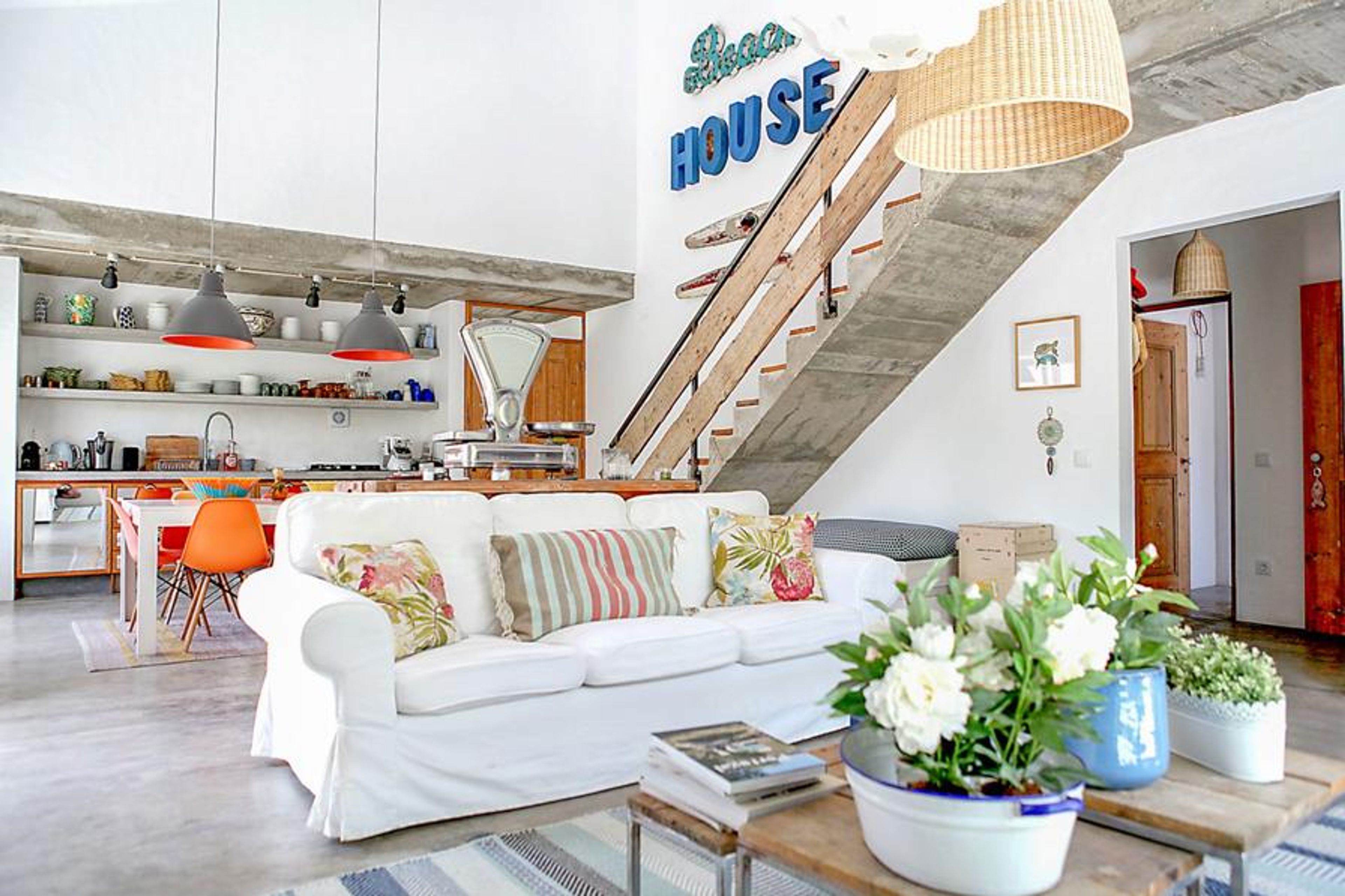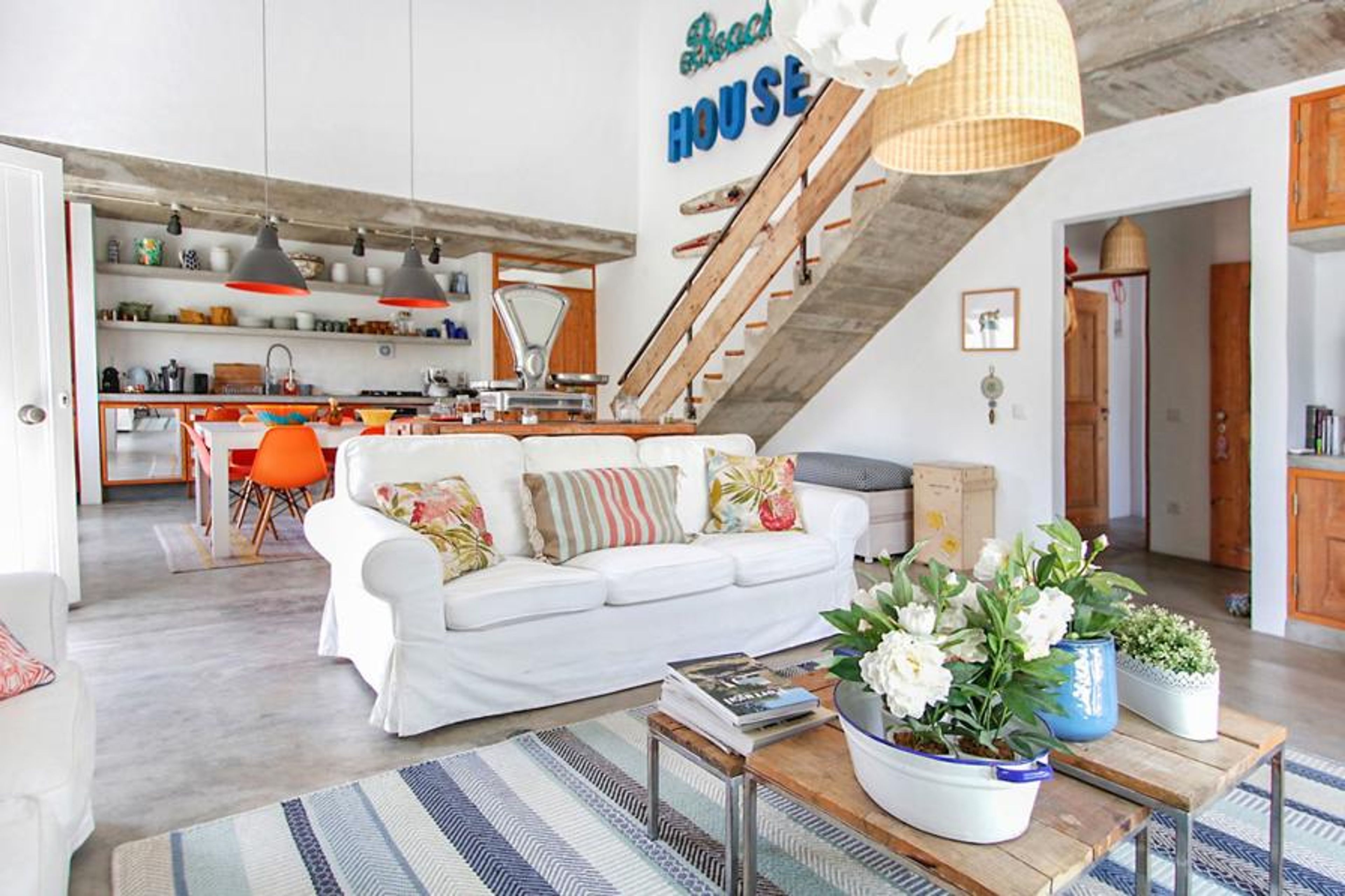 Step inside, and you're greeted by a beautiful open-plan living space that exudes a beach-house vibe. Dazzling white walls serve as a canvas, adorned with accents of driftwood that resonate with the coastal theme. The lounge area beckons with plush sofas and an inviting TV, setting the stage for relaxation and entertainment. The adjacent dining space, with its chic table and chairs, seamlessly connects to the gorgeous open-plan kitchen. Stylish and eclectic throughout, the villa incorporates pops of colour in the soft furnishings and decor, adding a playful touch to the sophisticated design.
