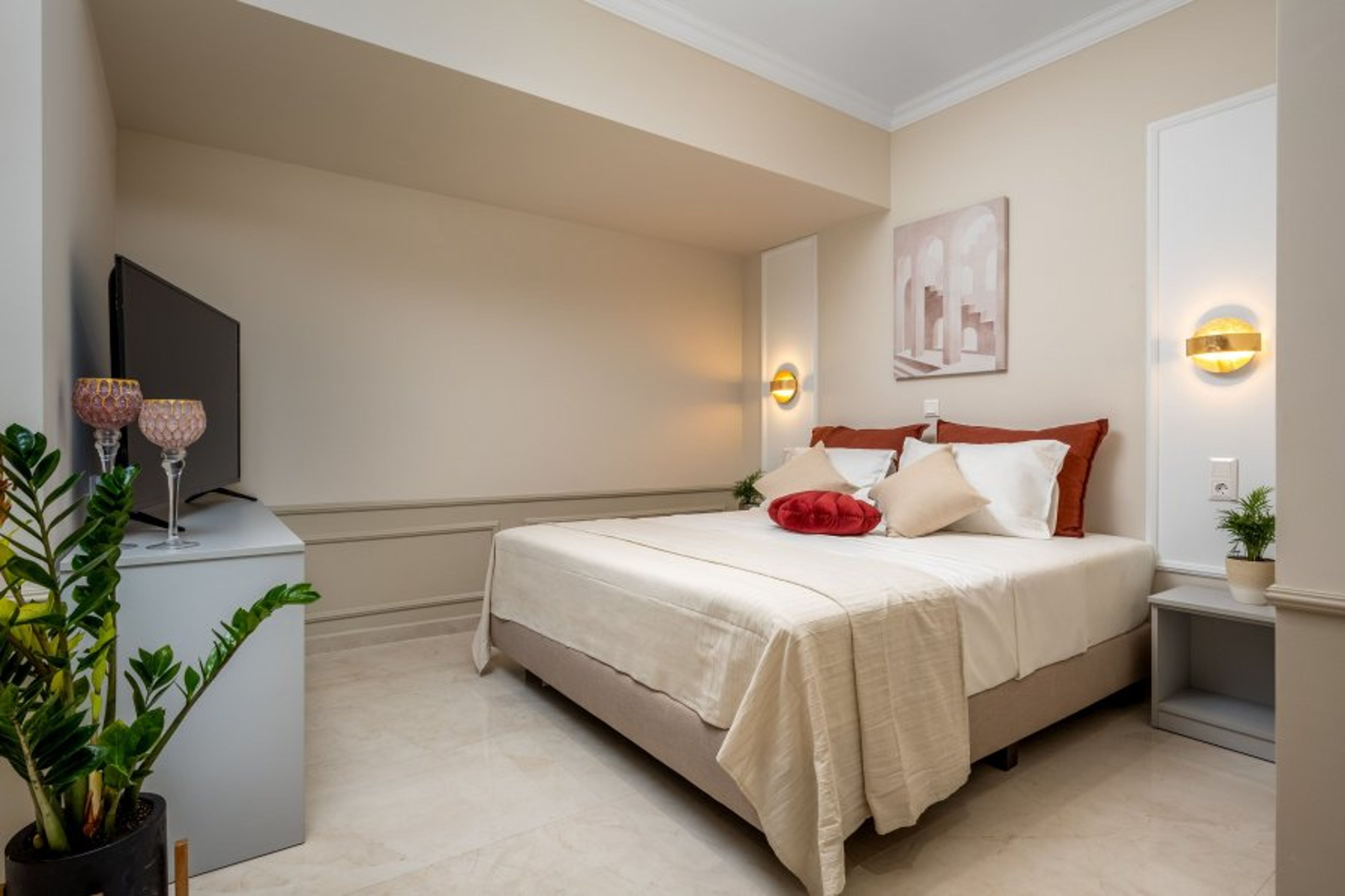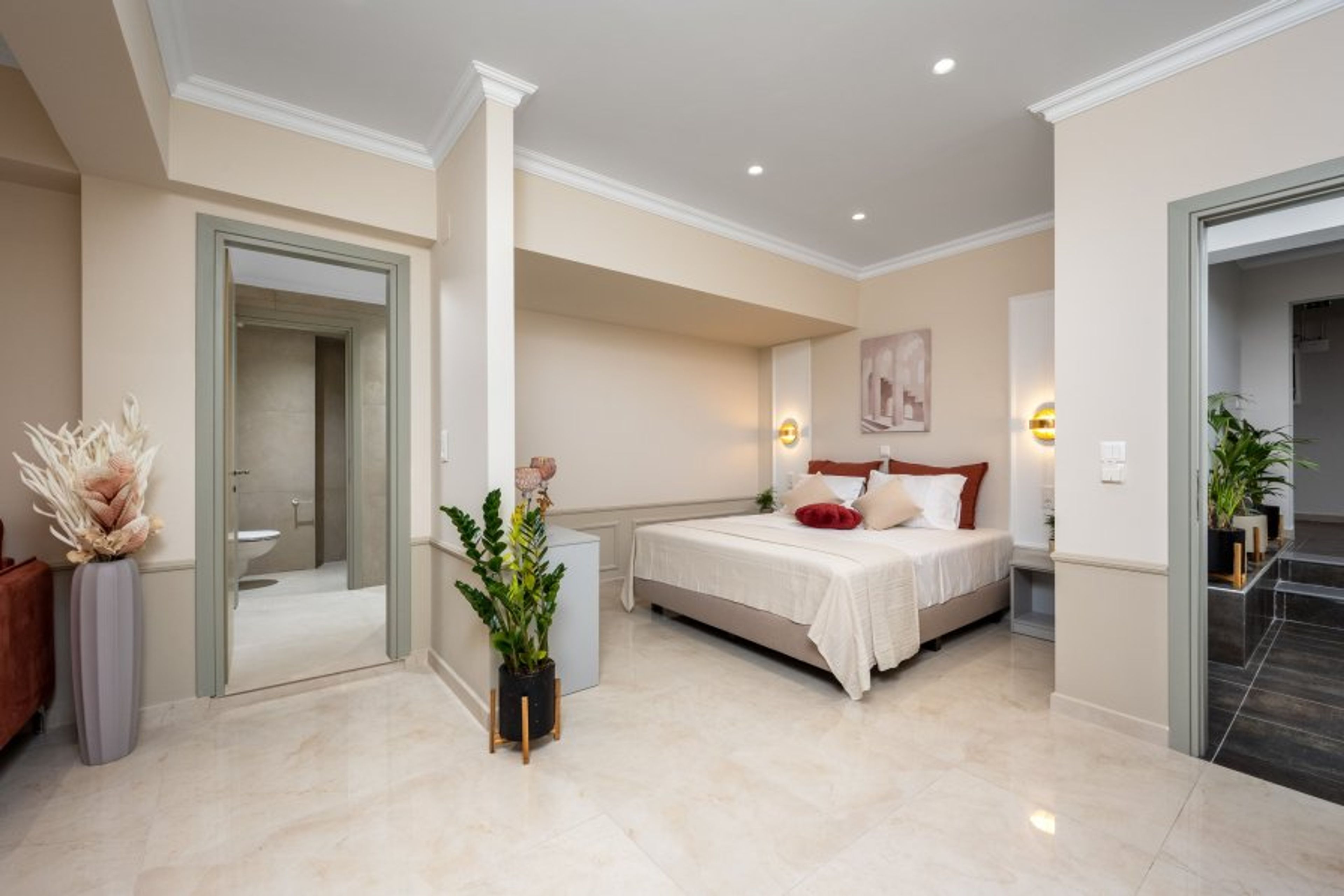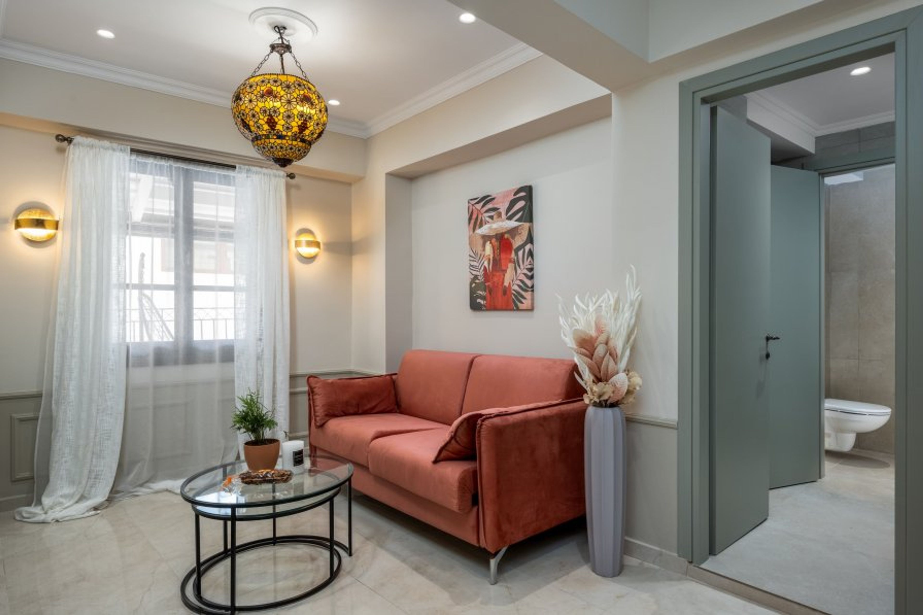 This suite is up to 3 guests and has one comfy bedroom with a spacious double bed and a sunny balcony. In addition, there’s a comfy single sofa bed. There’s a stylish bathroom with a shower and an internal heated jacuzzi for your ultimate relaxation. The property provides a smart TV and free Wi-Fi access. Also, there’s an electrical kettle and a minifridge. Guests can relax outside, in the wonderful furnished balcony surrounded by the historical medieval buildings of Rhodes.