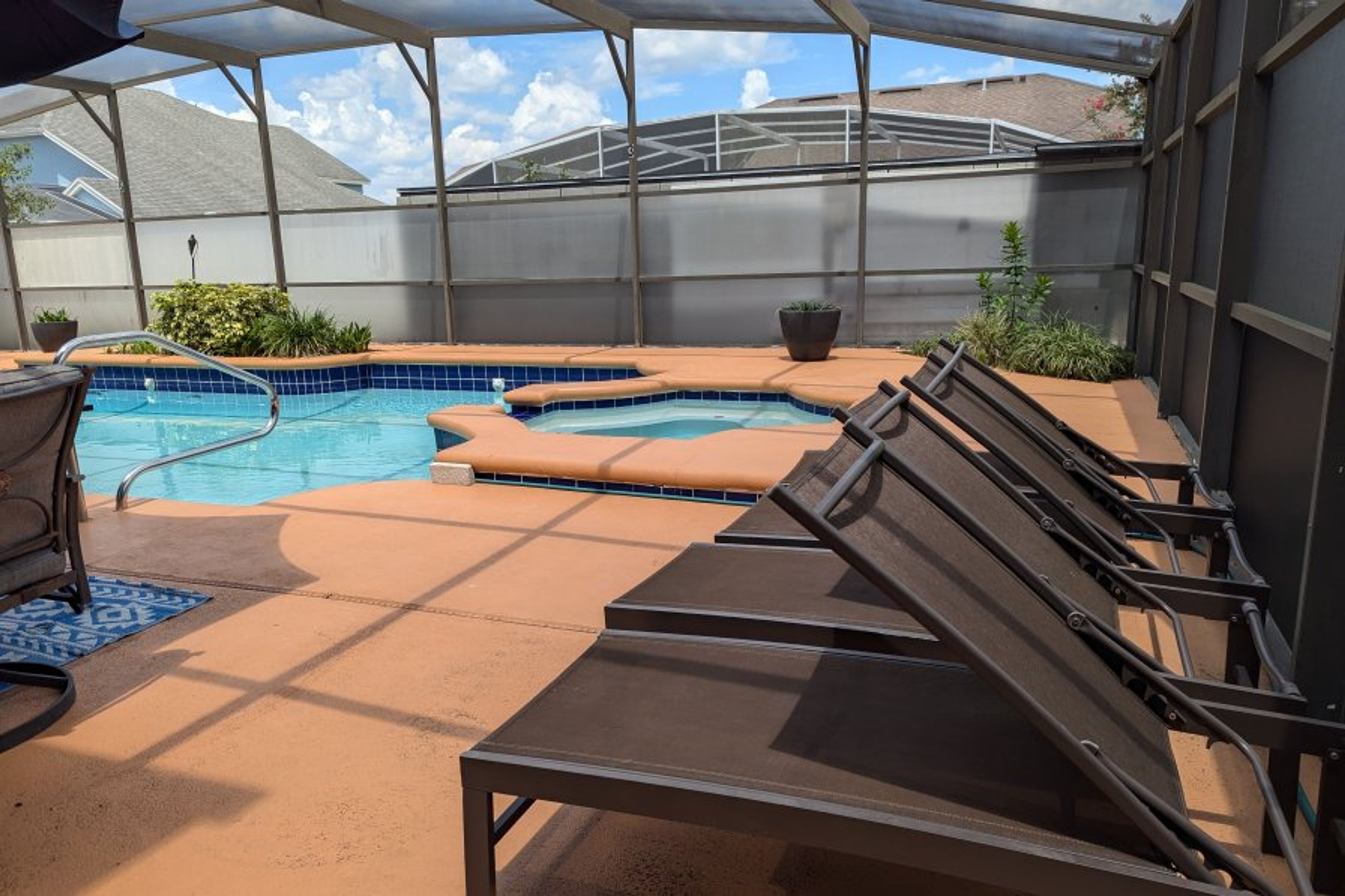 This 4 bed/2.5 bath fully furnished 2809 sq ft under AC with large pool. 5th Bonus Room/Game is FULL CONVERTED GARAGE WITH AC AND HEAT. Home is 4 miles from Disney on a reserve protected by Florida. Pool is 22x 30Ft 3-6 ft depth with water features, 12 person spa that has option for heat in chilly Florida season.