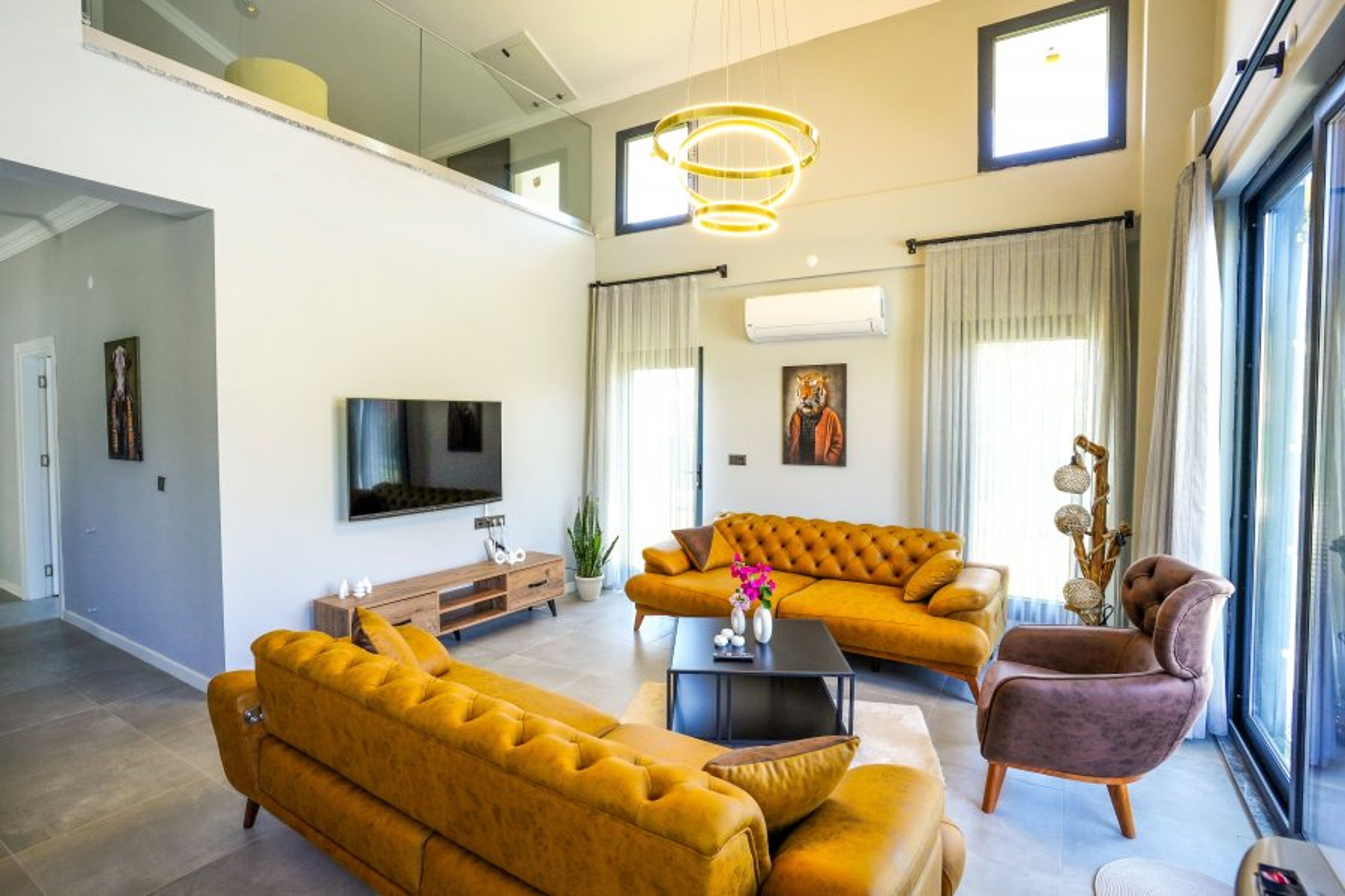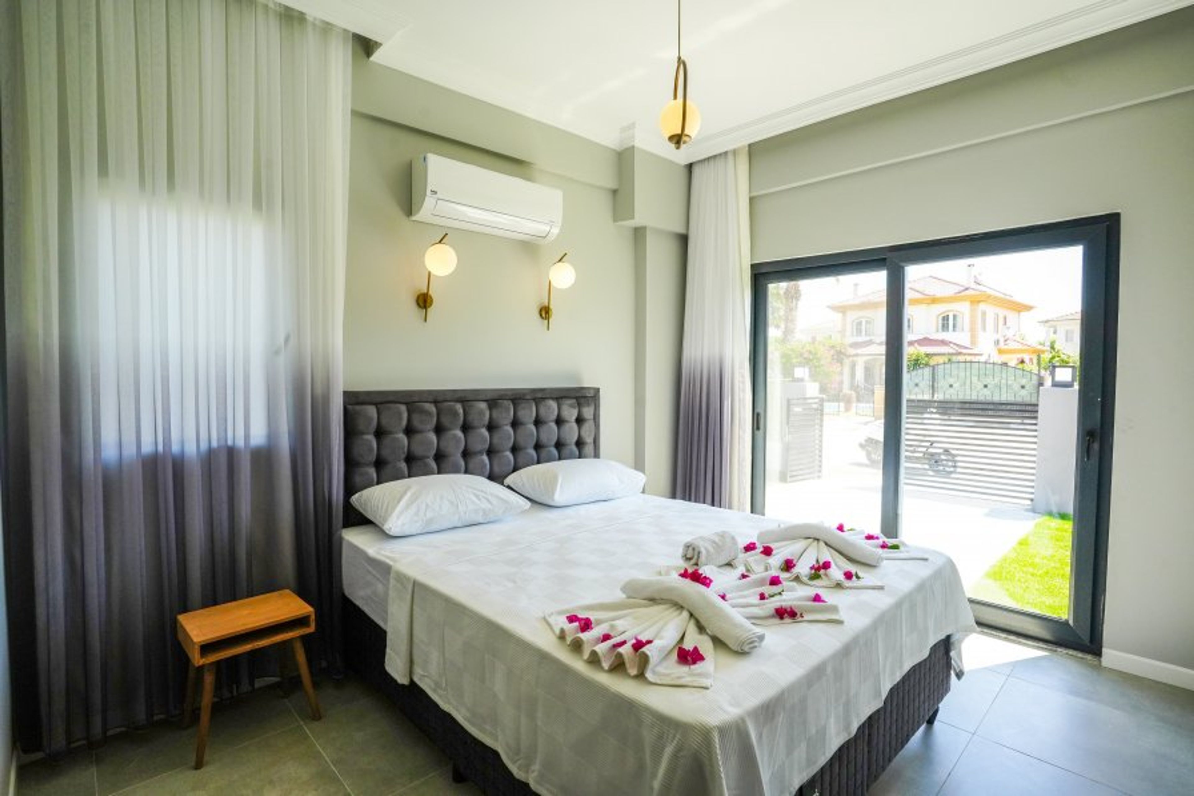 Our villa, which has a children's pool, has a capacity of 10 people and has 5 bedrooms and 5 bathrooms. The first four bedrooms have a double bed, en-suite bathrooms and air conditioning, while the fifth bedroom has two single beds, an en-suite bathroom and air conditioning. There is a common toilet, air conditioner and TV in our villa. There are 2 living rooms, one of which is small. There is a TV in 2 living rooms.