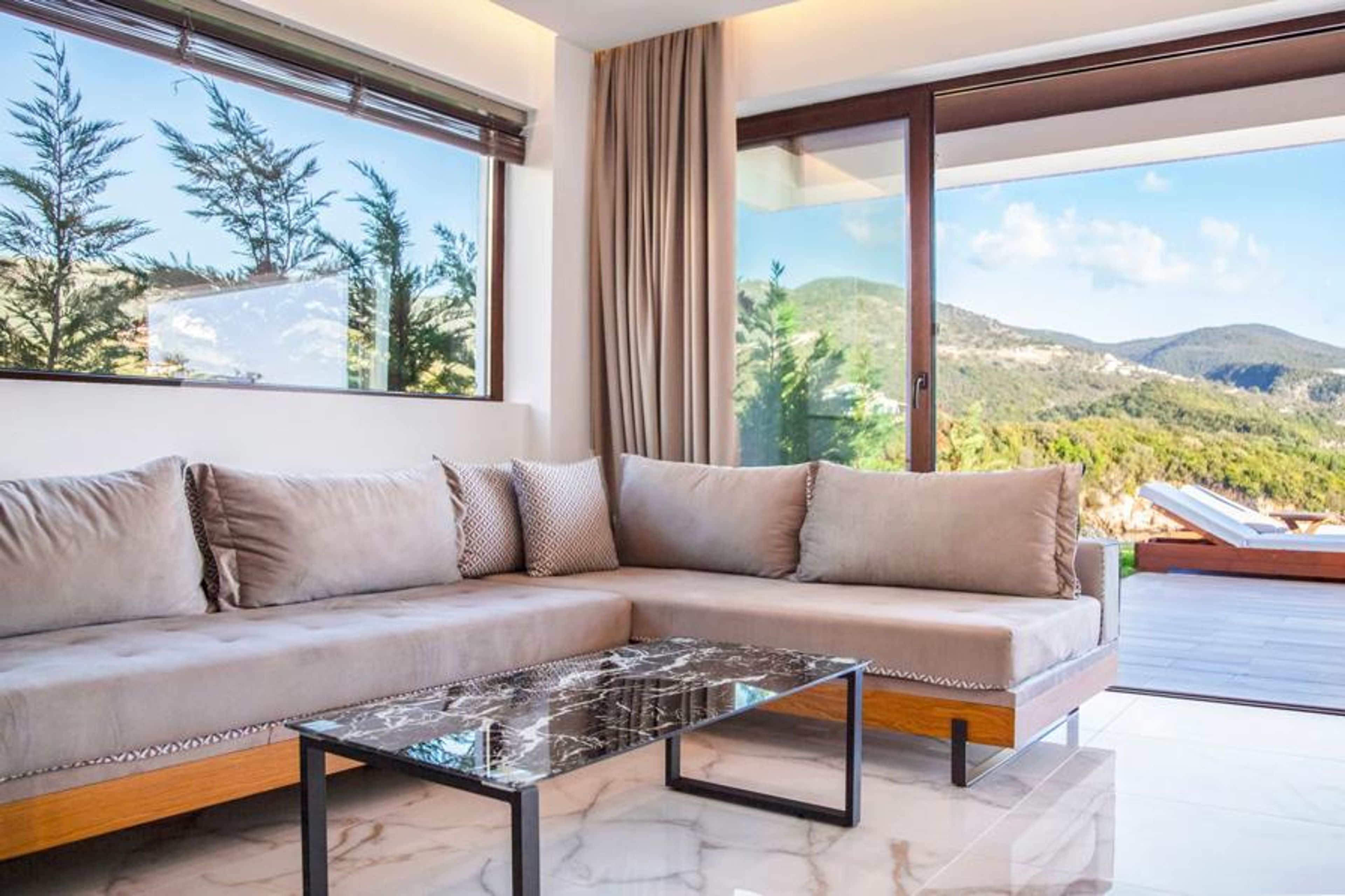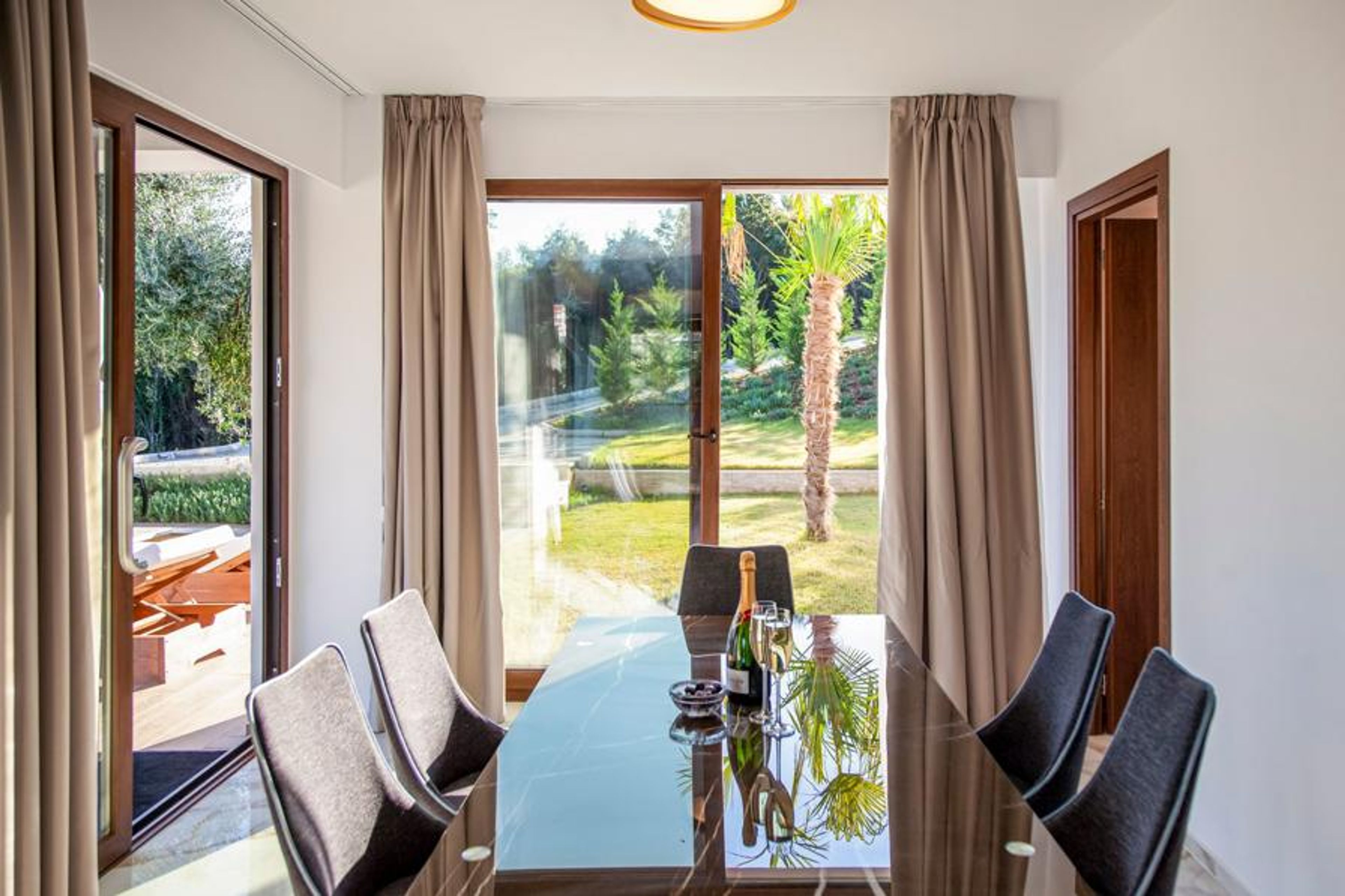 Outside, the villa's modern design extends to the outdoor furniture, including a private pool and lush gardens. Guests can relax and enjoy the surroundings, with direct access to the Ionian Sea for swimming and relaxation.