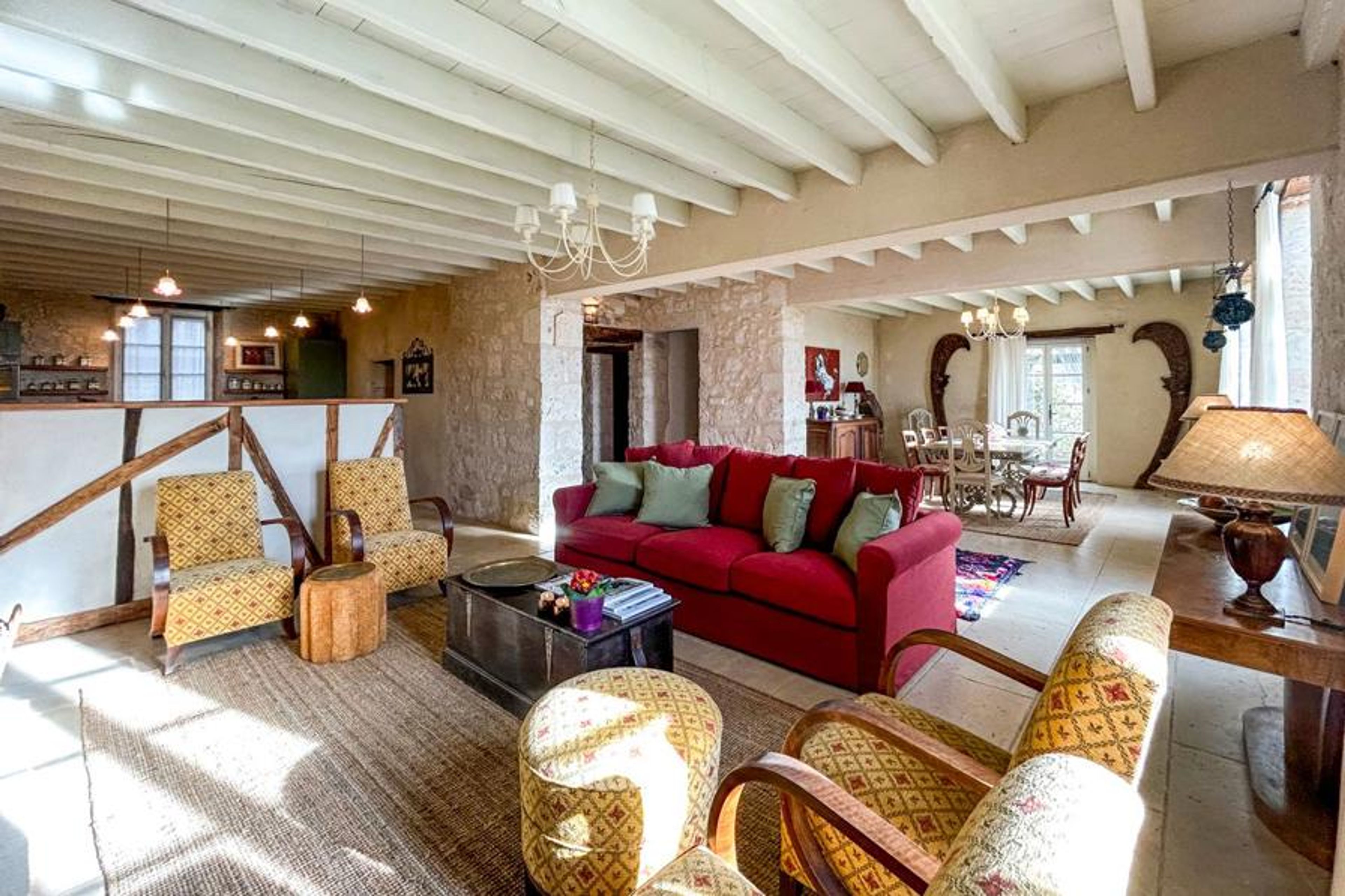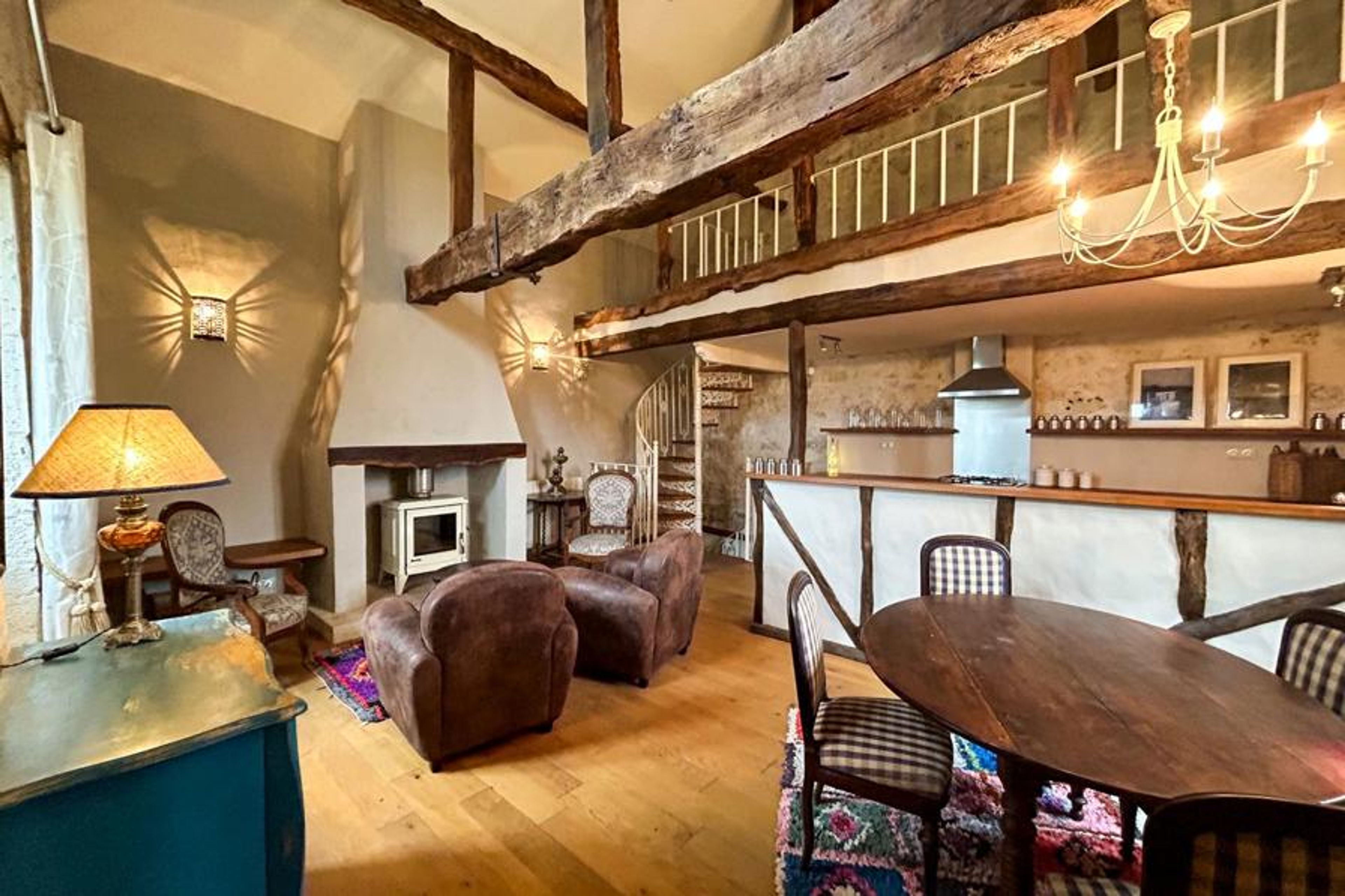 - Open-plan lounge with armchairs, wood burning stove and dining table