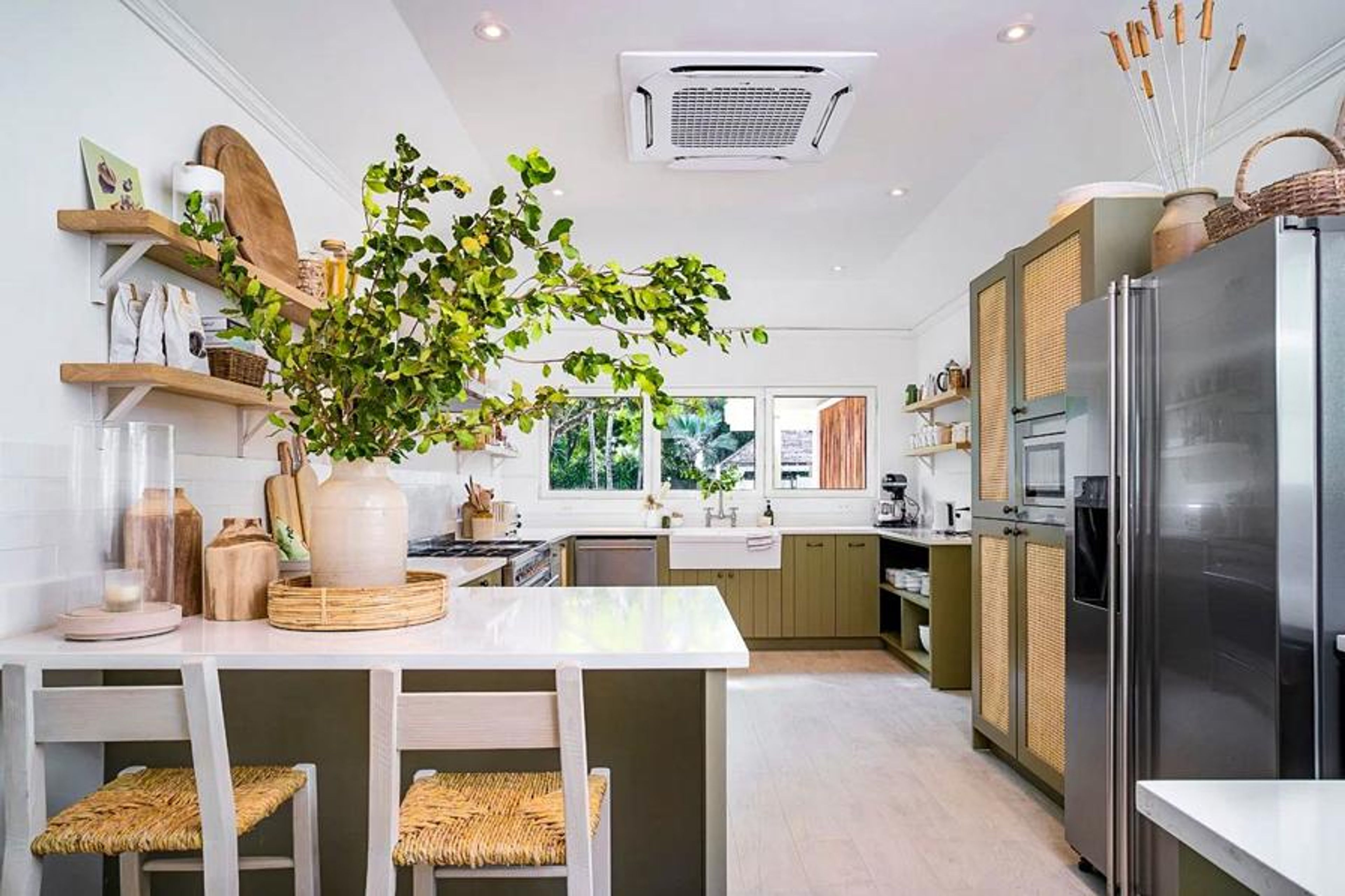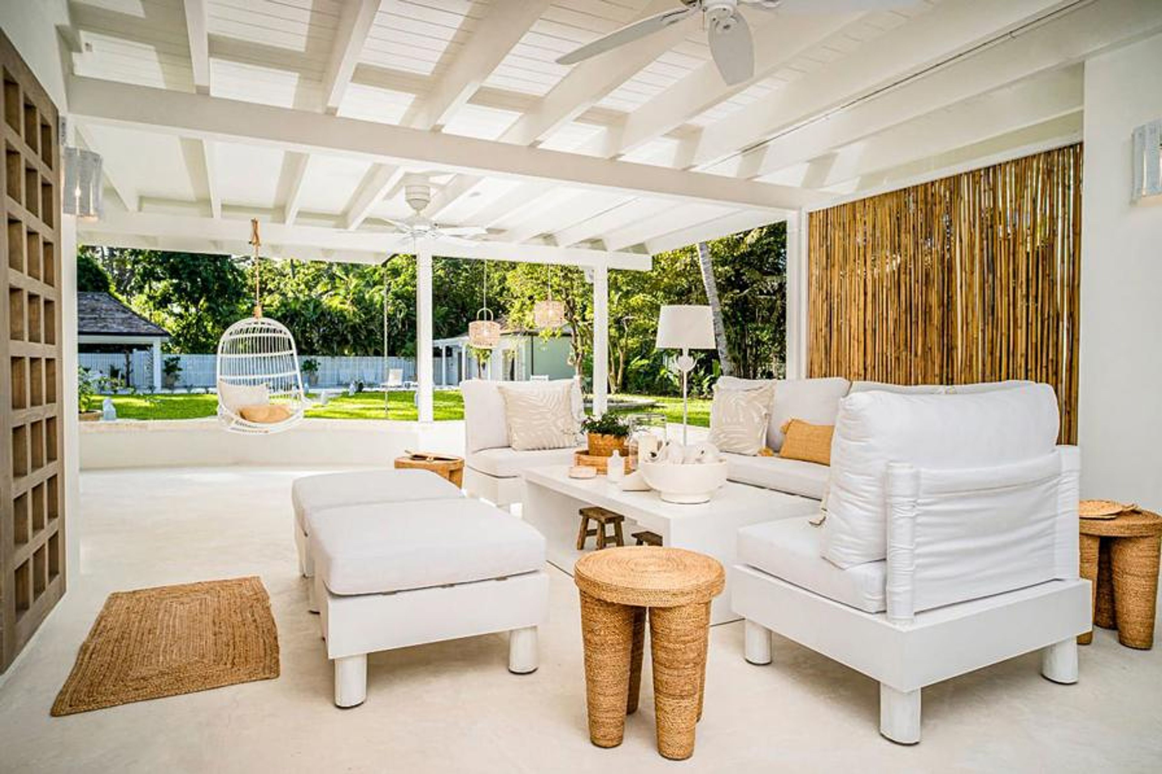 Stepping inside, guests are greeted by an inviting fusion of lounge, dining, and kitchen spaces thoughtfully designed to harmonise relaxation with conviviality. The airy sitting room, adorned with bamboo furniture, offers tranquil garden vistas, while the covered dining area, with seating for up to 12, frames captivating views of the pool and verdant garden foliage. A fully renovated kitchen, a chef's paradise boasting modern amenities and a cosy breakfast nook, invites culinary adventures, complemented by a buffet area for family-style meals.
