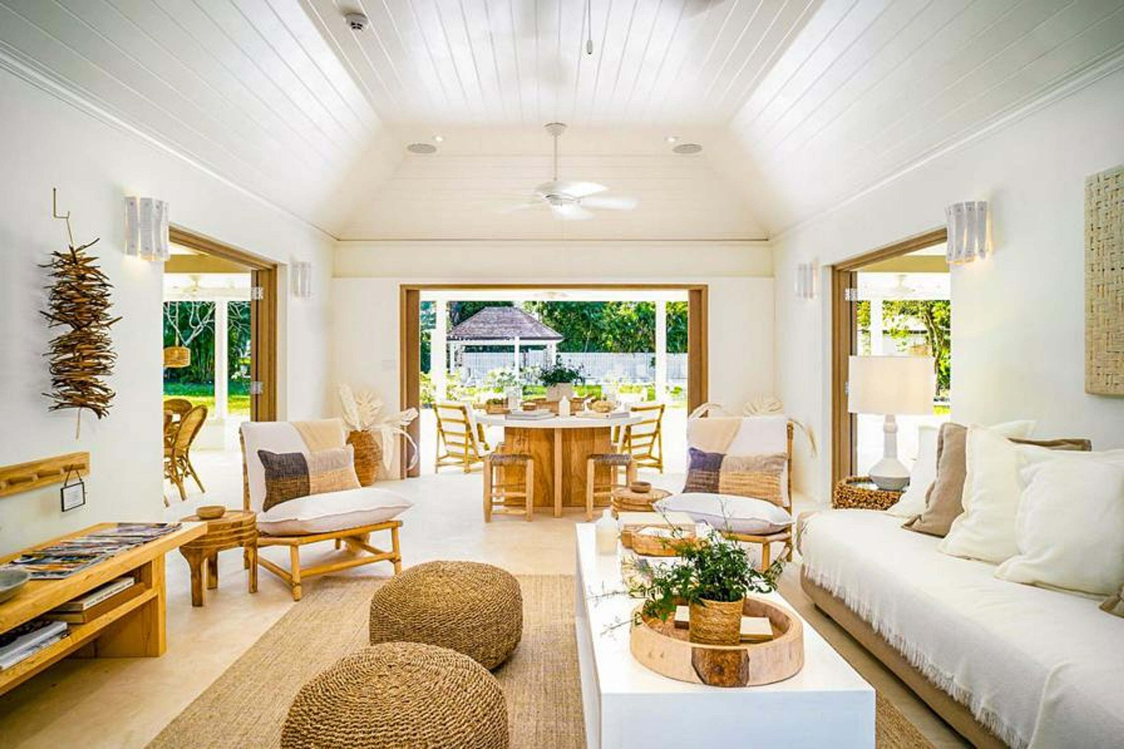 The villa's five bedrooms, including a master suite and two additional bedrooms within the main house, and two bedrooms located in a separate self-contained cottage, evoke a serene ambience with their soothing white decor accentuated by vibrant green plants and eco-style art pieces. Each bedroom boasts an ensuite bathroom adorned with refreshing rain showers and eclectic washboard shelves, epitomising contemporary Caribbean charm.