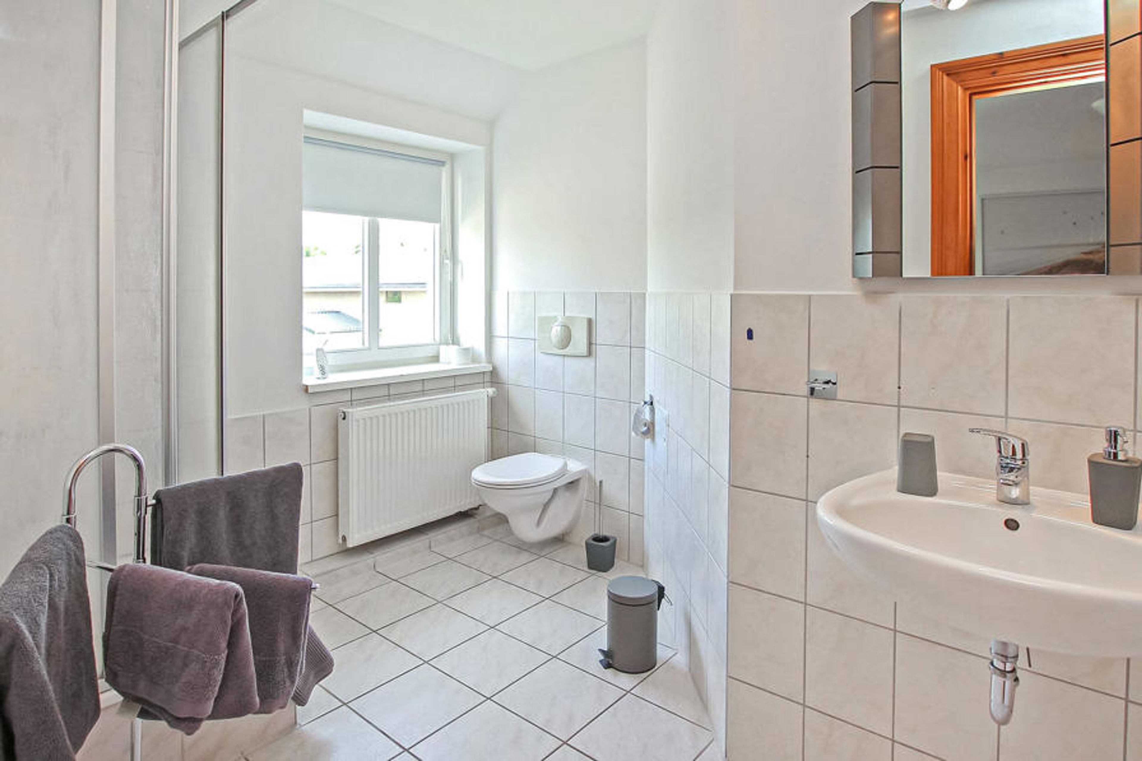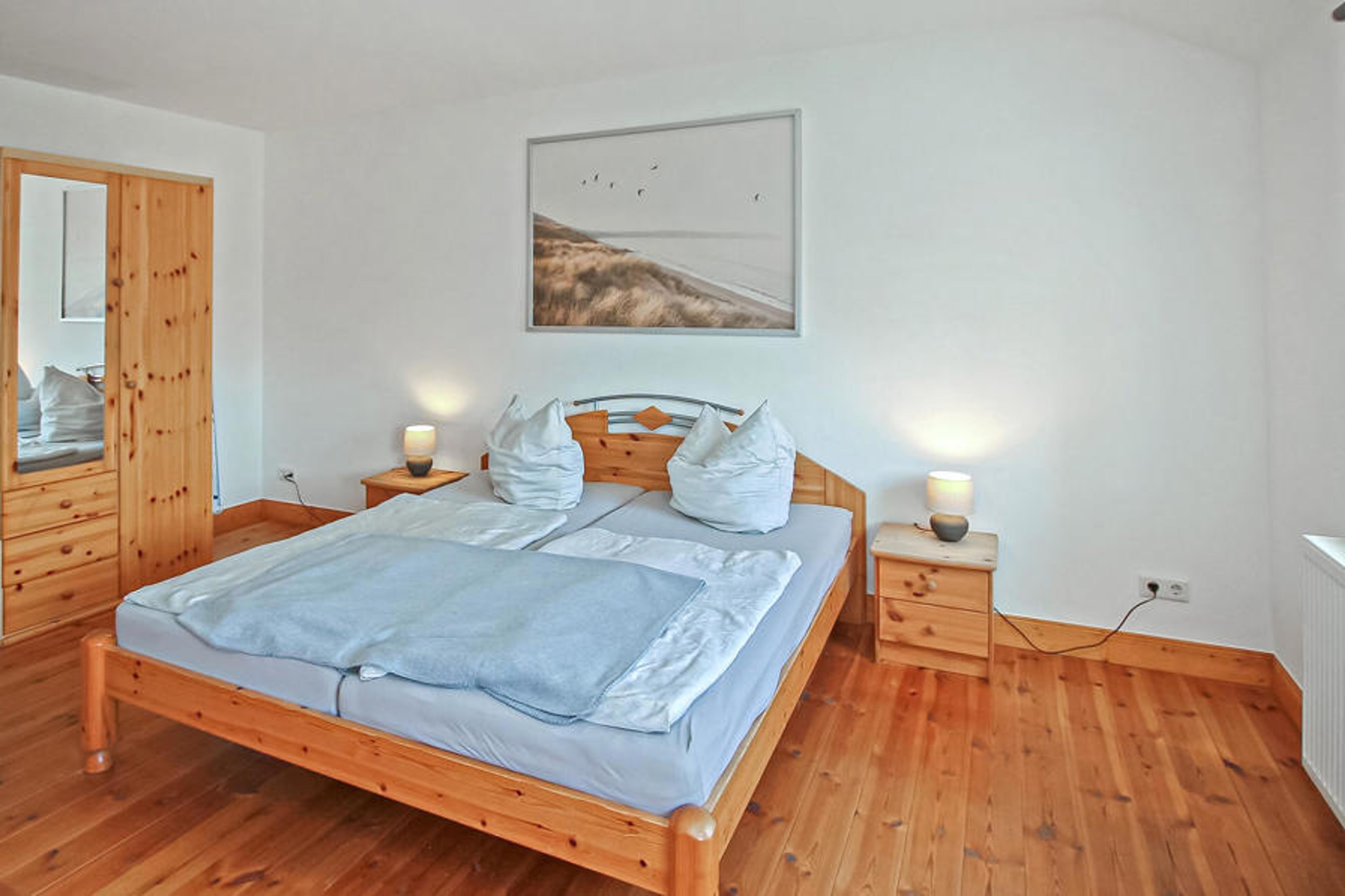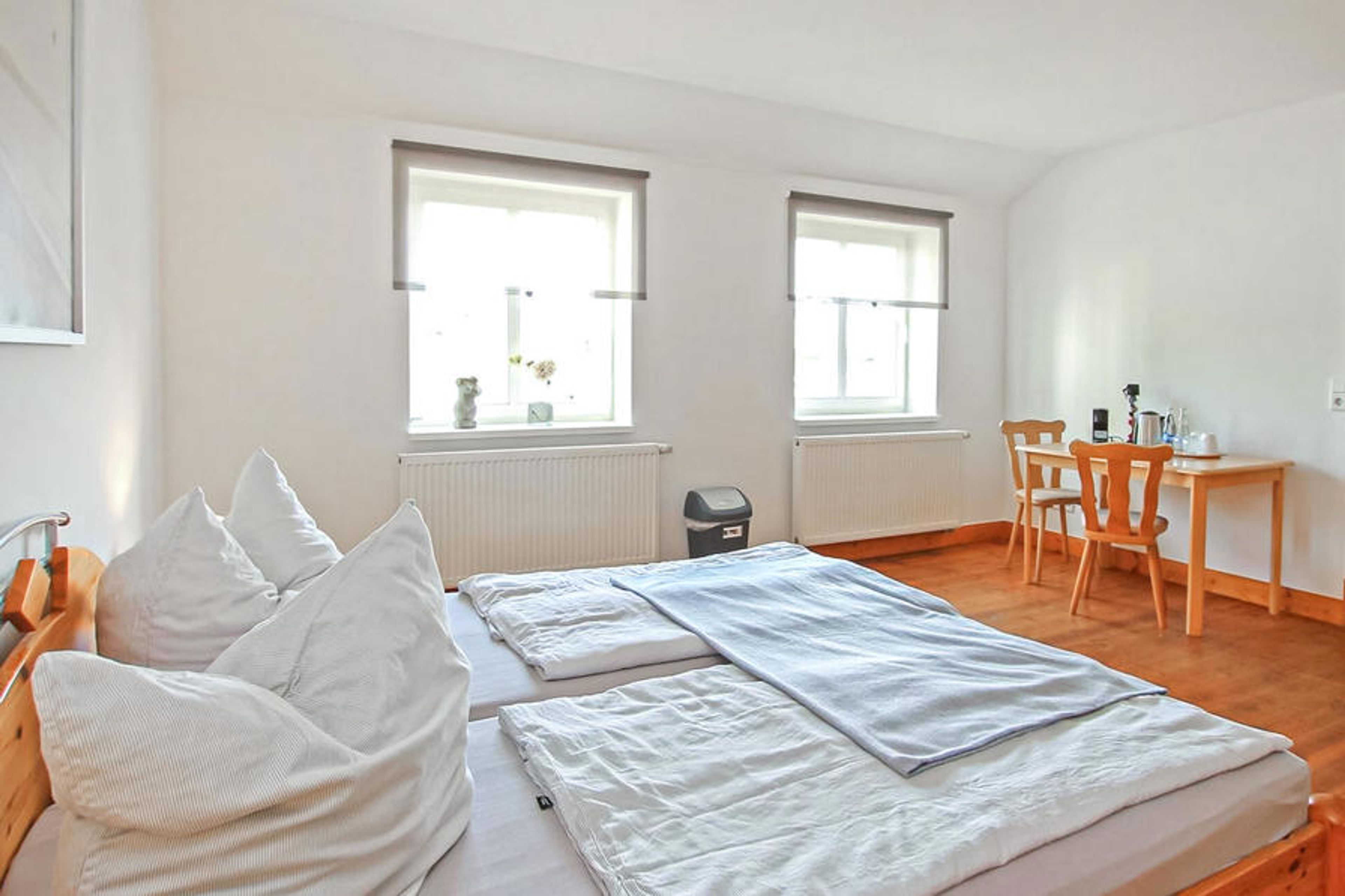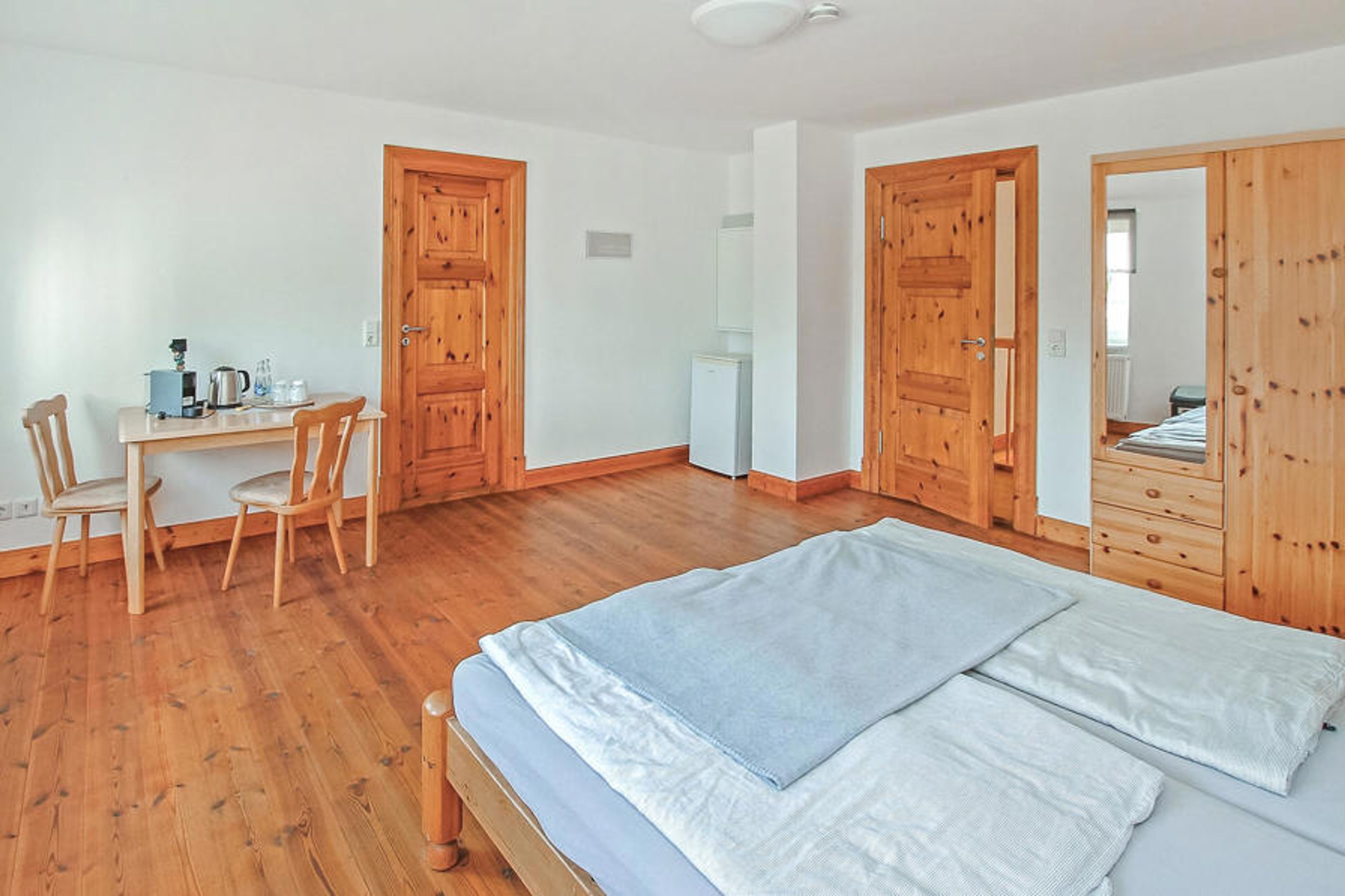 The centrally heated non-smoking double room was renovated in 2022 and is accessible via a separate entrance (stairs). There is the possibility of an extra bed for 1 baby. Cot on request. There is a small dining table with chairs, fridge, kettle, capsule coffee machine, flat screen TV and a bathroom with shower/WC. There are plenty of parking spaces, bicycle storage facilities, a playground with an information board about the national park, a cot on request and free WiFi.