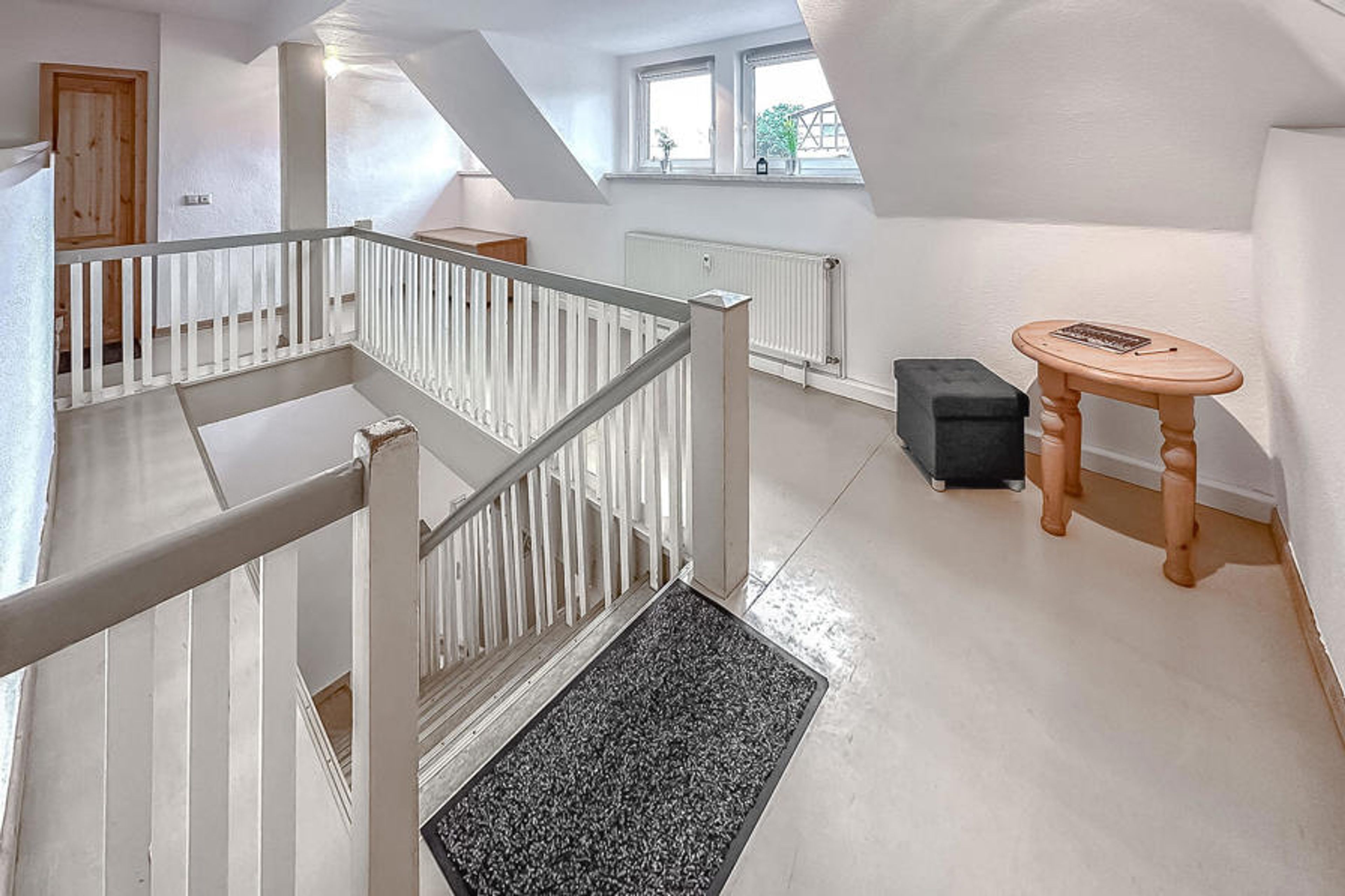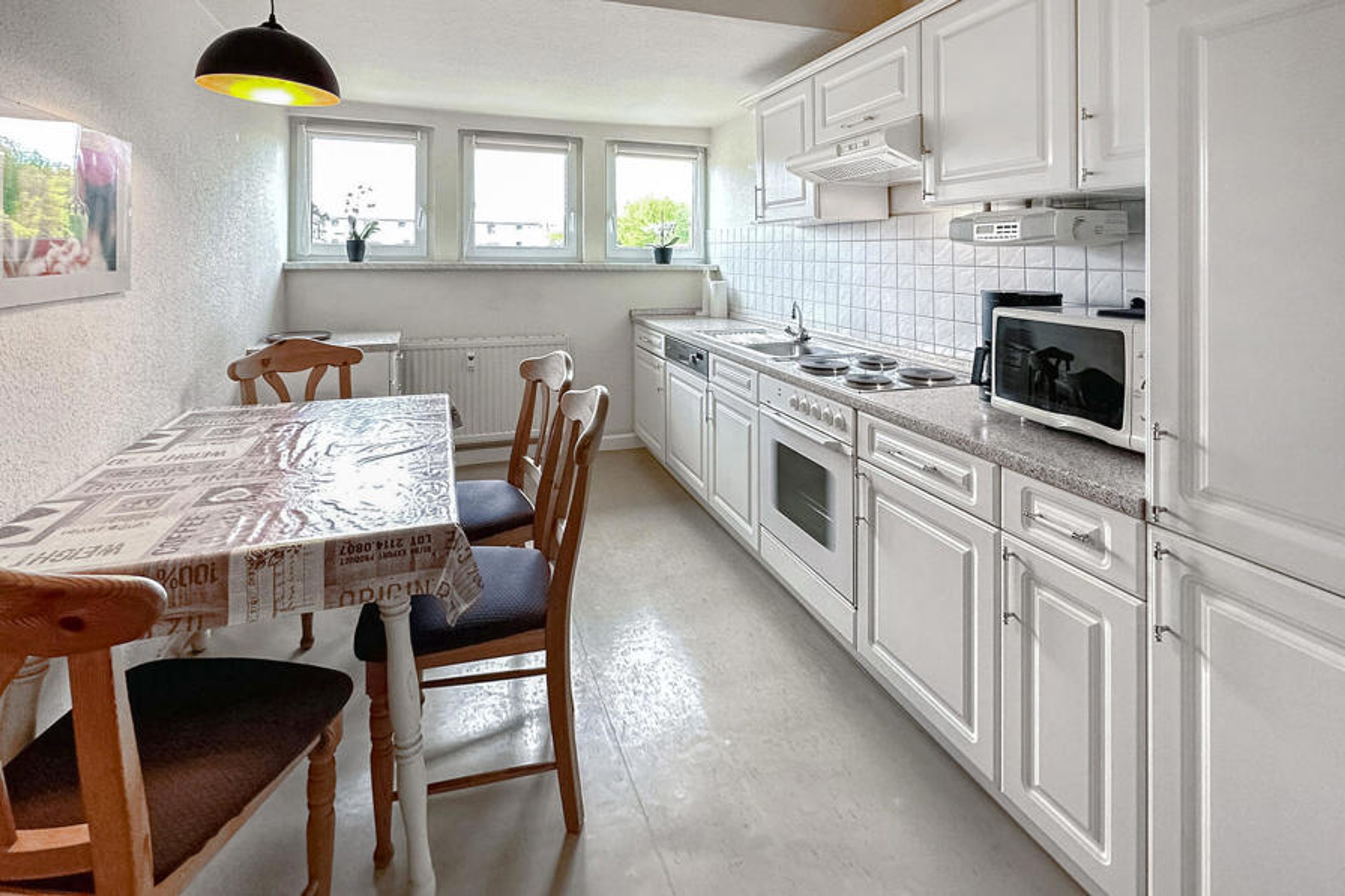The holiday apartment Seeblick is located on the upper floor of the manor house. Equipped with living room (upholstered furniture with sleeping function as an extra bed for 2 people, TV, radio), kitchen (complete with electric cooker with oven, fridge, microwave, dishwasher, various kitchen appliances), 2 bedrooms (1 x double bed). 1 x 2 single beds and TV), shower/WC/bidet, guest WC, central heating, partial roof terrace (1/2 of 42 square metres).