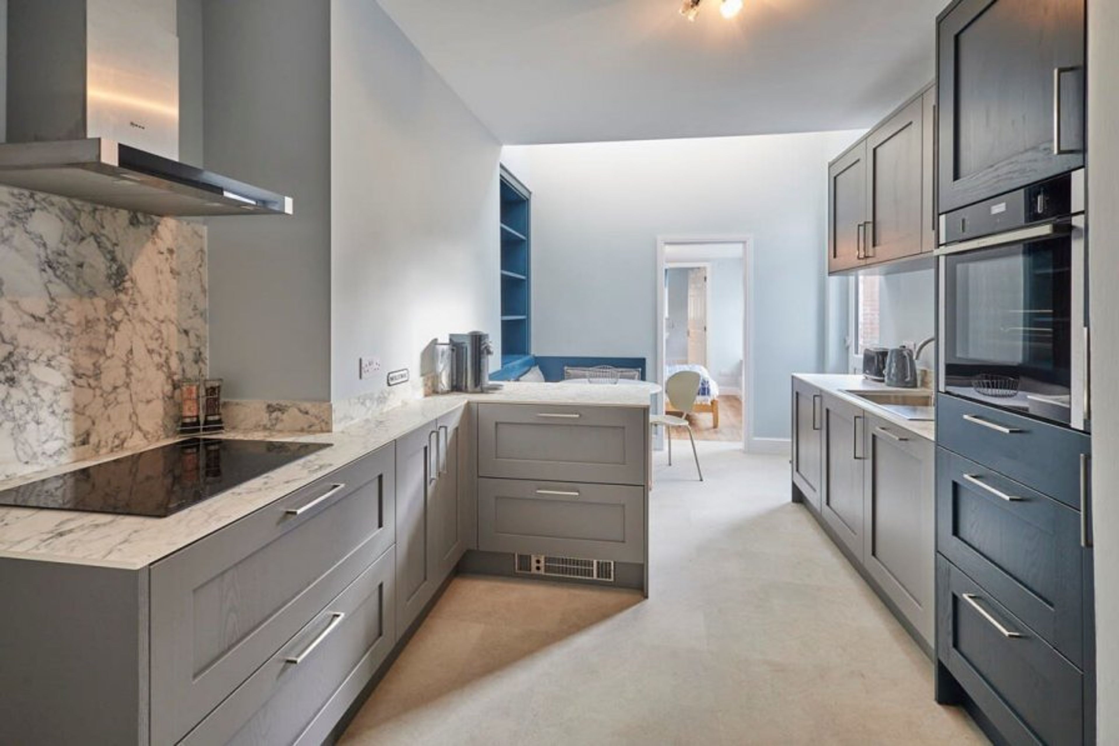 Fully equipped for self-catering stays, the kitchen boasts high quality appliances such as a dishwasher, microwave, toaster, kettle, oven and hob. Ultra sleek, the kitchen has smooth grey, wooden cabinets.