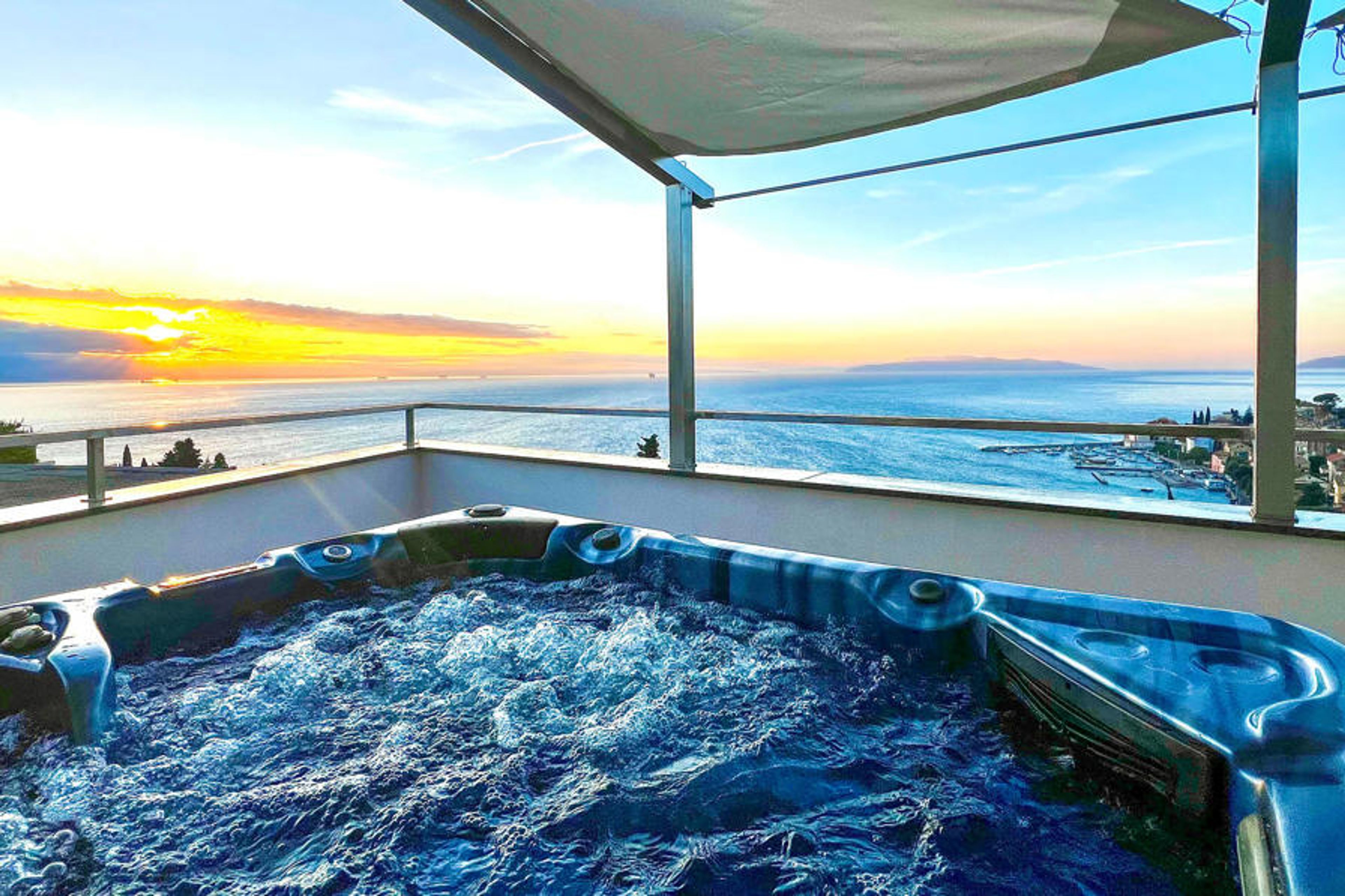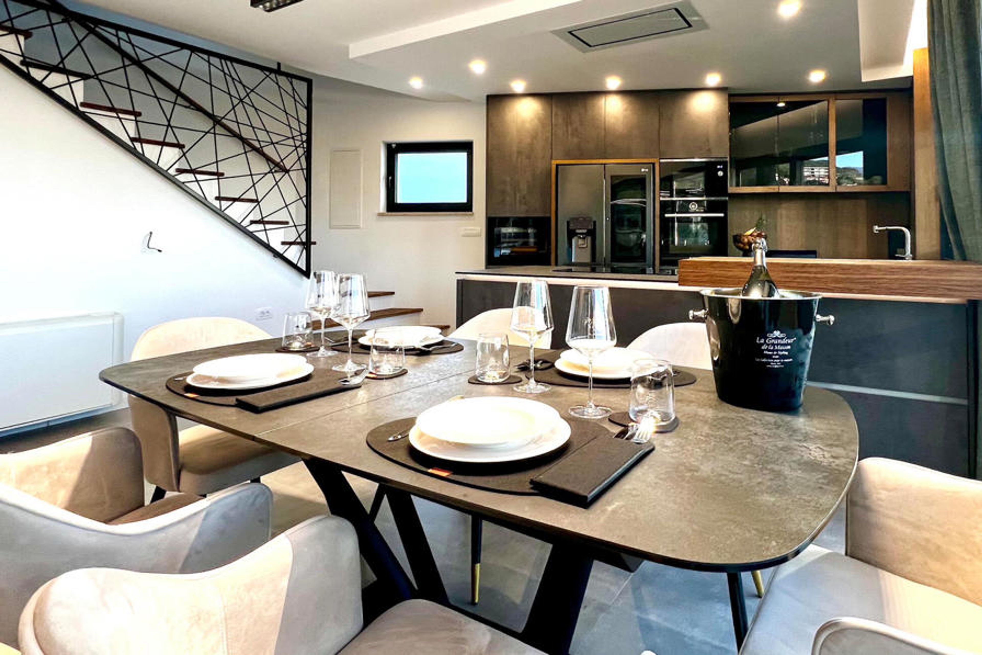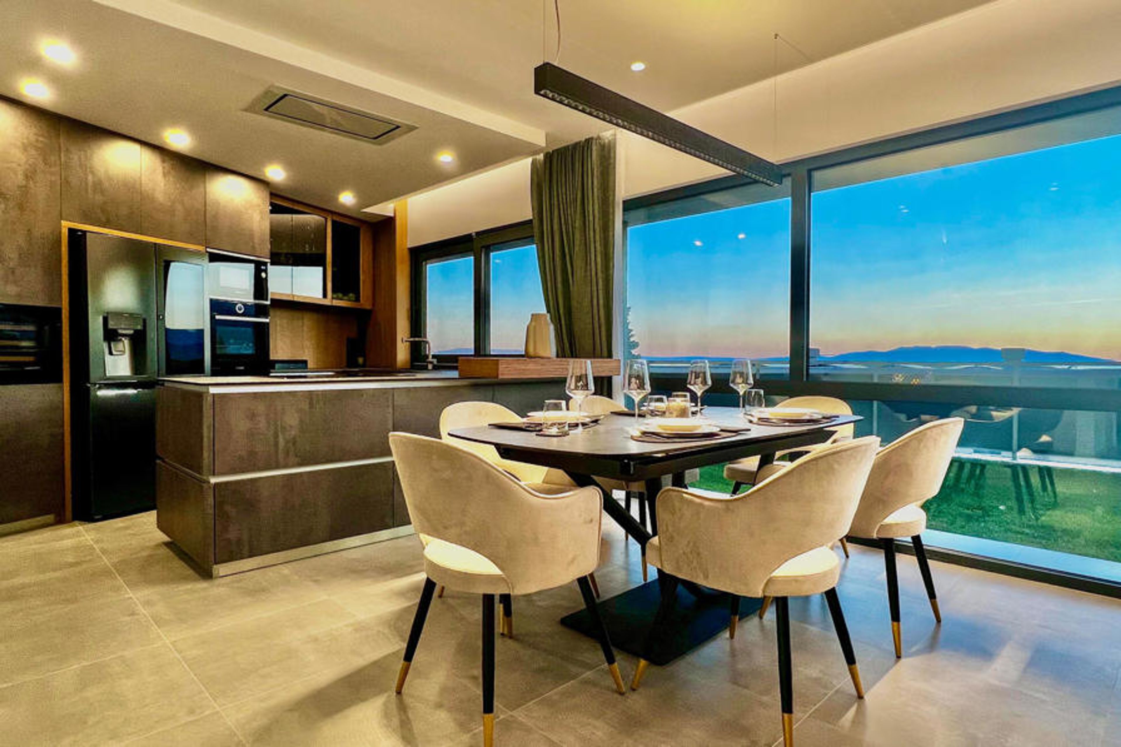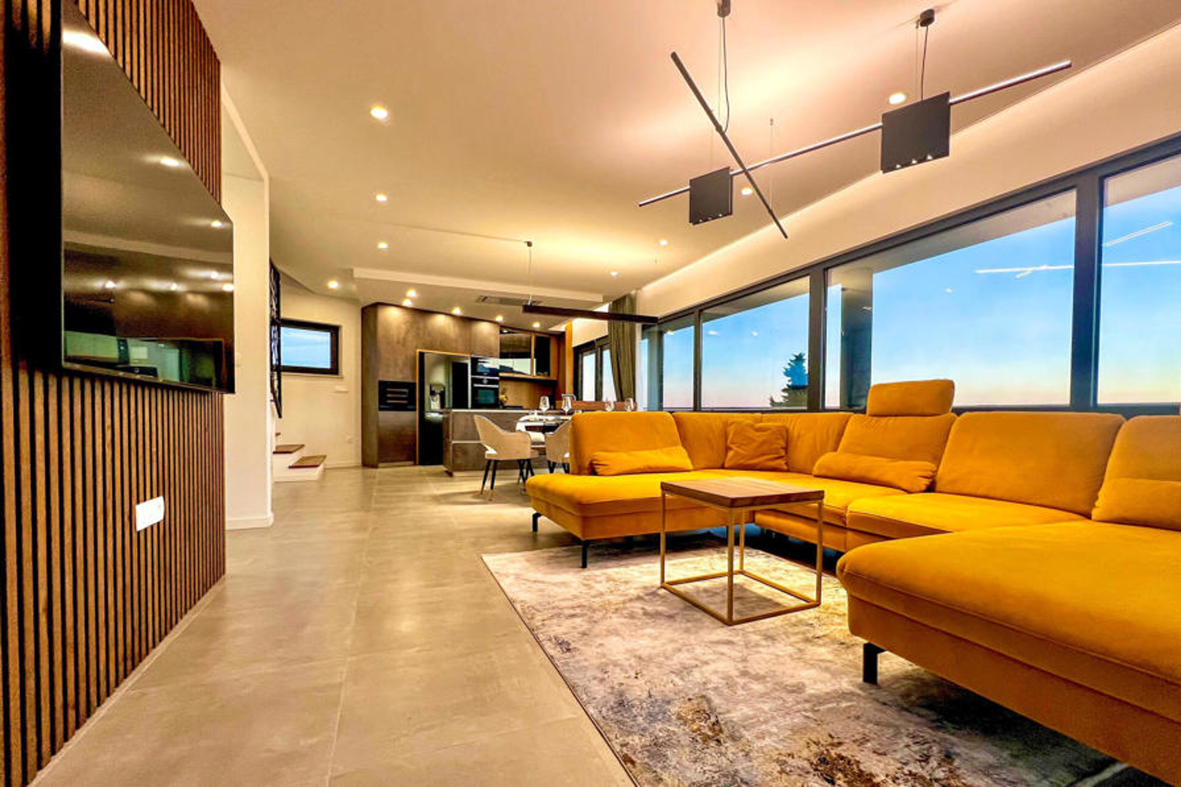 This exceptional luxury property will spoil you with its stylish, high-quality interior and fantastic panoramic sea views. Conjure up culinary highlights in the modern kitchen and enjoy your meals in the open-plan living area, where large window fronts provide plenty of natural light. In the evening, the tasteful furnishings are accentuated by warm lighting and the fireplace provides additional cosiness while you relax on the sofa.
