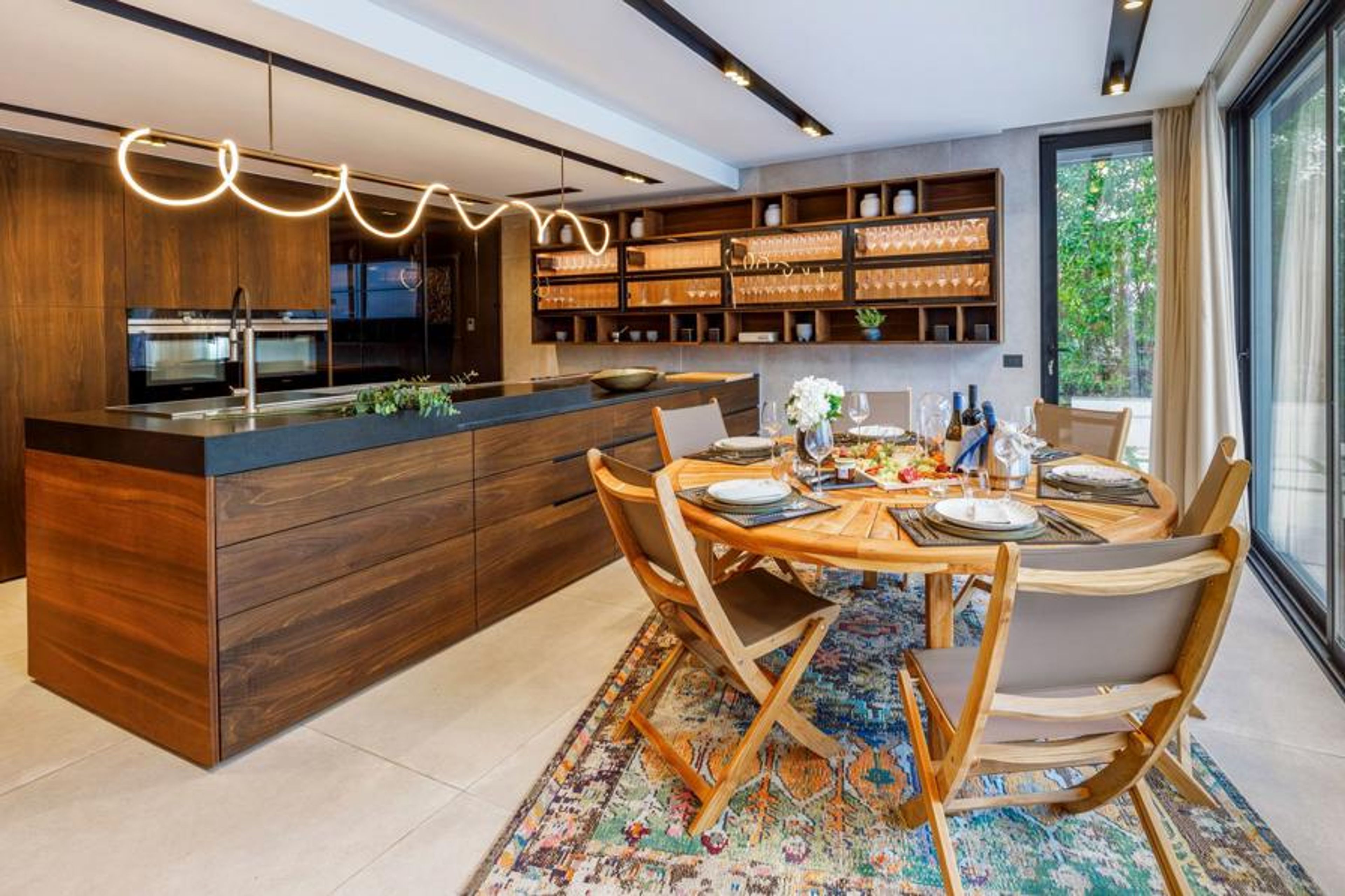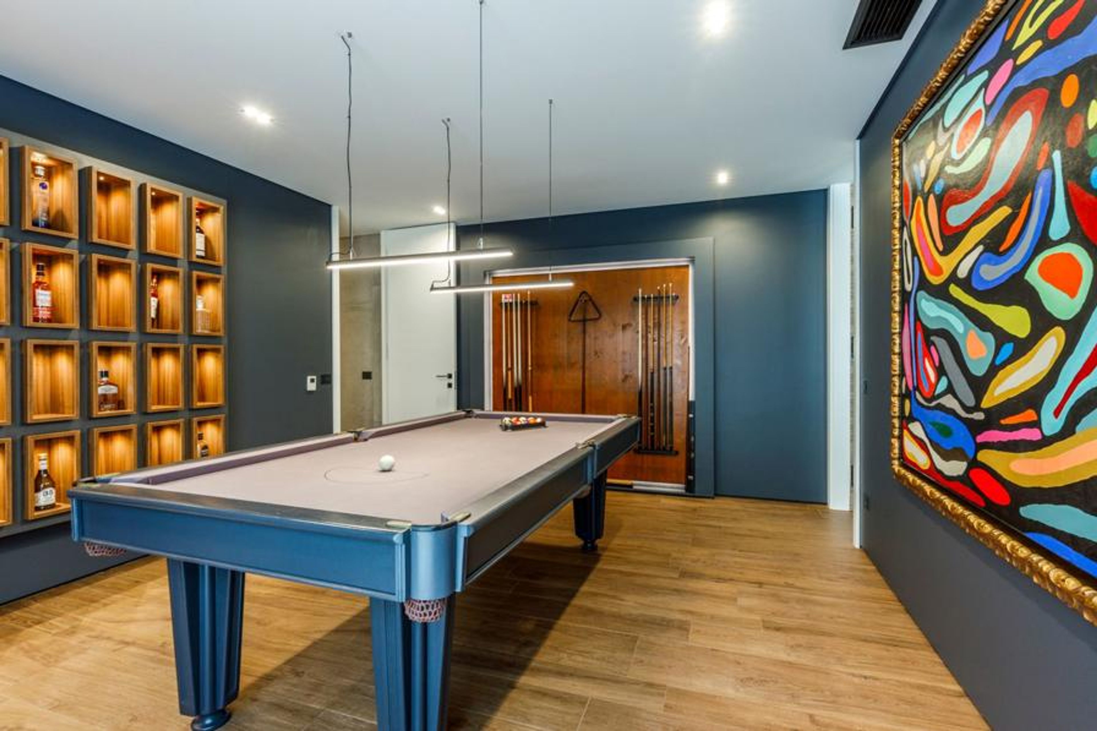 Inside, you will discover a practical open-plan layout, seamlessly blending formal and informal living spaces ideal for entertaining guests. The chef's kitchen, adorned with burnt walnut wood and black Zimbabwe granite, features high-end appliances and is complemented by a cellar stocked with fine wines and a gin bar for crafting bespoke cocktails.