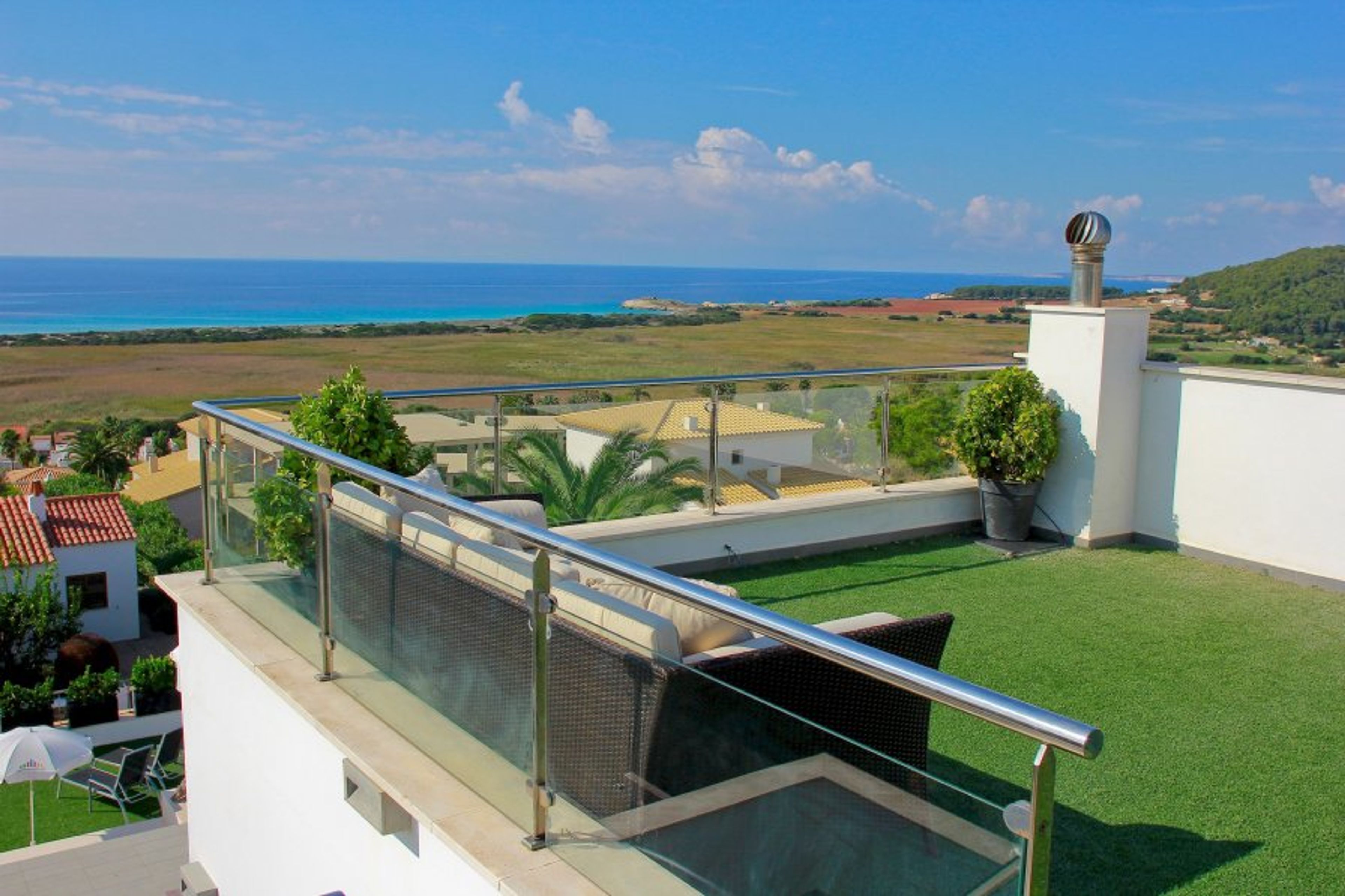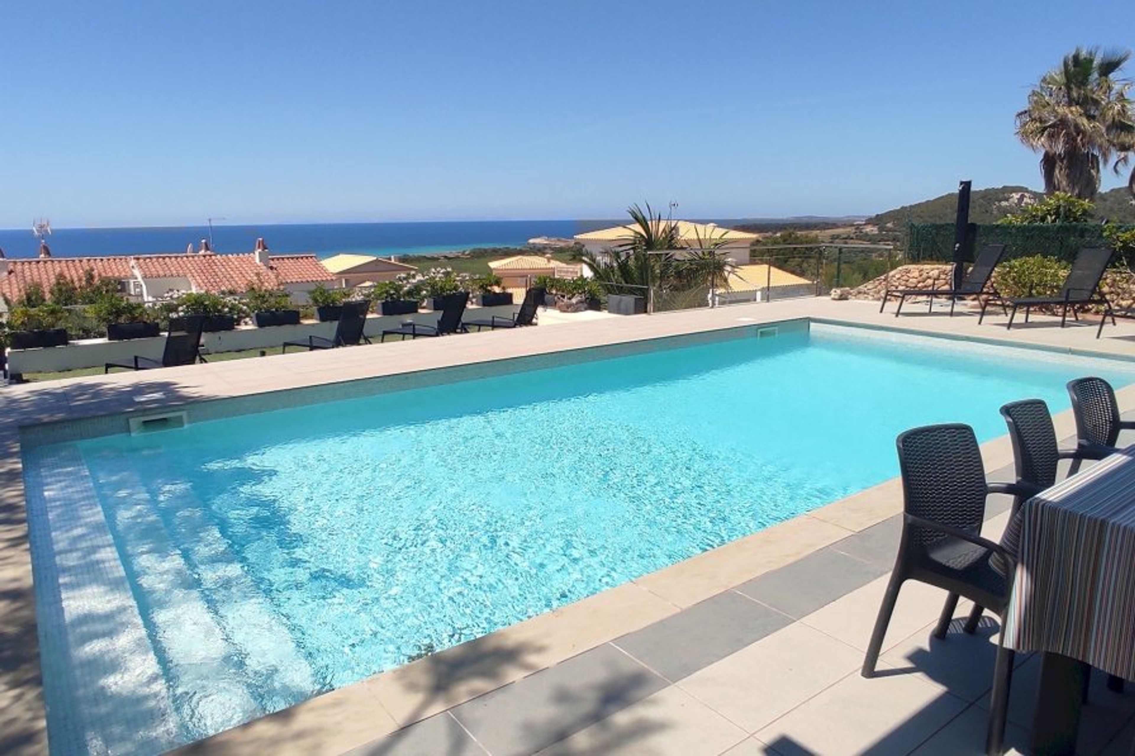 Welcome to Villa Brisa! Located just 1.9km from the stunning Son Bou beach, our villa offers you the perfect combination of privacy, comfort and unrivaled panoramic views. Immerse yourself in the serenity of our surroundings, where you can enjoy the tranquility and privacy offered by our private pool. With panoramic views of the beach, each sunset becomes an unforgettable spectacle that you can enjoy from the comfort of your own terrace. Highlighted features: Experience the feeling of comfort in every corner of Villa Brisa. With large indoor and outdoor spaces, you will find the perfect place to relax and enjoy your holidays in Menorca. Charming interior spaces: The villa has large spaces that include four double bedrooms and one single, offering more than enough space to accommodate the entire family or a group of friends. In addition, one of the rooms is specially designed with four single beds, ideal for the little ones. Enjoy the comfort of a fully equipped kitchen, where you can prepare your favorite meals while enjoying the company of your loved ones. With four bathrooms, three of them en suite for greater privacy. Private pool and panoramic terrace Villa Brisa offers an incomparable outdoor experience. Immerse yourself in the freshness of our private pool, where you can relax and refresh at any time of the day. Enjoy the sea breeze and stunning views from any of our three terrace areas. On the first floor, you will find a chill out area specially designed to enjoy spectacular sunsets, turning each night into a magical and unforgettable moment. Whether relaxing by the pool, enjoying the views from the terraces or contemplating the sunset from the chill out area, at Villa Brisa you will find the perfect space to relax and enjoy your holiday in Menorca to the fullest. Explore Menorca from your doorstep: Discover the rich history and natural beauty of Menorca with ease from Villa Brisa. Explore hidden coves, enjoy authentic local cuisine and immerse yourself in the unique culture of this enchanting island. Book now your unforgettable stay at Villa Brisa: Make your vacation a dream come true. With an unparalleled location, exceptional amenities and breathtaking views, Villa Brisa is the perfect choice for those looking for a unique experience in the south of Menorca. Book now and let Villa Brisa brighten your seaside vacation!
