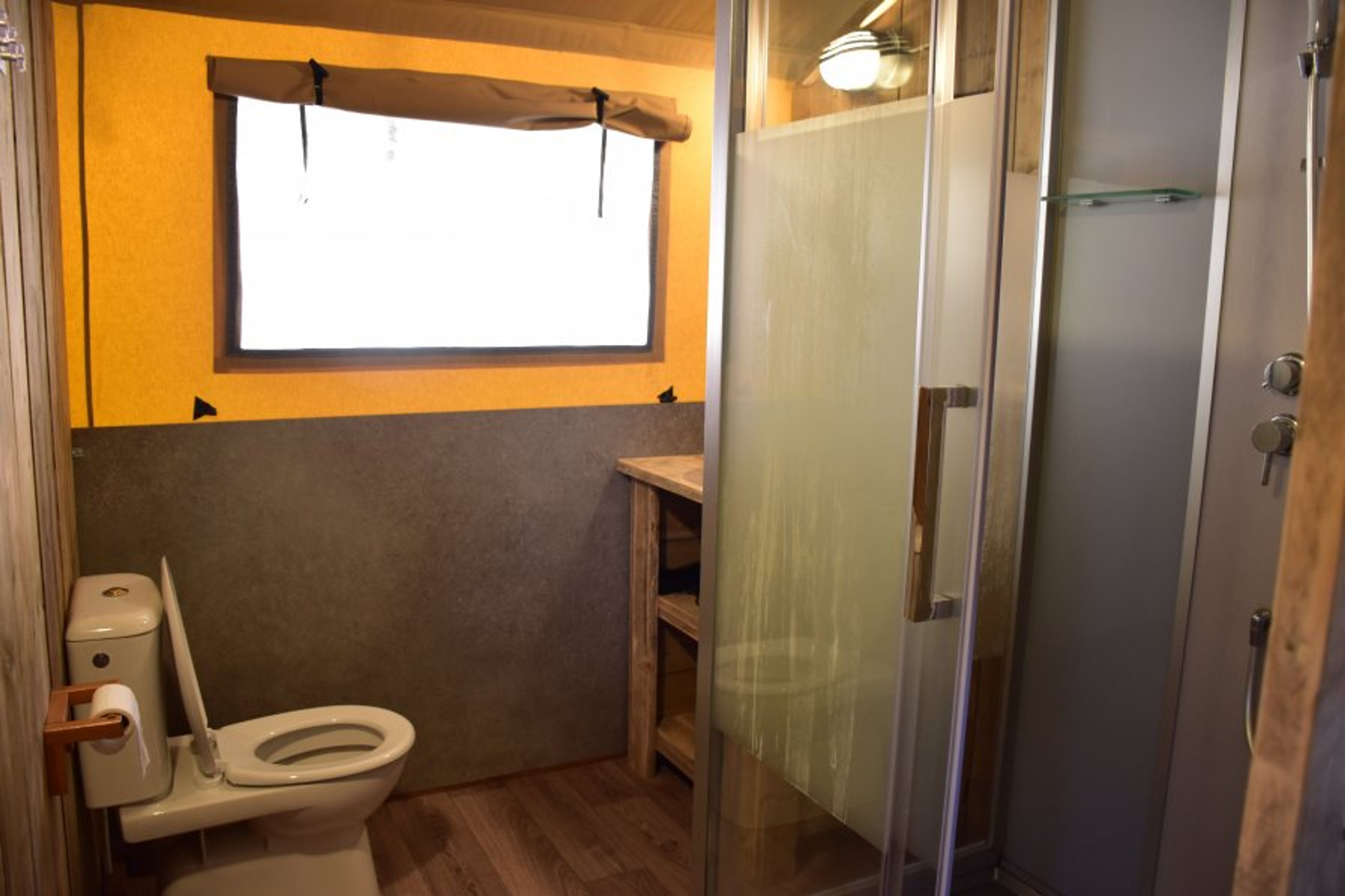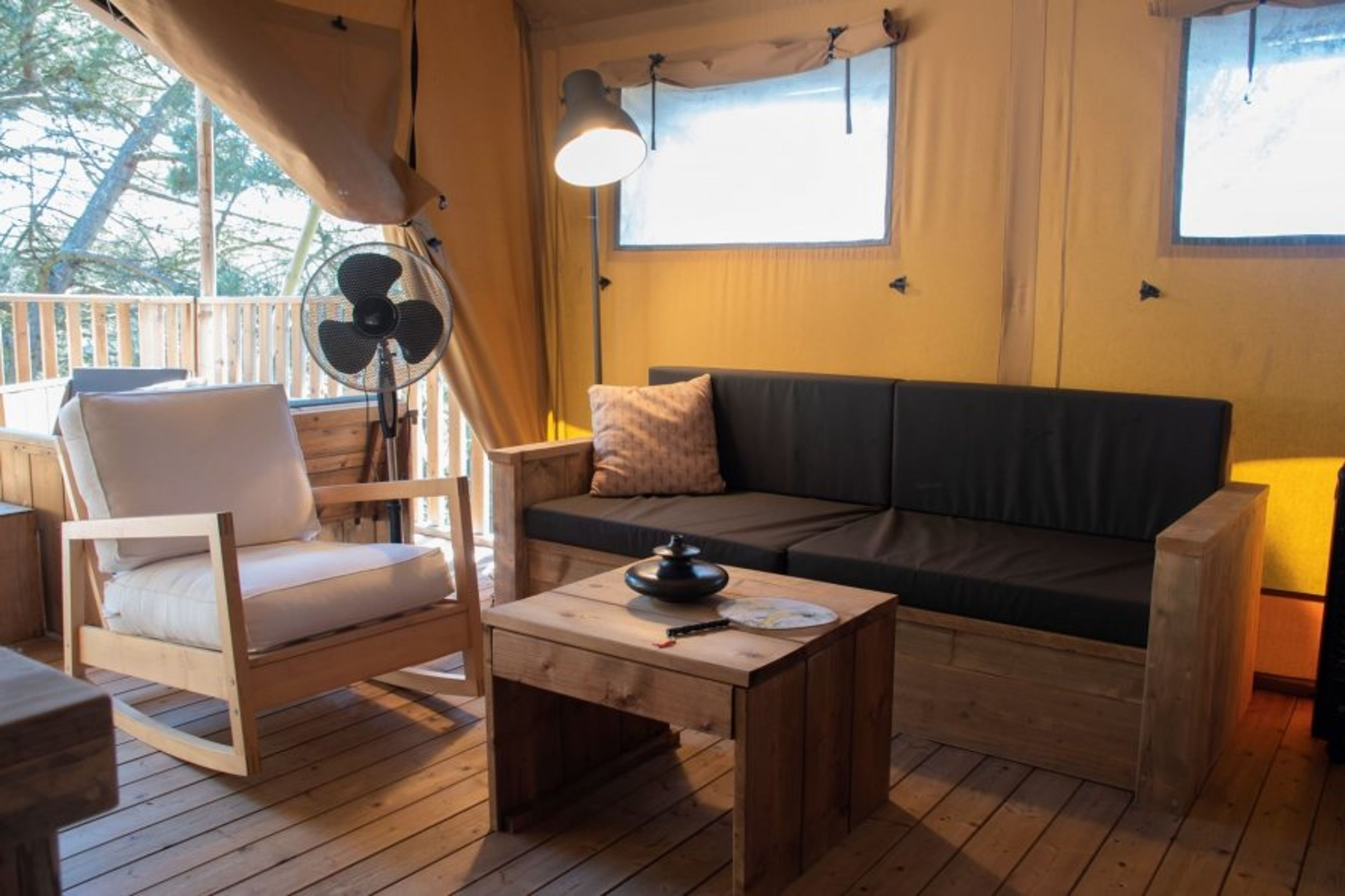 Introducing Glamping Matsu, a luxurious and spacious safari tent featuring 3 bedrooms. The interior is elegantly designed with a beautiful canopy bed, a cozy bedstead, and a bedroom with 2 bunk beds. Conveniently located inside the tent are a fully equipped kitchen and a bathroom with a shower, sink, and toilet. The living and dining area is thoughtfully furnished with a comfortable sofa, a rocking chair, and a large dining table. Step out onto the terrace and soak in the stunning views of the lush green valley from the lounge set or picnic table. Accommodating 2 to 8 guests, this safari tent offers a private entrance and parking area for your convenience.