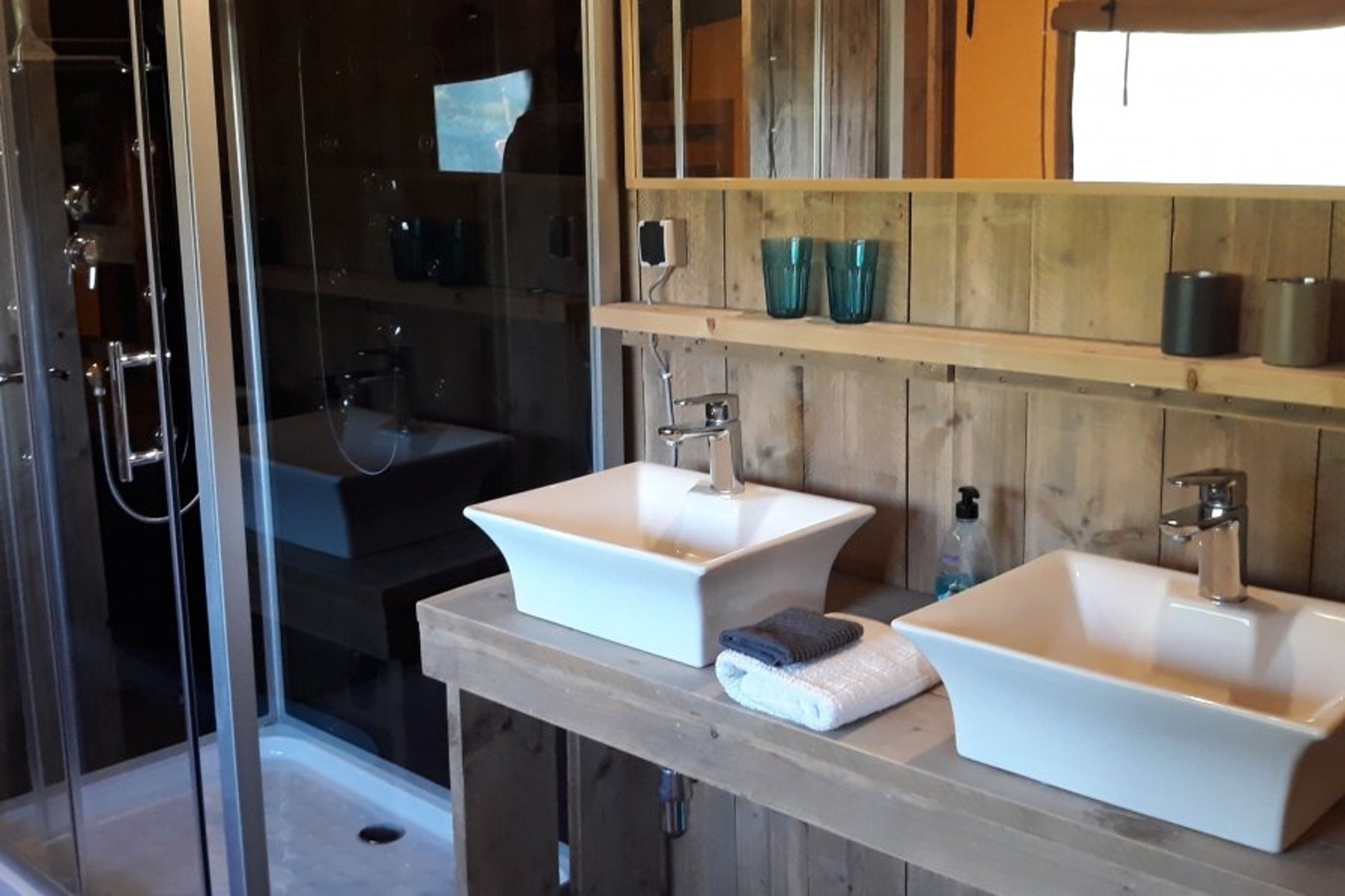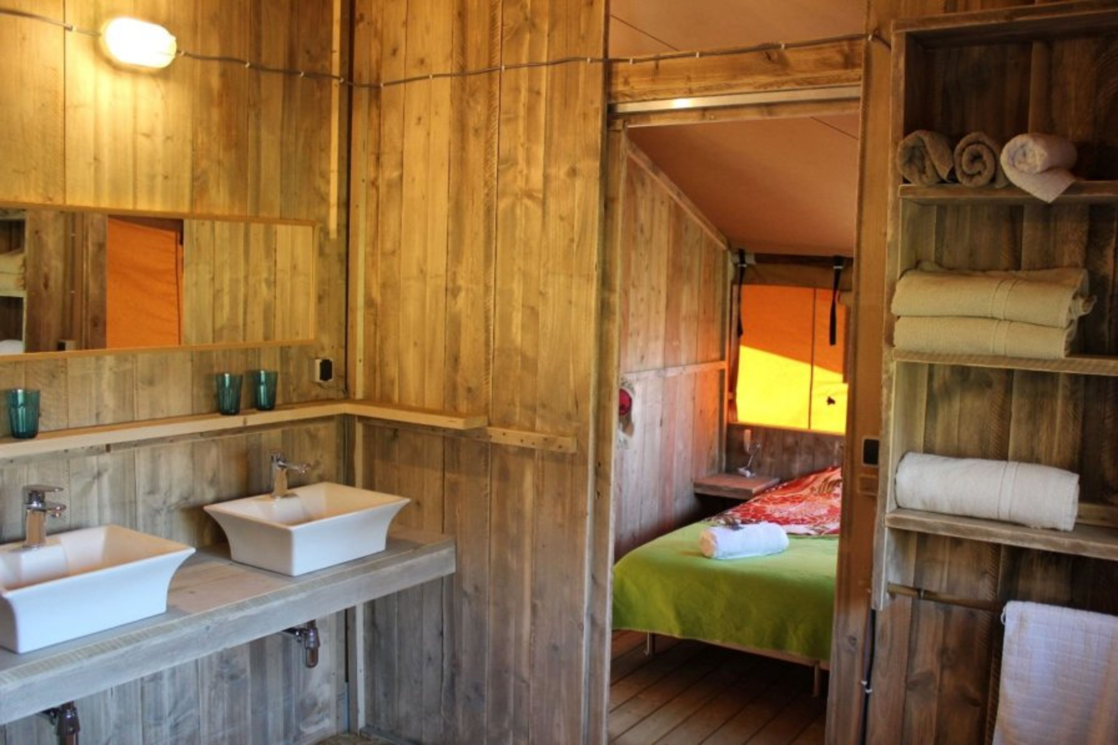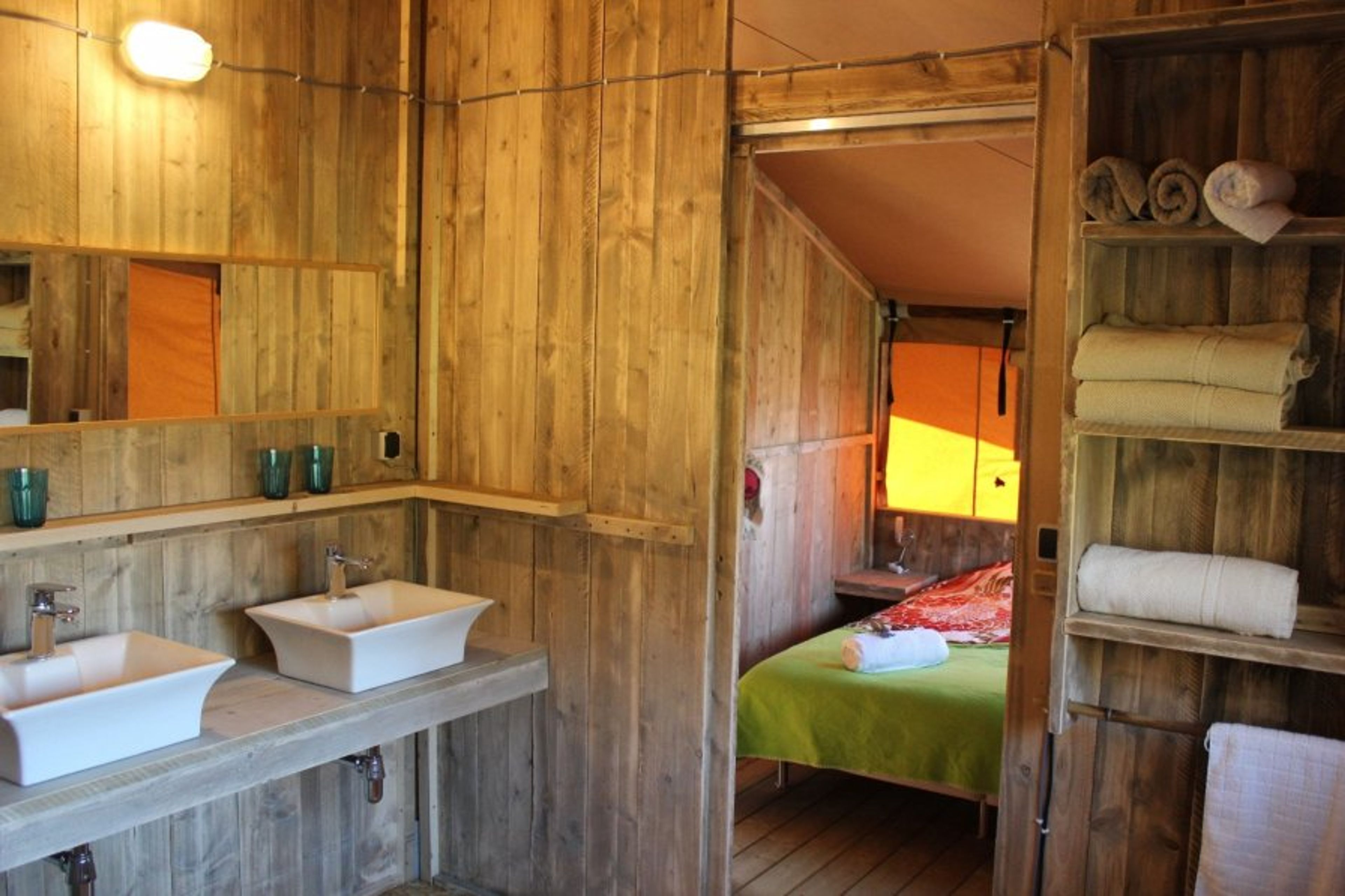 Glamping Ohashi is a sustainable Bedouin-style tent with an integrated kitchen and a luxurious bathroom. From the terrace, you have a beautiful view of the garden with a palm tree and a small pond.