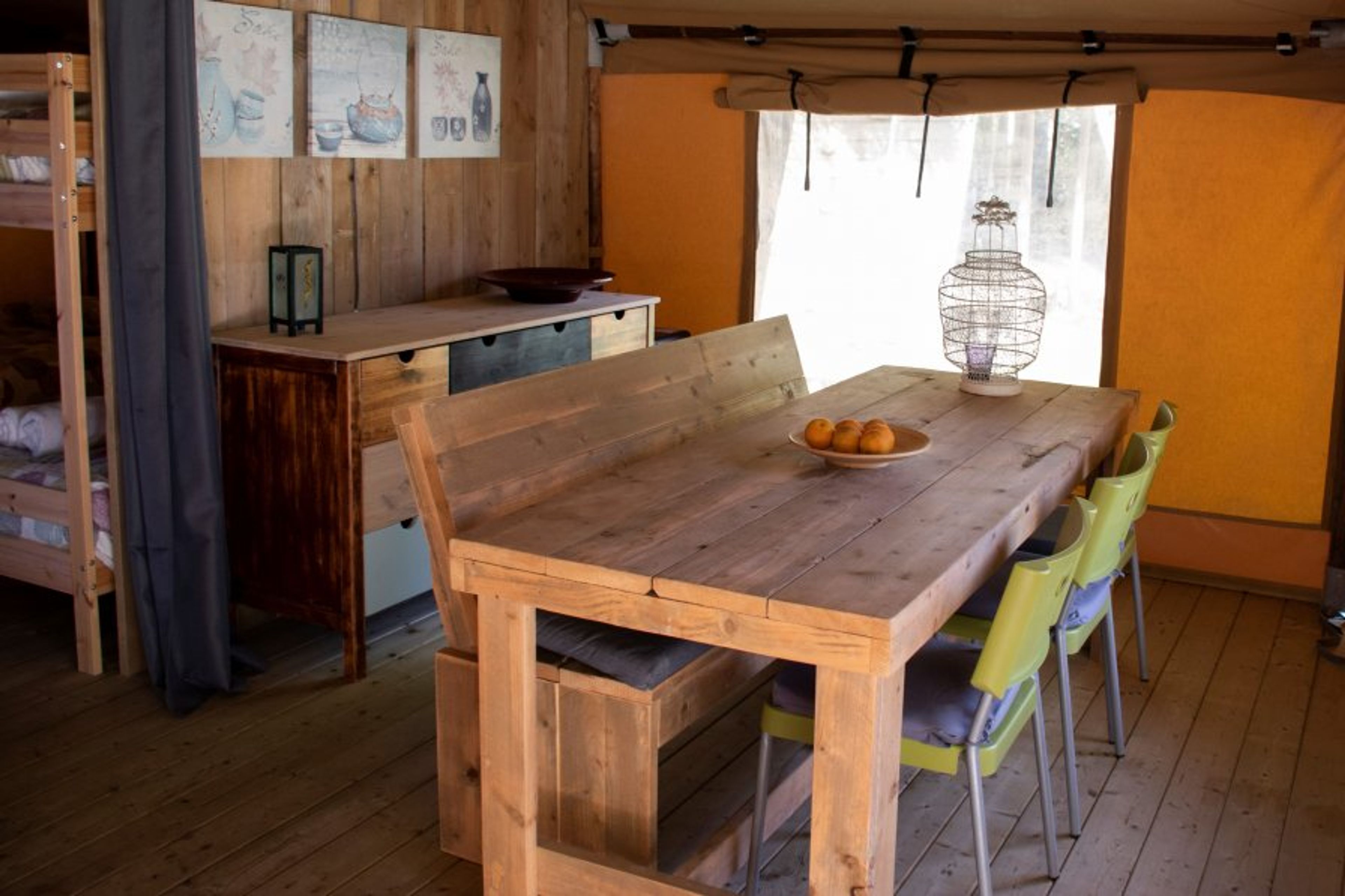 Glamping Ohashi is a luxurious Bedouin-style tent with an integrated kitchen and a deluxe bathroom. The bathroom features a shower, two sinks, and a toilet. This tent offers 2 bedrooms, a spacious living/dining area, and a large furnished terrace. It comfortably accommodates 2 to 6 people. The bathroom is located between the two bedrooms. From the terrace, you'll enjoy a beautiful view of the garden with a pond and koi carps. There is a private entrance and parking space. Maximum occupancy is 7 people (the seventh person is a child who can sleep on the sofa bed or a baby in a camping crib in the master bedroom).This luxurious Bedouin-style tent is situated on the grounds of Quinta Japonesa, right next to the treehouse. It is conveniently located just 100 meters away from the swimming pool. In front of the tent, there is a grassy area for lounging or playing.