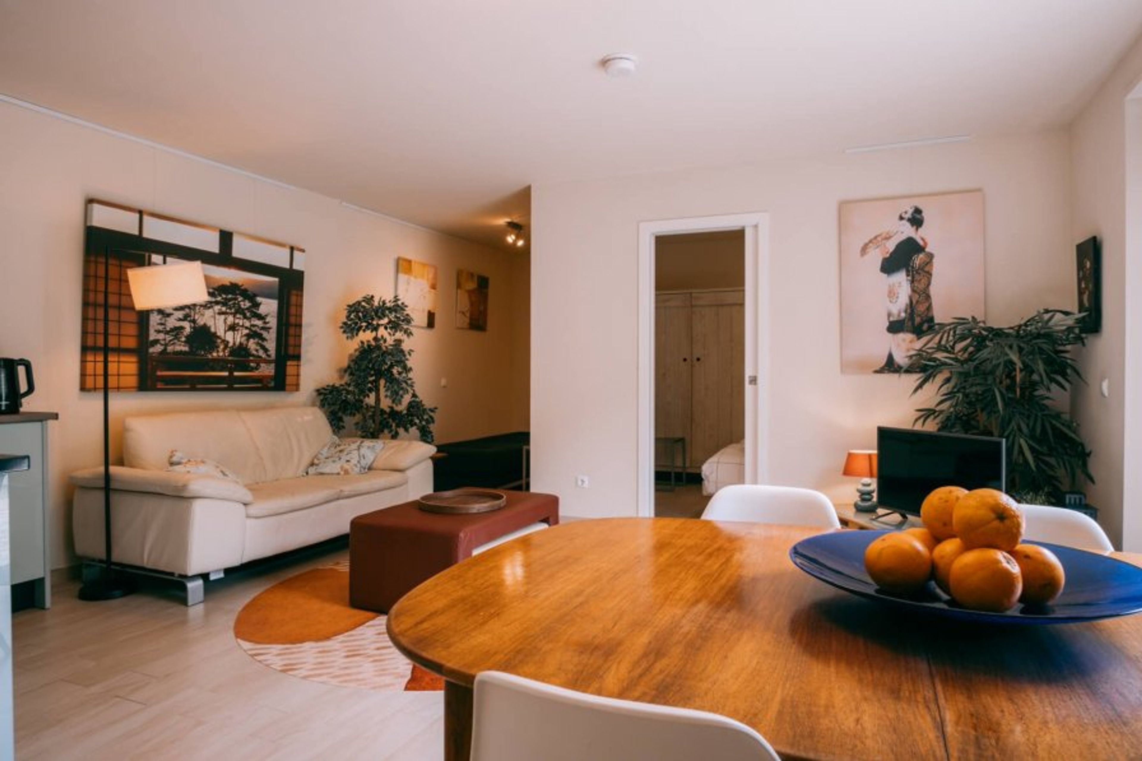 This is a charming holiday cottage with a spacious furnished terrace with its own BBQ and views over the garden. It boasts two comfortable bedrooms. The living room includes a double sofa, a TV, a dining table, a kitchenette, and an extra sofabed in a nook of the living area. This apartment can accommodate up to 5 people. The hotel-style bathroom offers a shower, sink, toilet, and underfloor heating. The entire apartment has comfortable underfloor heating, making it available for rent all year round.