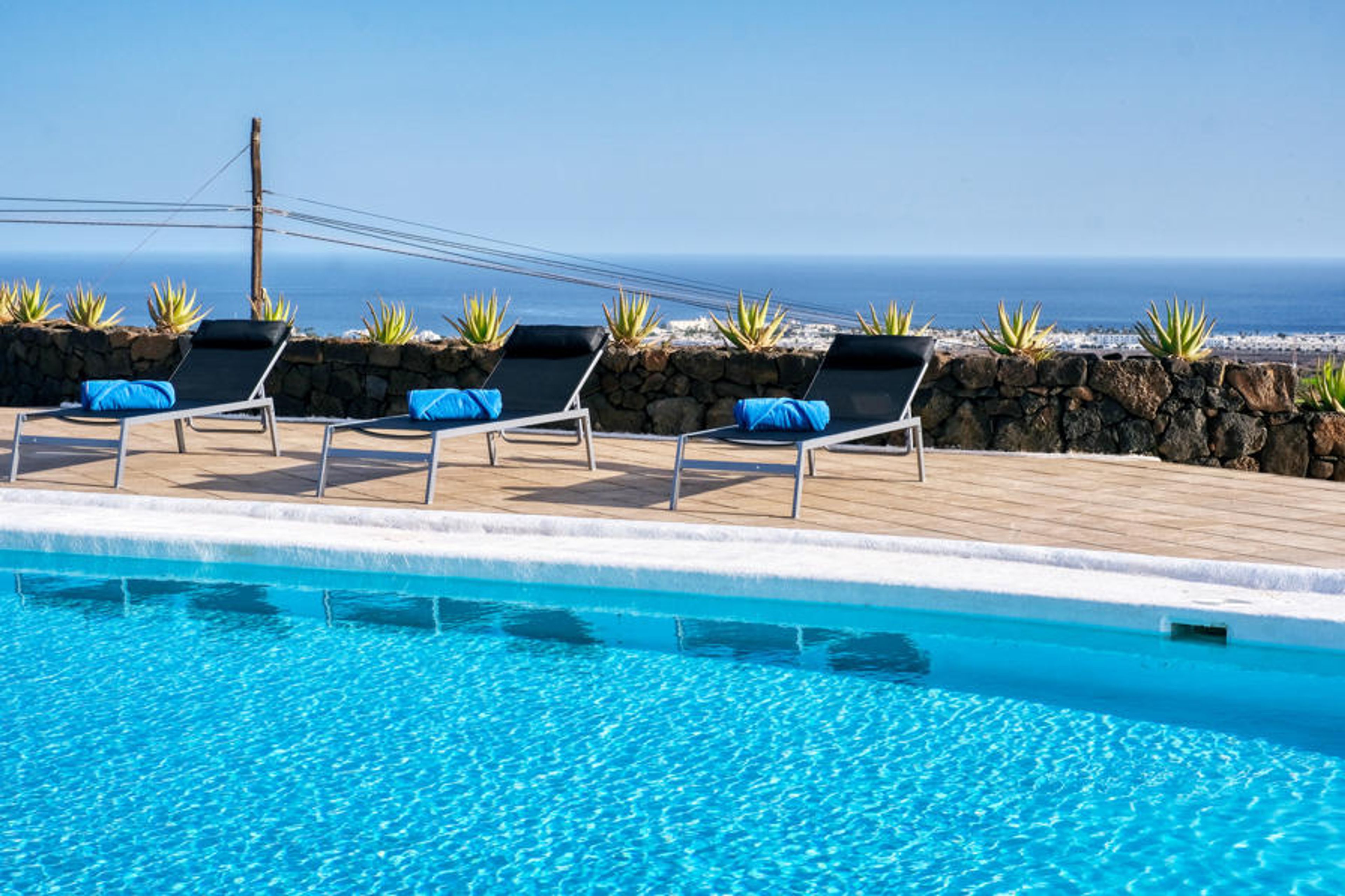 This country house is an impressive property in an area of outstanding beauty. Located opposite a golf club in the proximity of Puerto del Carmen, where you can enjoy great views of the sea, and the islands of Fuerteventura and Lobos. It is just a 10min drive from the airport, and 5 minutes drive to the main avenue of Puerto del Carmen or 5 minutes to the village of Tias. The main beach of Puerto del Carmen is located just 2.5 km from Villa Luciano, and in this area you can also find bars, restauarnts and shops. The property has a large and beautiful open air swimming pool where you can relax while contemplating nice views of the ocean, the golf course on the opposite side of the road or the coastal town nearby. The pool area is equipped with external forniture to dine outside and confortable sunloungers. This is the perfect place to enjoy a long breakfast or lunch under the porch or romantic dinners under the stars. The property surrounding the house is almost 9 acres of elegant design landscape, with many traditional walls built out of volcanic rock, offering great privacy to those customers who require it. You can enjoy nice walks between the many species of fruit trees within the property or a snack under the palm trees with the certainty of not been seen from the outside.The house has three very spacious double bedrooms with their own bathrooms, two of them with showers, and two other double bedrooms with a shared bathroom with a bathtub. You will have a total of 2 bathrooms with bathtubs, two with showers, and a toilet. All rooms are fitted with large in-built wardrobes and have their own independent access to the outside pool porch with espectacular views. Also another extra room is available for personal assistants. The property is also suitable for people with reduced mobility, being most of it accessible on a wheelchair and also one bathroom is adapted for disabled people. The House has also a fully equipped kitchen with 4 hobs, oven, microwave, dishwasher, coffy machine, toaster and complete kitchenware. We provide a set of bath towels and sheets per guest plus pool towels. A cot is available on request. You can easily park near the house entrance , the parking is exterior and prívate. This property offers a unique experience with amazing sea views,peaceful enviroment and a lot of indoor and outdoor space for big groups or families.