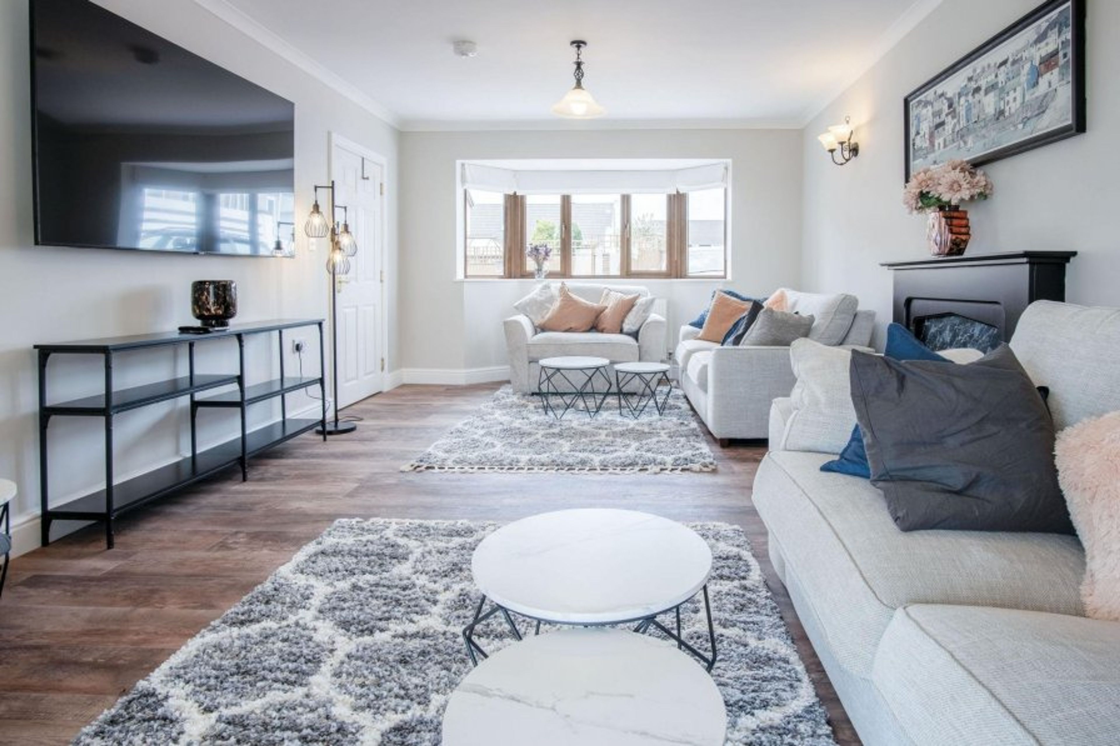Step into the grand hallway of Highfield, where on the left, the inviting living room awaits, furnished with plush seating in front of a generous 75" TV for ultimate relaxation. Continue through to the elegant conservatory, offering additional seating and French doors that open to the enchanting garden area. Here, guests can enjoy outdoor seating, a BBQ, pizza oven, and breathtaking views of fields, the estuary, and the castle.