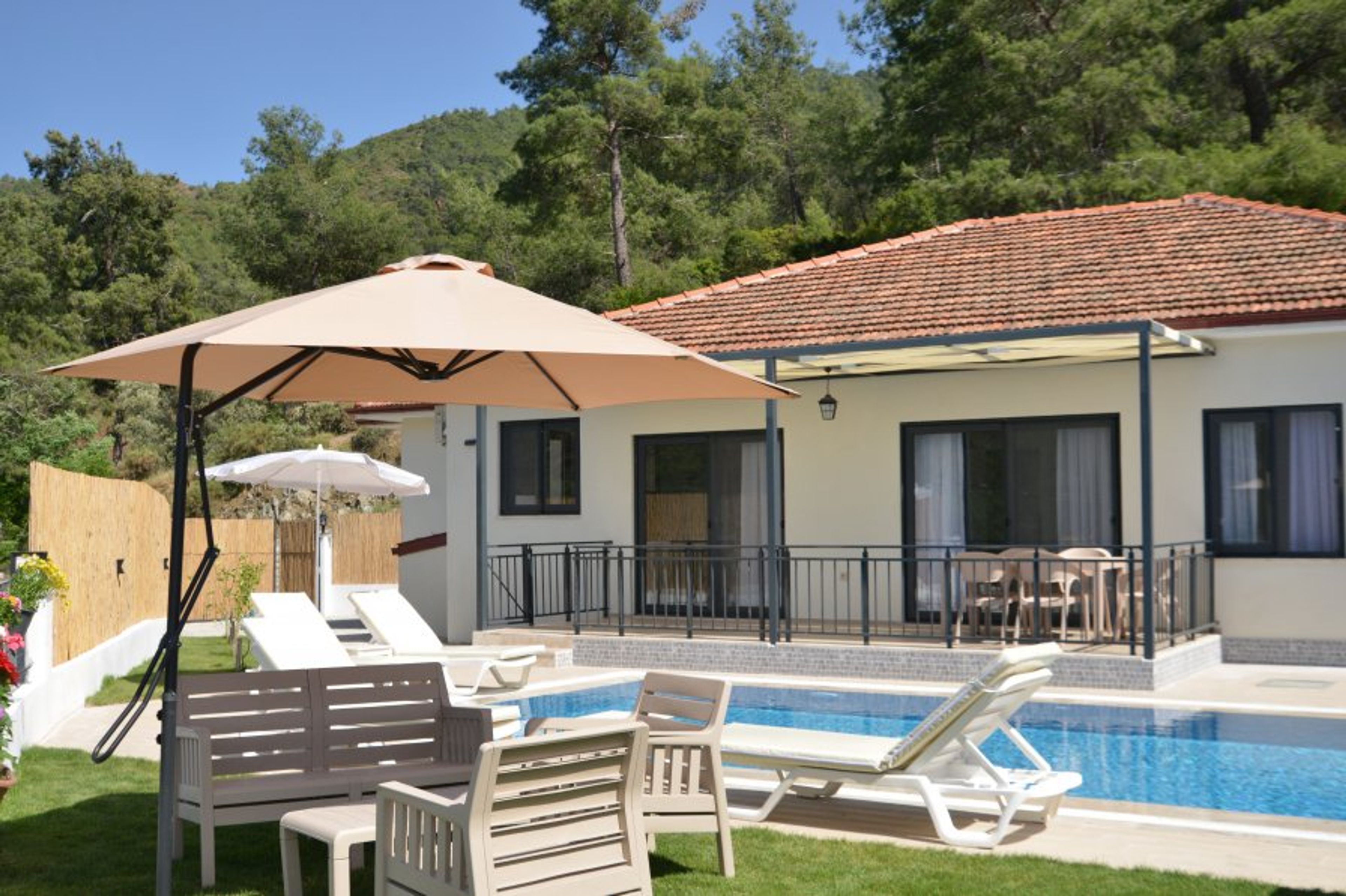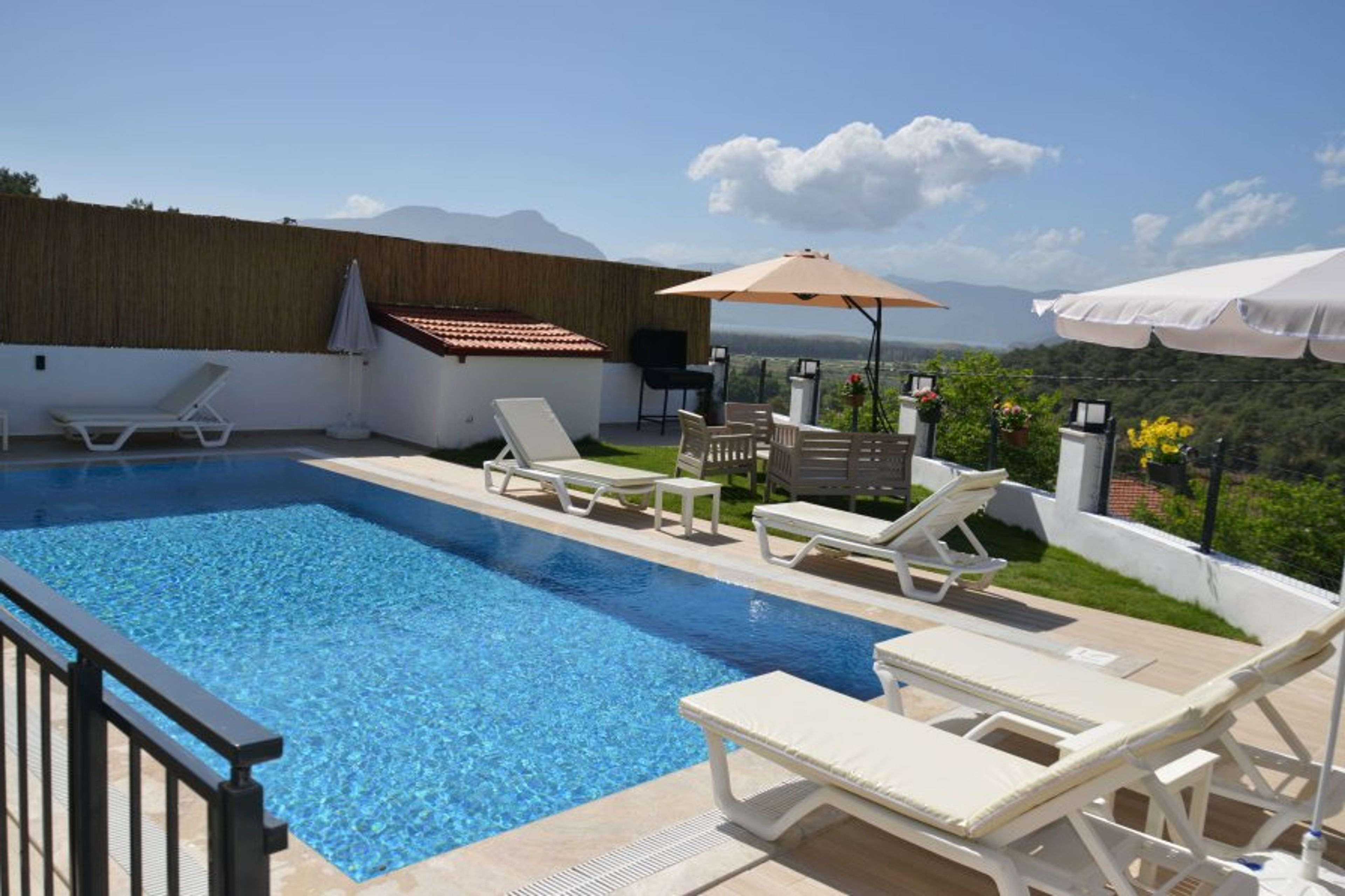 A happy holiday awaits you in nature and peace, accompanied by a lake view. You can take a walk in the forest with a lake view and relax with clean oxygen. Enjoy outdoor living when you step outside on your private patio. The highlight of the villa is undoubtedly its inviting pool, where you can take refreshing dips under the Turkish sun or relax on the sun loungers while sipping your favorite cocktail. Surrounded by lush greenery, the beautifully landscaped garden offers a tranquil setting for alfresco dining, barbecue parties or relaxing amidst Dalyan's natural beauty.