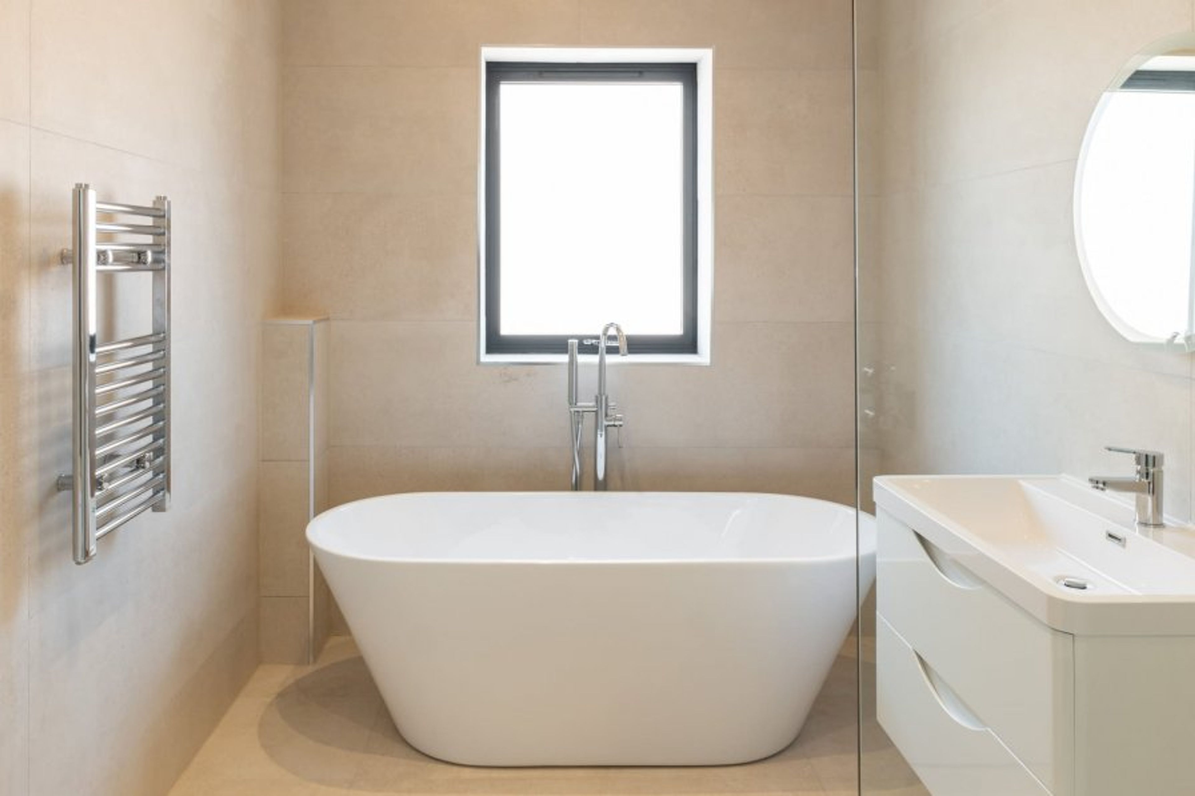 The second family bathroom is also on the top floor with a free standing bathtub, a separate walk-in shower, and a WC.