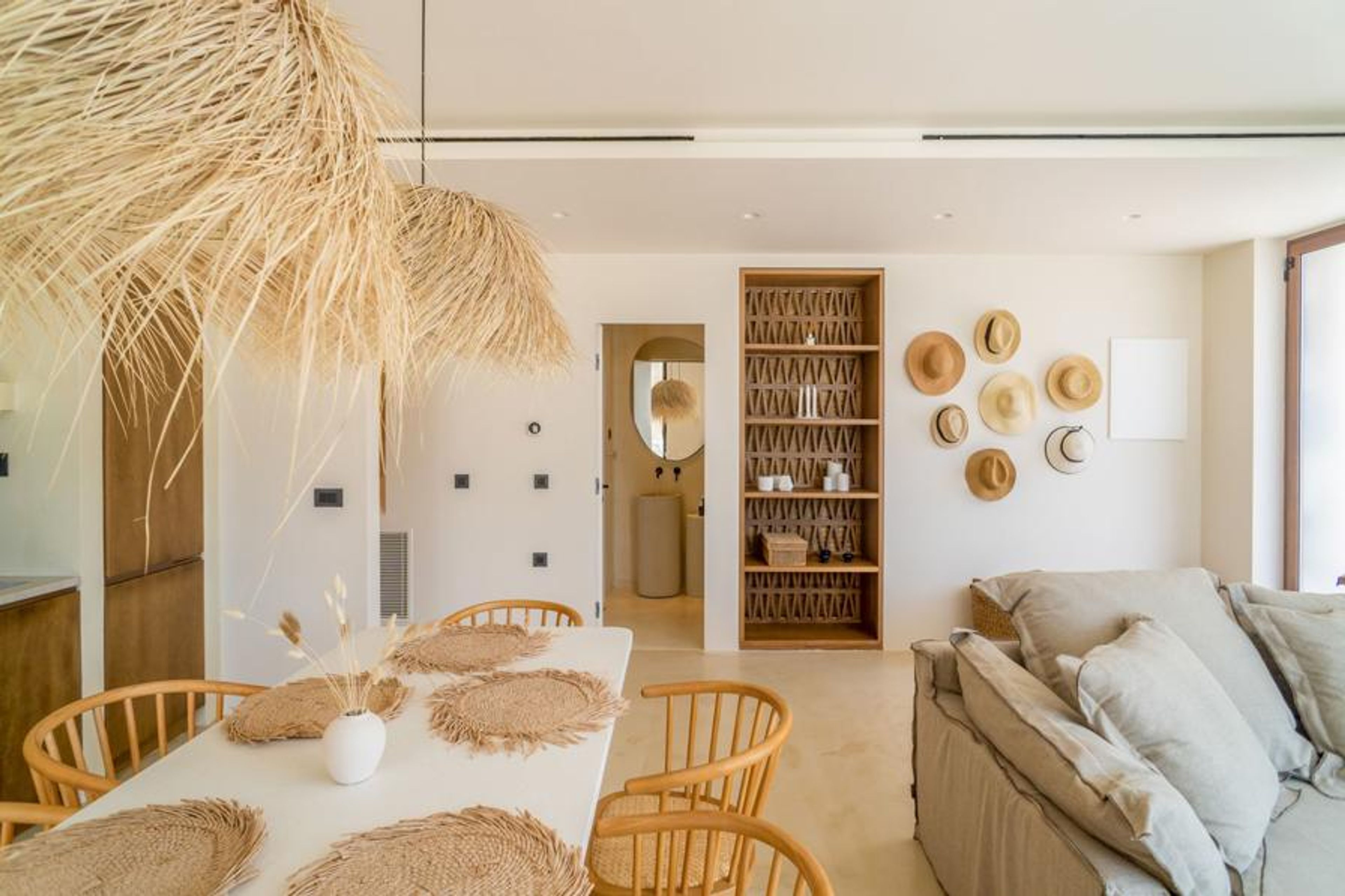 Upon entering the villa, you are greeted by an open-plan living area that exudes a welcoming and homely atmosphere. The living room, bathed in natural light from the impressive corner window, offers a comfortable space to unwind and take in the panoramic sea views. The fully equipped open kitchen and dining area invite you to enjoy meals together, whether you’re preparing a quick breakfast before heading to the beach or a leisurely dinner with local delicacies.
