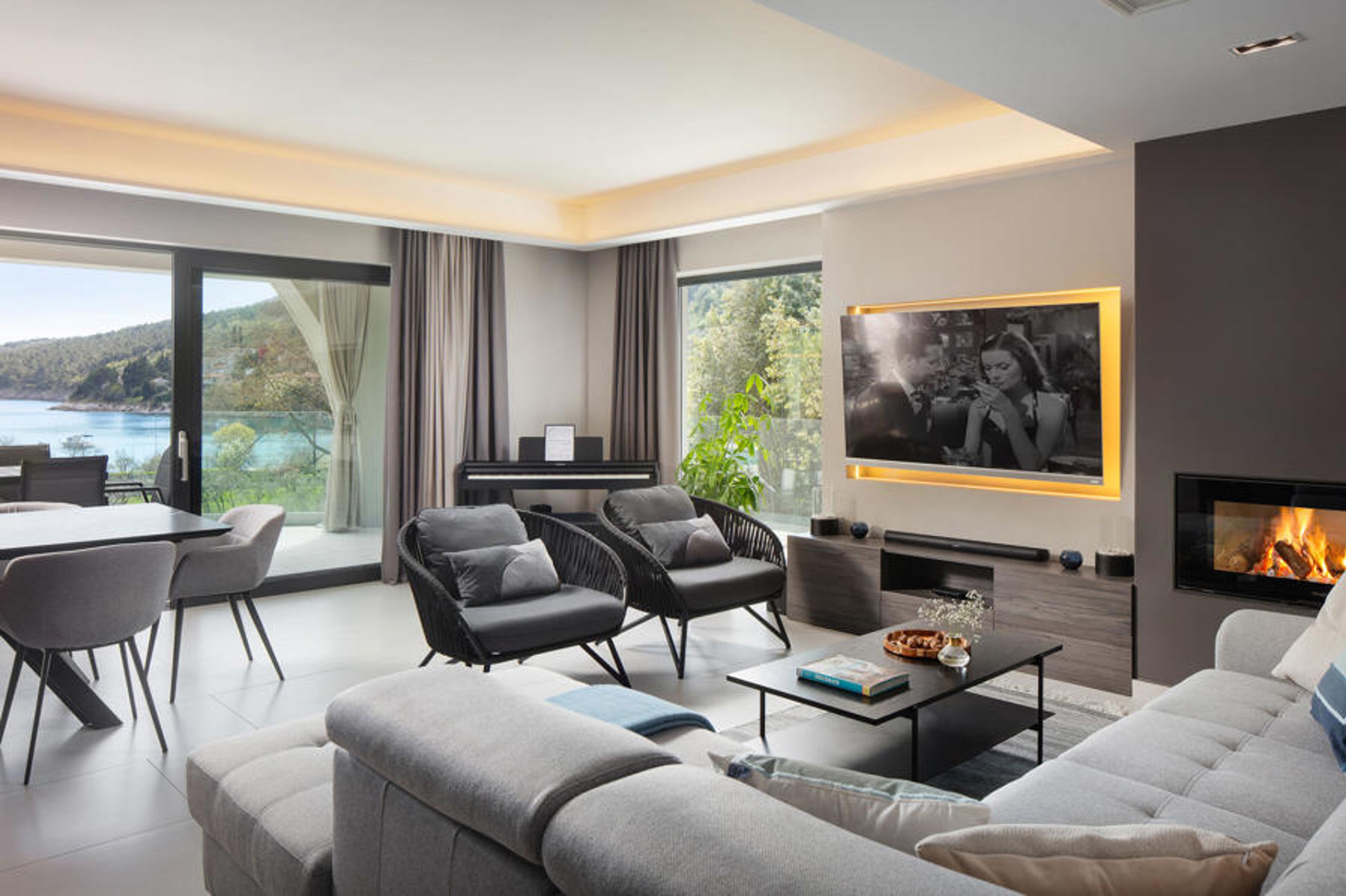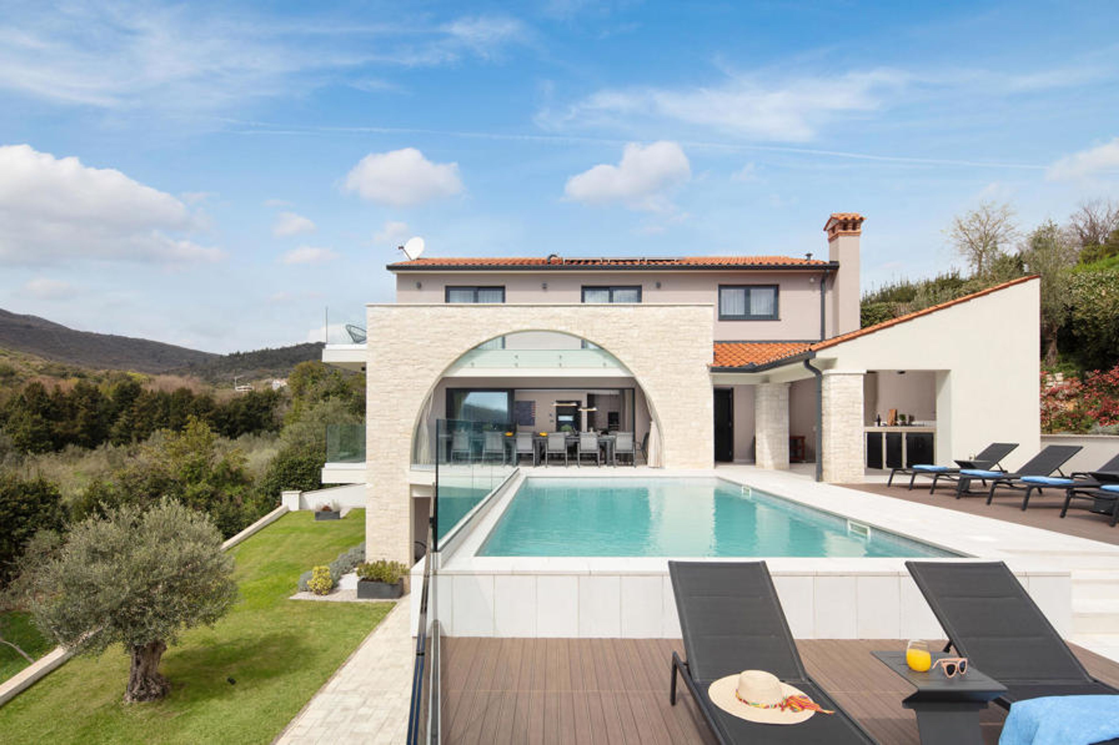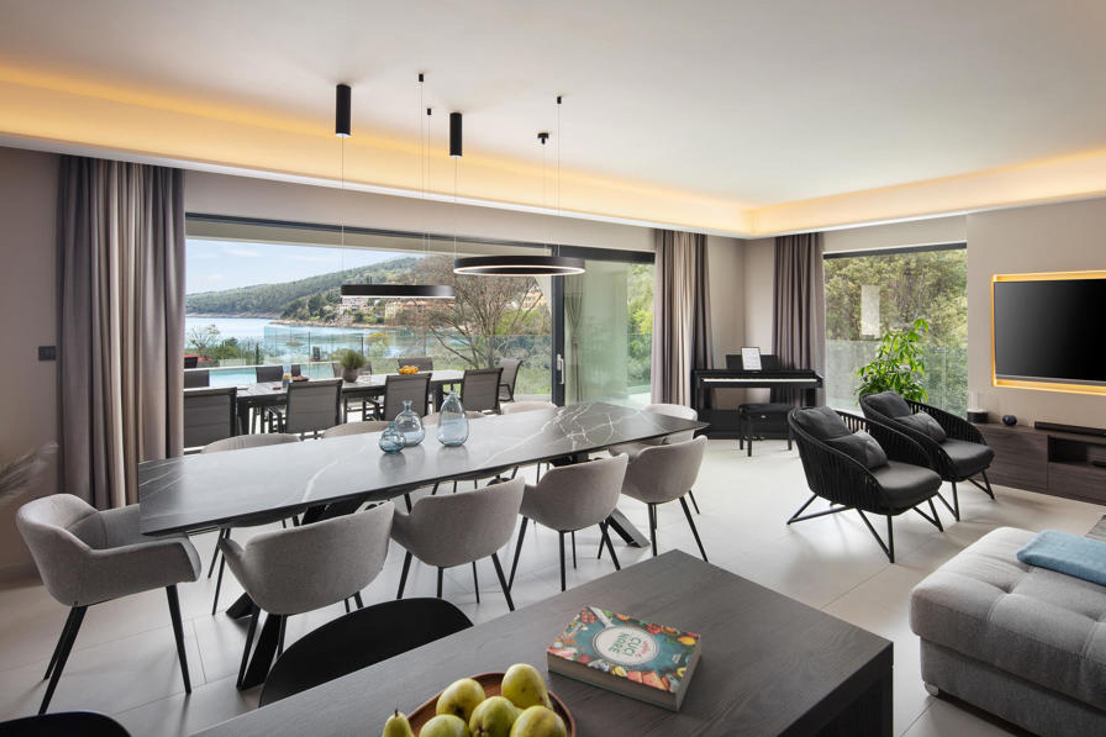 This modern house in Sveta Marina welcomes you with a fantastic location right by the sea. Arrive at this modern villa in a beautiful location right by the sea.