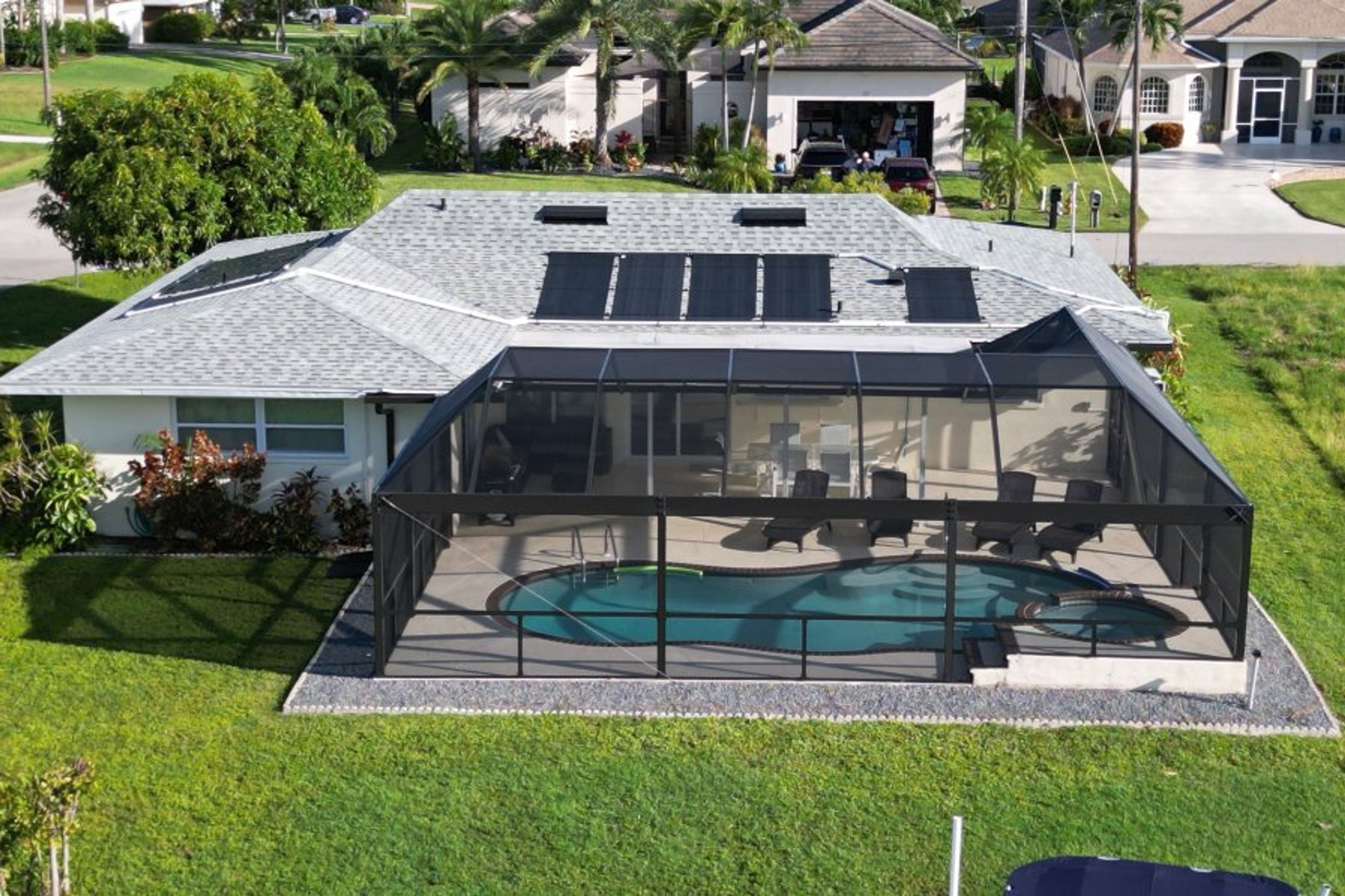 Villa Sea shells, location,location,location.This beautiful , waterfront villa home, situated close to Tarpon Point Marina, has direct sailboat access and is 10 minutes to the main river. Fish off your own private dock or explore the nearby islands of Sanibel and captiva in your own 23ft sportsboat.The villa has three double bedrooms. The master has a king-size bed with en-suite. Two further bedrooms, one with a queen bed and the third has two single beds. All have cable television. For the comfort of guests, the villa is fully air conditioned and also has ceiling fans, inside and out. The dining room leads directly onto the patio, where you will find plenty of patio furniture to enjoy outside dining. Or simply relax in the spa or pool with a cocktail.