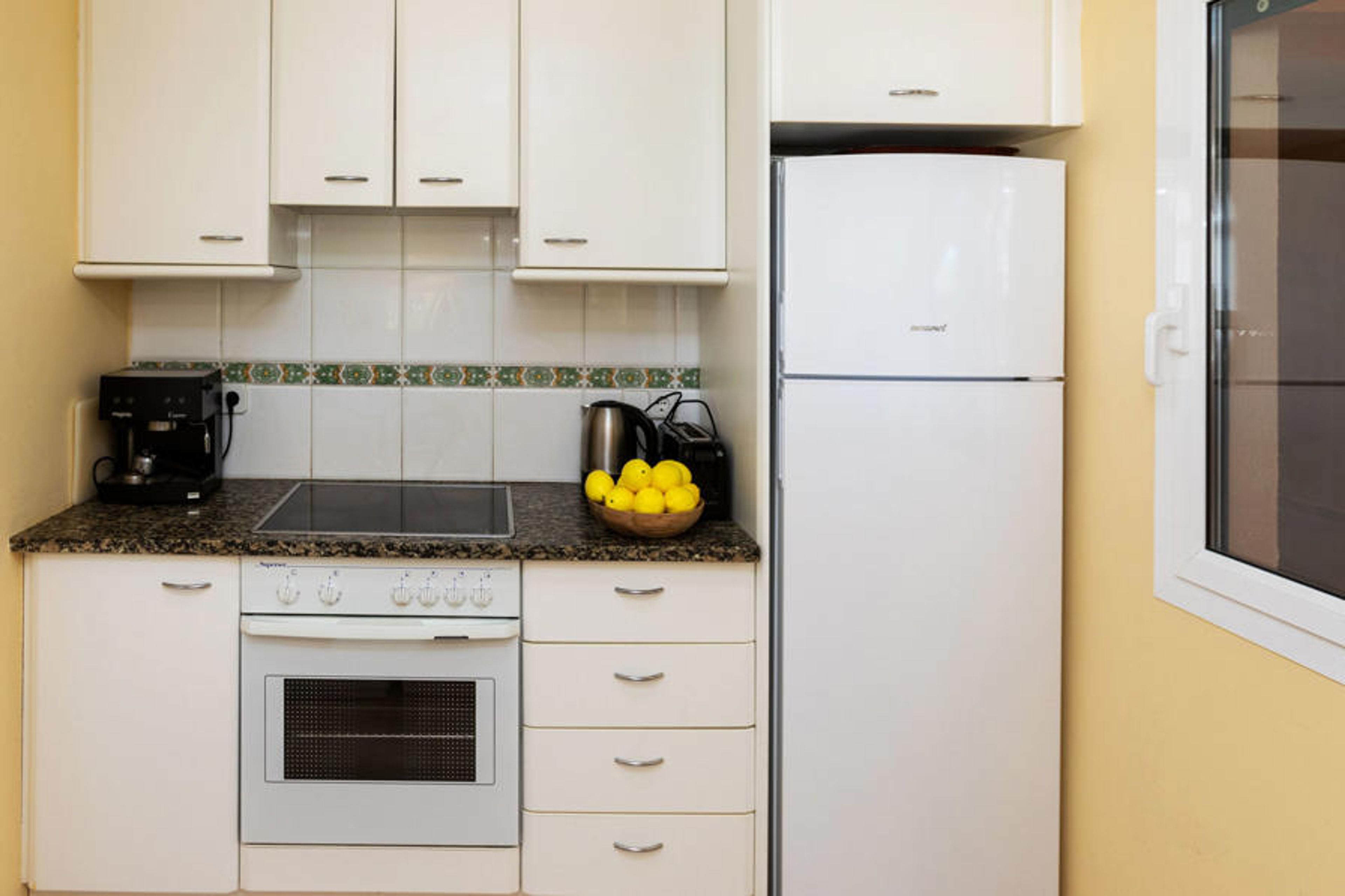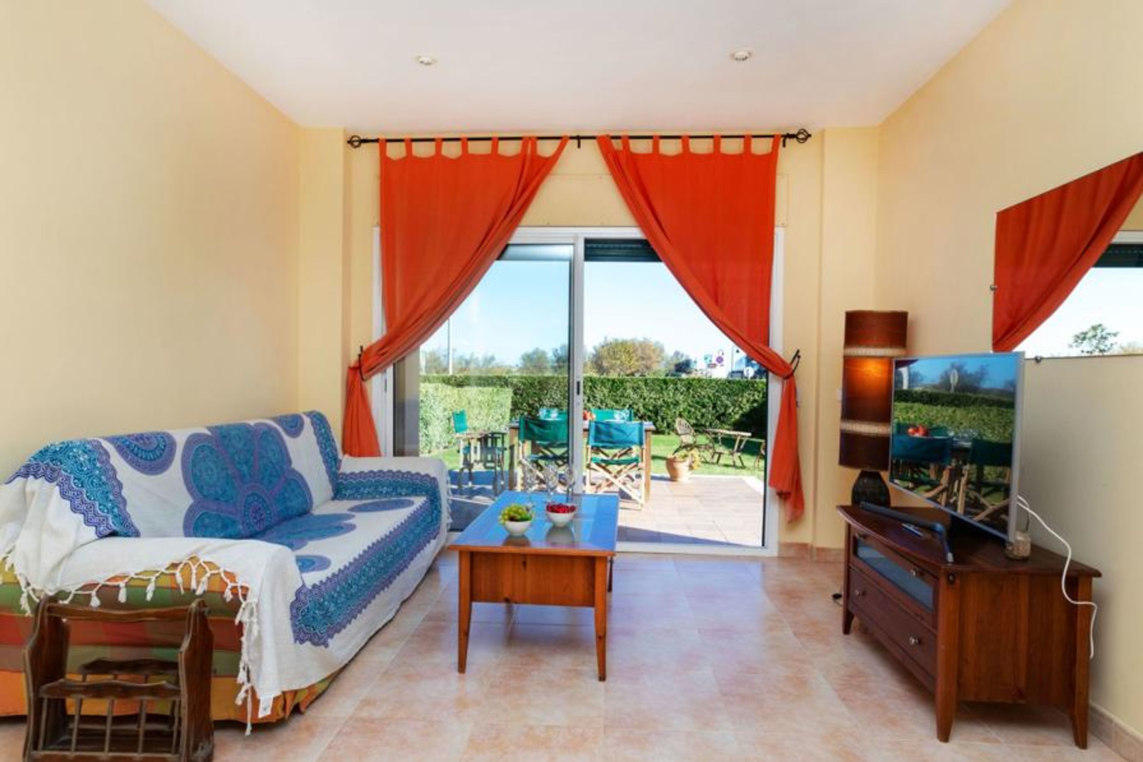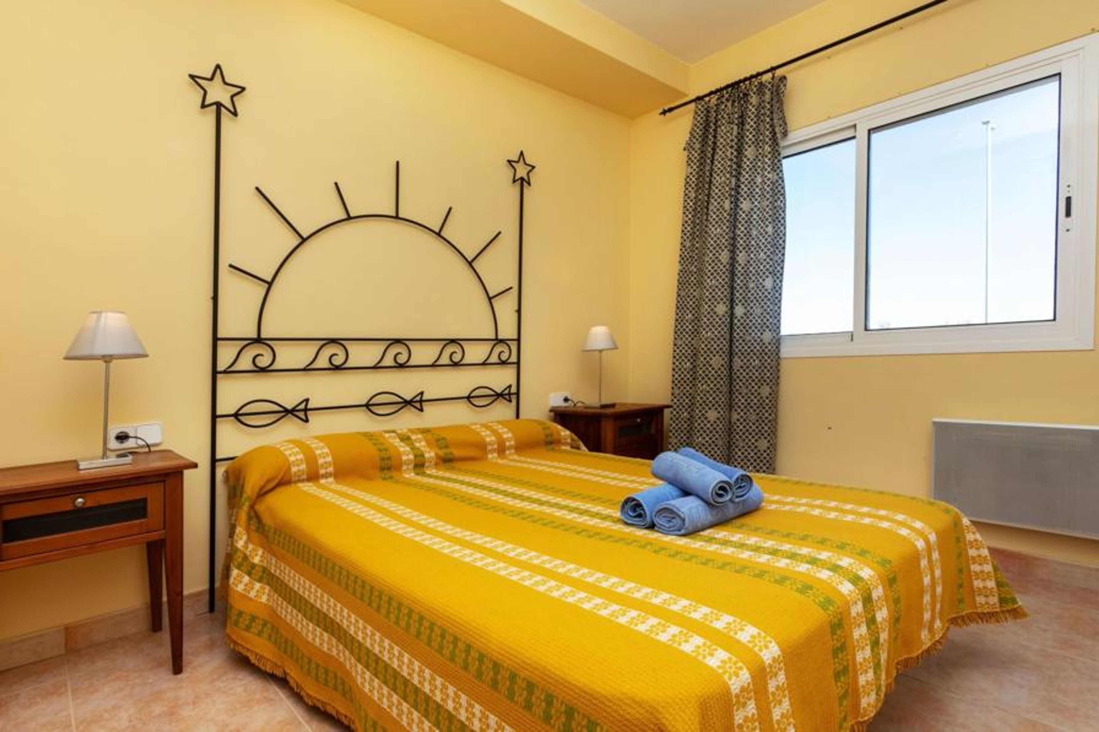 "Port Pals family terrace & garden", 4-room apartment 95 m2, on the ground floor. Practical furnishings: living/dining room with digital TV and electric heating. Exit to the patio. 1 room with 1 french bed (135 cm, length 190 cm). 1 room with 1 french bed (140 cm, length 200 cm), bath/WC. 1 room with 1 x 2 bunk beds (90 cm, length 190 cm). Open kitchen (oven, dishwasher, 4 ceramic glass hob hotplates, toaster, kettle, microwave, freezer, grill, electric coffee machine). Bath/WC. Electric heating. Patio. Terrace furniture, deck chairs, covered balcony. Distant view of the sea and the countryside. Facilities: washing machine, iron, children's high chair, baby cot, hair dryer. Internet (WiFi, free). Please note: suitable for families. TV only ES. HUTG-016573 // Reg. Nr.: ESFCTU00001700700024735000000000000000000HUTG-0165733