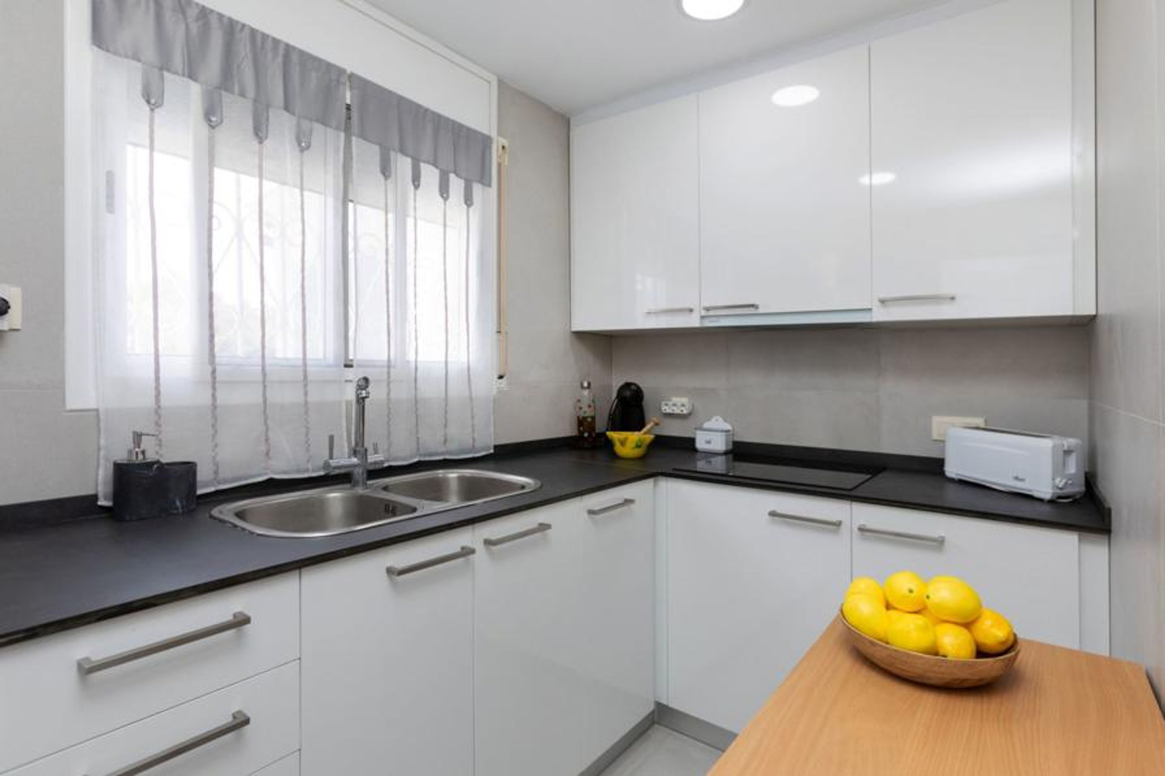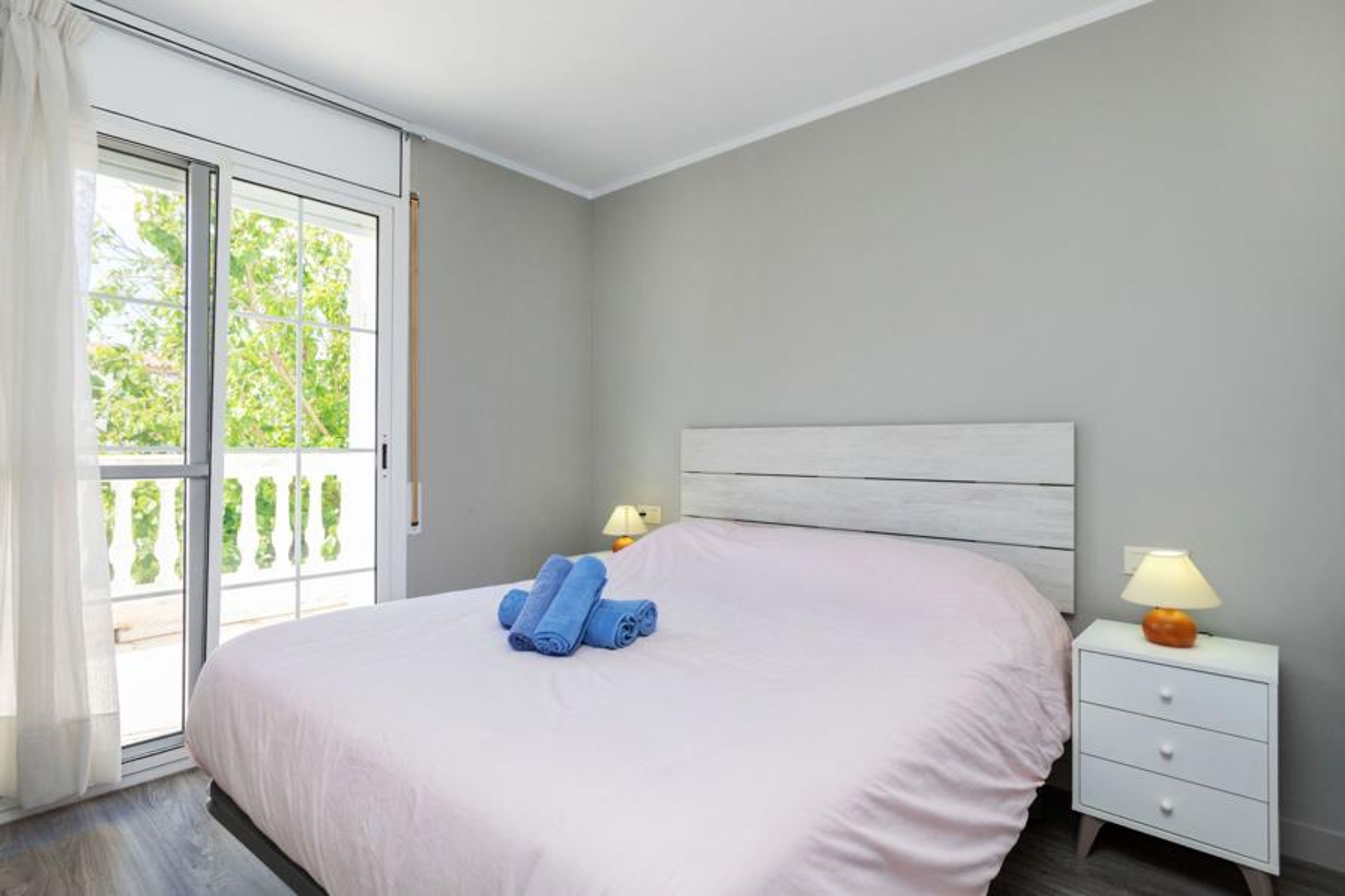 "Yoli", 4-room terraced house 90 m2 on 2 levels. Comfortable and cosy furnishings: living/dining room with dining table, digital TV and air conditioning. Exit to the patio. 1 room with 1 french bed (135 cm, length 190 cm). Kitchen (3 ceramic glass hob hotplates, toaster, kettle, microwave, electric coffee machine). Shower/WC. Upper floor: 1 room with 1 bed (90 cm, length 190 cm), 1 french bed (135 cm, length 190 cm). 1 room with 1 french bed (150 cm, length 190 cm), digital TV. Exit to the balcony. Interconnecting room with air conditioning. Exit to the balcony. Shower/WC. Small balcony 5 m2, large terrace 30 m2. Terrace furniture, barbecue. View of the swimming pool. Facilities: washing machine, iron, baby cot for up to 2 year olds, hair dryer. Internet (WiFi, free). Parking at the house. Please note: maximum 1 pet/ dog allowed. TV only ES. HUTT-005832 // Reg. Nr.: ESFCTU00004303200006896900000000000000000HUTT-0058326