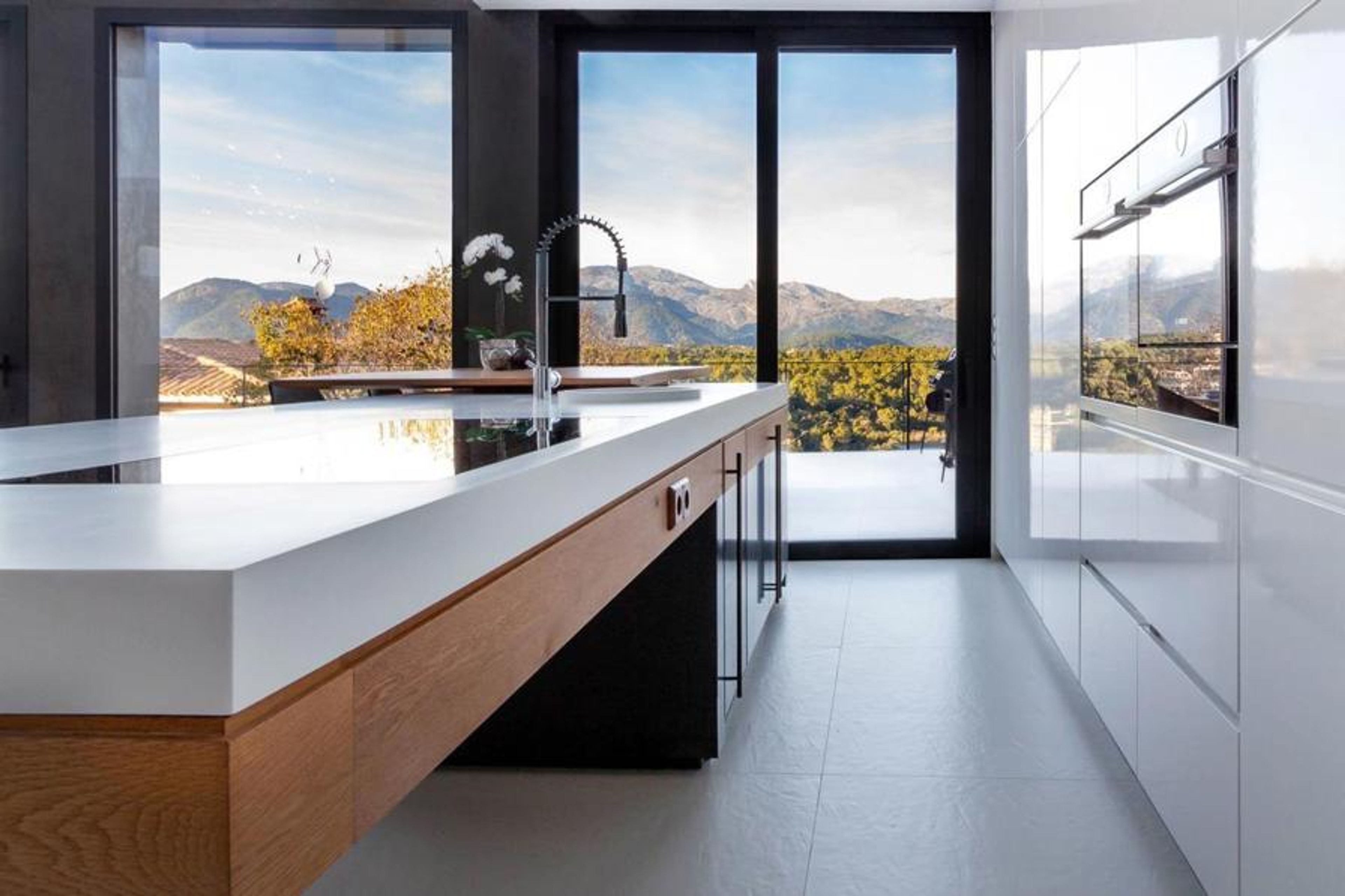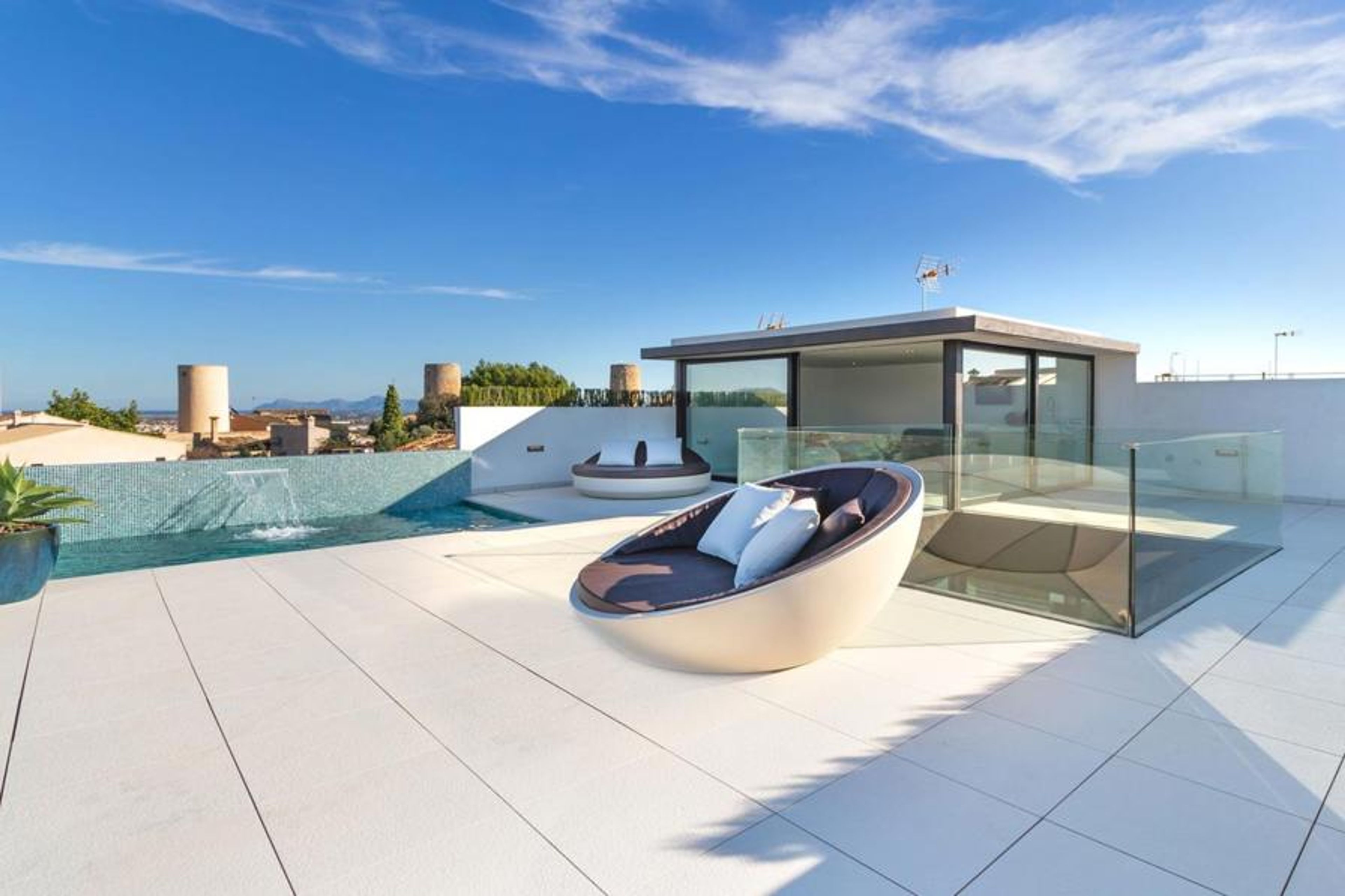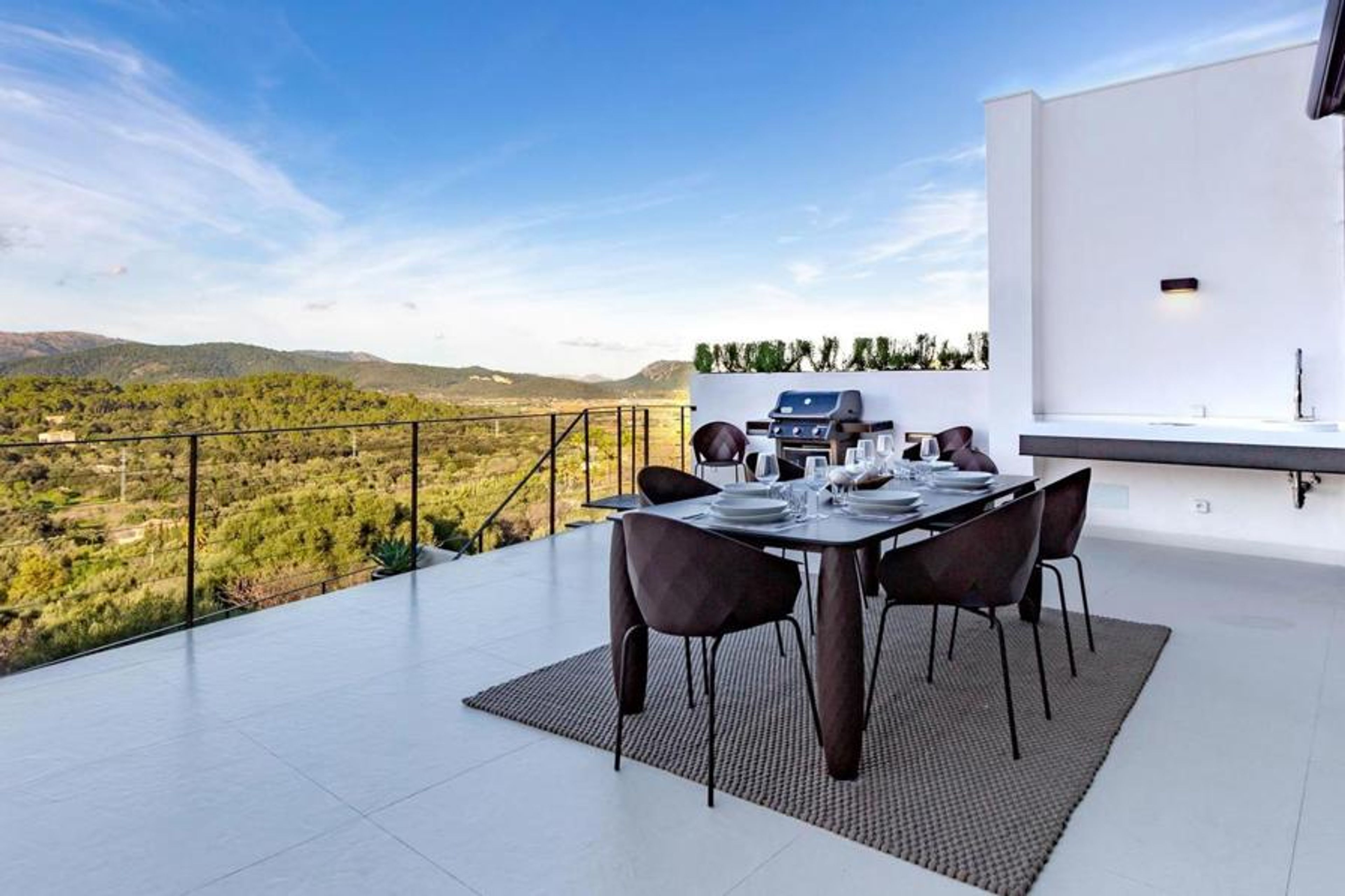 Búger: Large, modern, luxurious villa "Montblau", renovated in 2018. In the centre of Búger, in a quiet, sunny position, 15 km from the sea. Private: property 600 m2, swimming pool angular (5 x 3 m, seasonal availability: 01.Mar. - 31.Oct.). Outdoor shower, pergola, terrace, garden furniture, barbecue. In the house: internet access, WiFi, solarium, hot tub, central heating system, air conditioning, washing machine. Public parking on the road. Shop, restaurant 100 m, bus stop "Buger" 190 m, sandy beach 15 km. Please note: car recommended. Suitable for families, suitable for seniors baby equipment on request (included). Object suitable for 9 adults. The owner does not accept any youth groups. Airfield 40 km from the property.