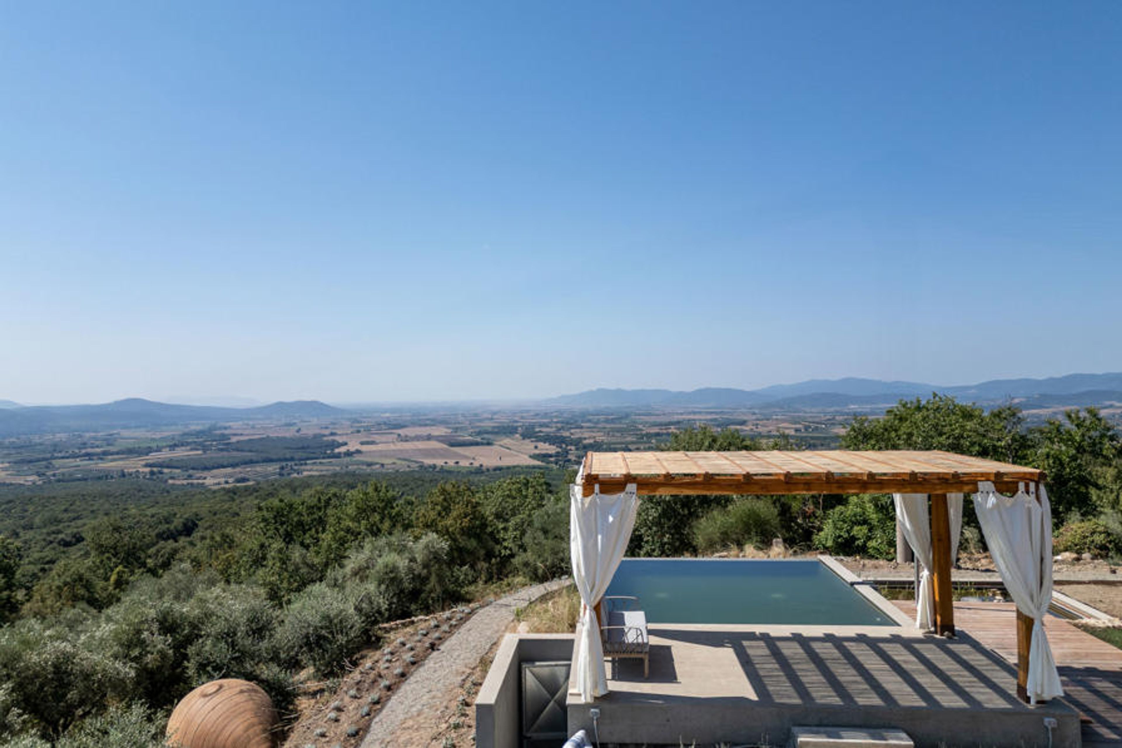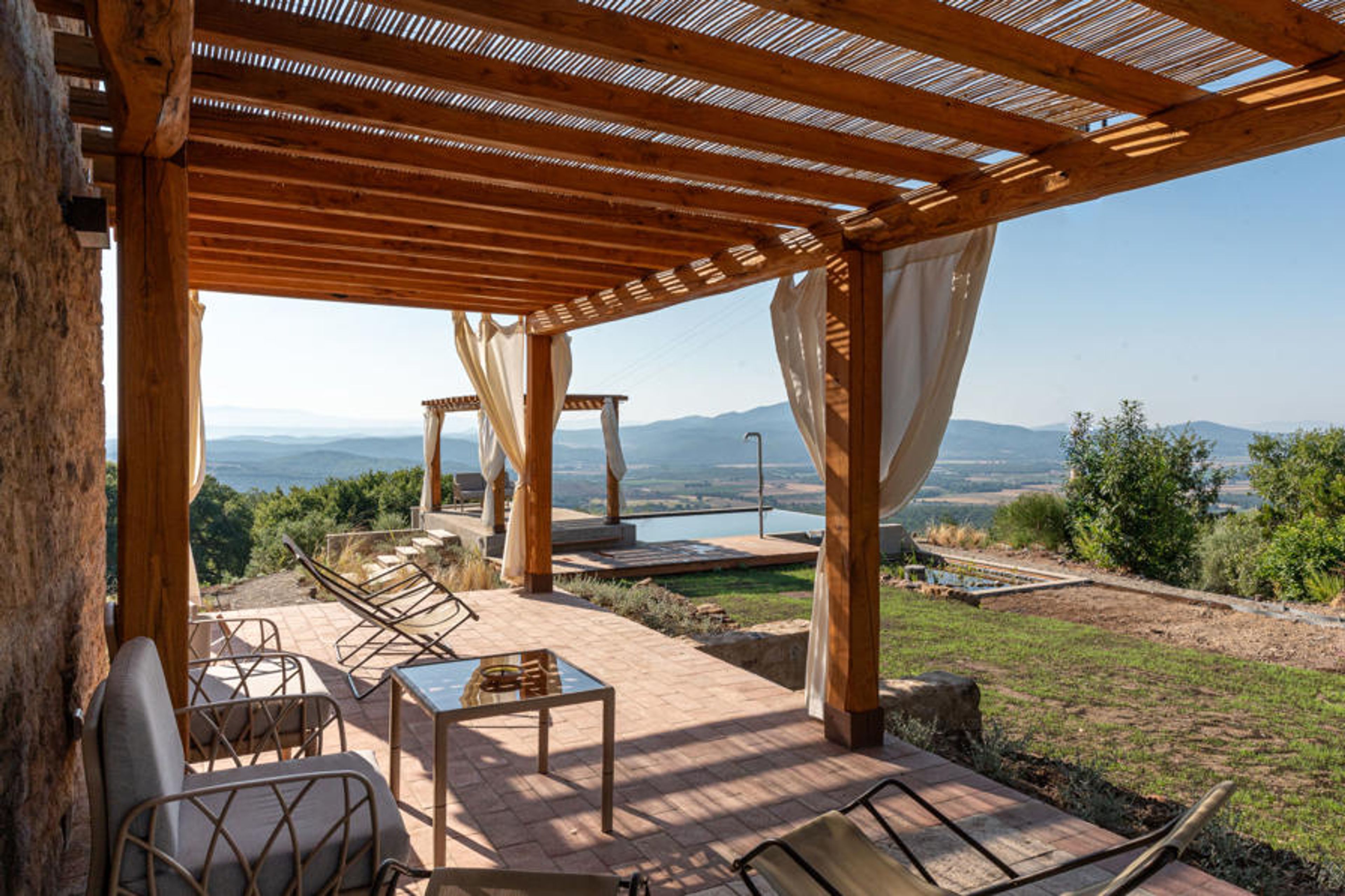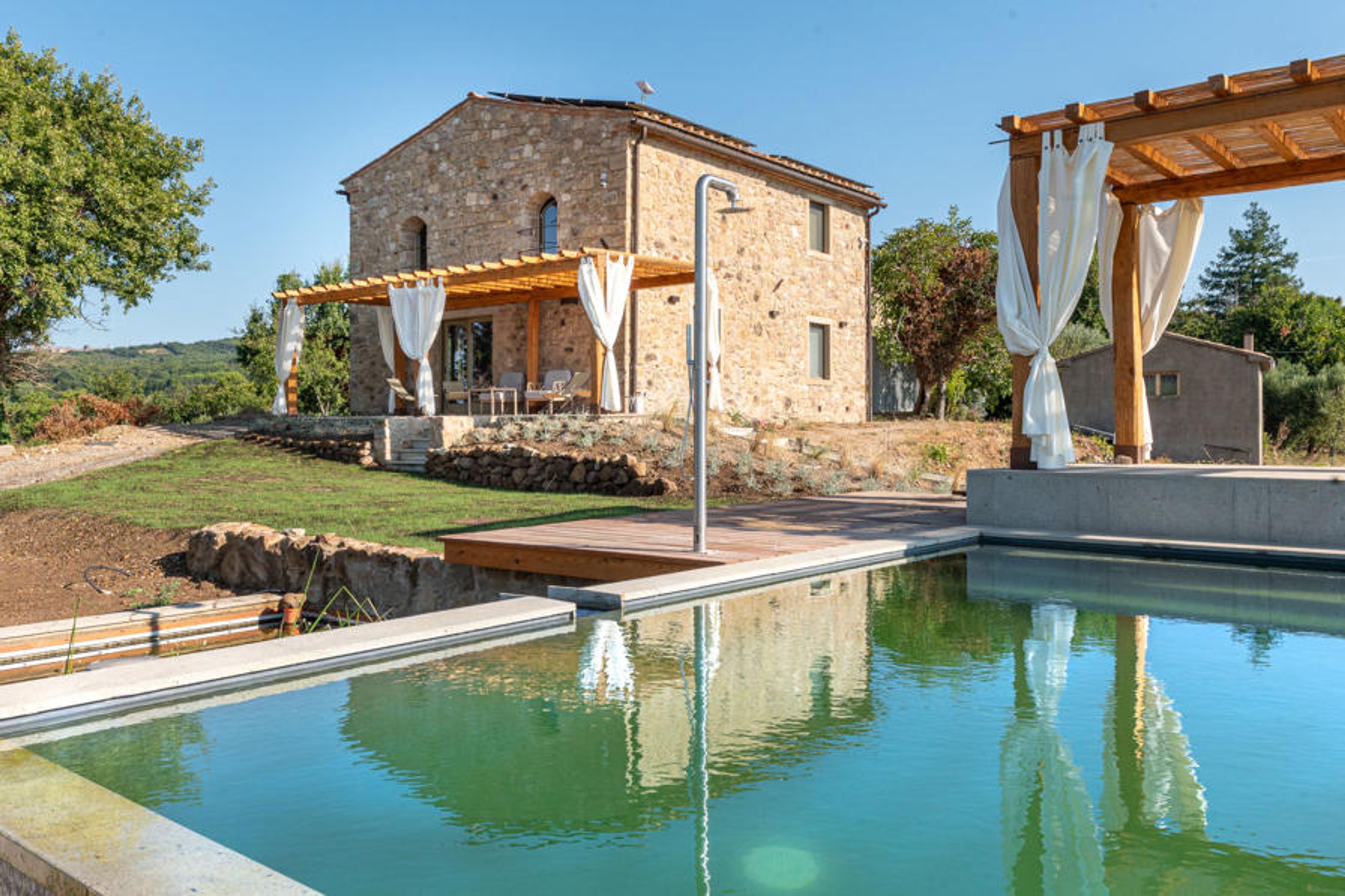 An ancient villa that has just been renovated with great care, using valuable organic and reclaimed materials, eco-sustainable and highly energy-efficient. Surrounded by nature, in a unique panoramic position. Very modern, beautiful, comfortable house "Oasi di benessere Bio", 2 storeys, renovated in 2024. 4 km from the centre of Sassofortino, in a secluded, quiet position on top of a hill, 50 m from the edge of the forest, 37 km from the sea, 37 km from the beach, in the countryside. Pool maintenance by the owner/gardener. Private: beautiful garden to relax, swimming pool (40 m2, depth 140 cm, seasonal availability: 15.May. - 30.Sep.). Outdoor shower, nat. Swimm. Pond, barbecue. 800 m long very bumpy, narrow motor access (via unmade road). Parking at the house. E-charging station. Shop 4 km, grocery 4 km, supermarket 4 km, restaurant 4 km, bar 4 km, bakery 4 km, sandy beach "Castiglione della Pescaia" 40 km, thermal baths "Terme di Petriolo" 35 km. Golf course (18 hole) 28 km, walking paths from the house 10 m. Nearby attractions: Roccastrada 13 km, Montemassi 7 km, Cala Violina 38 km, Grosseto 30 km, Massa Marittima 30 km, I Canaloni del Farma 26 km. Please note: car recommended. Guarded residence.
